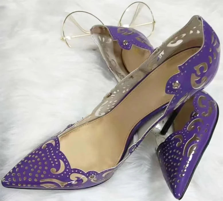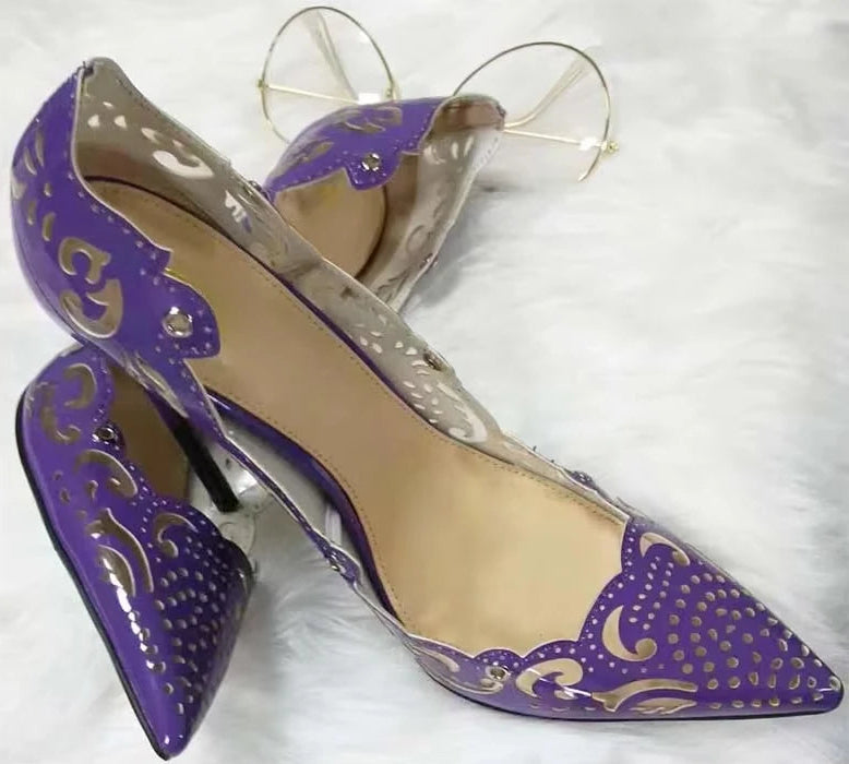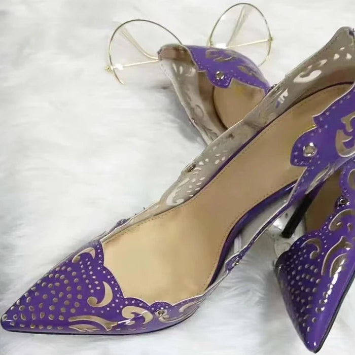 Women's Purple Leather Carved Flowers High Heels Lace-up Pointed Toe Pumps