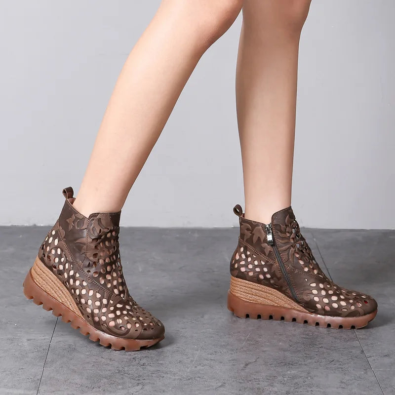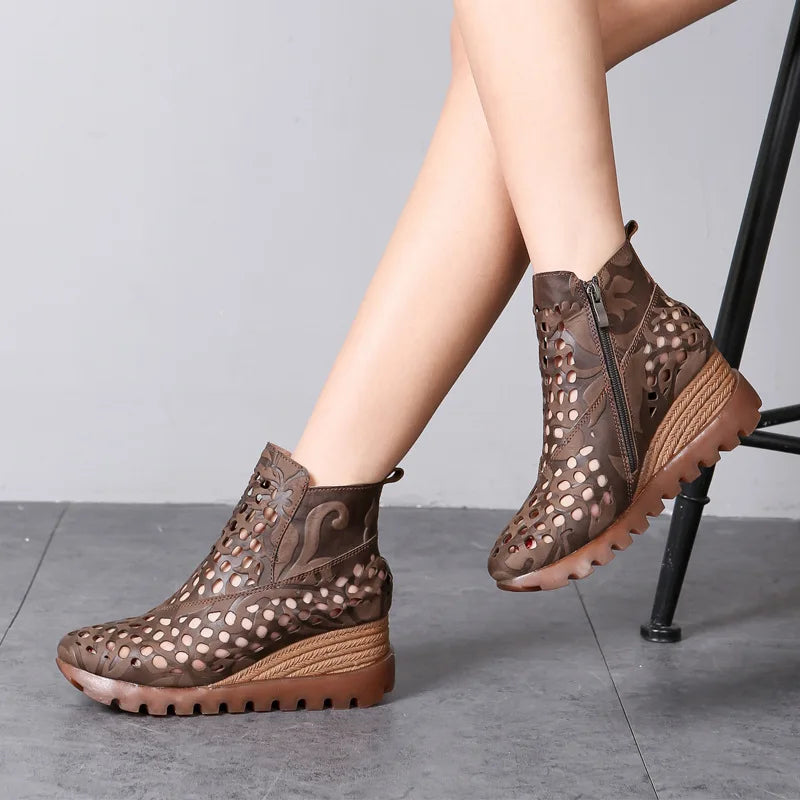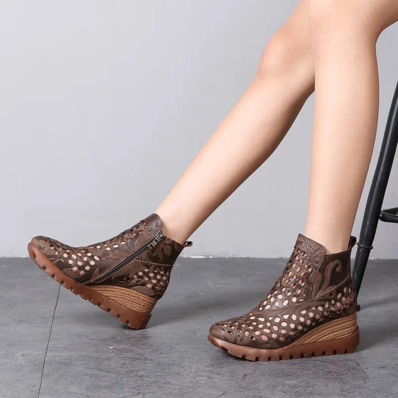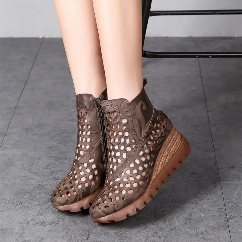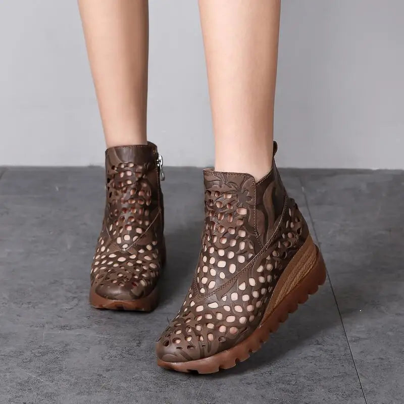 Women's Top Layer Cowhide Side Zipper Platform Wedge Hollow Out Casual Shoes