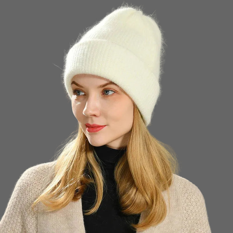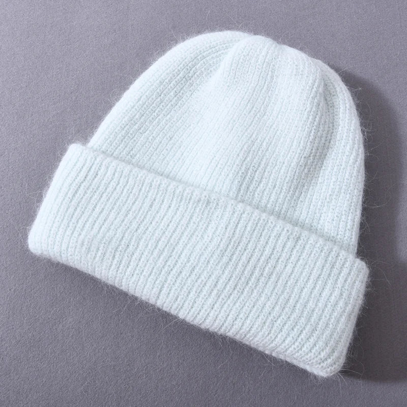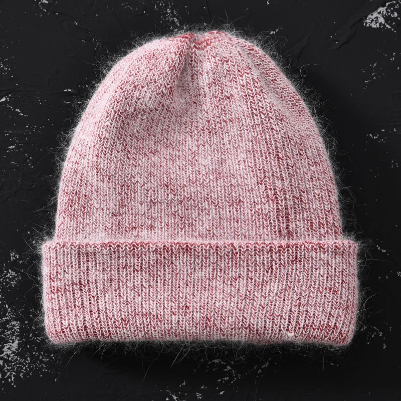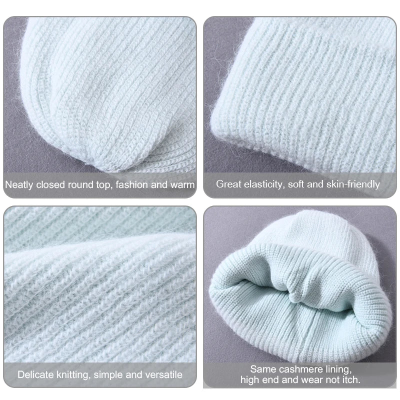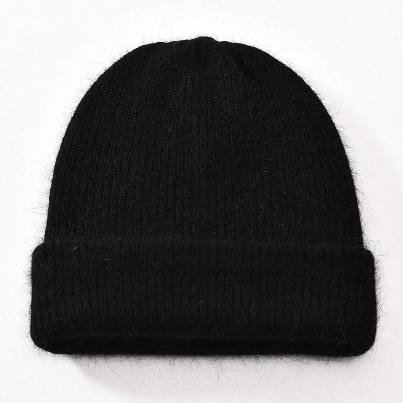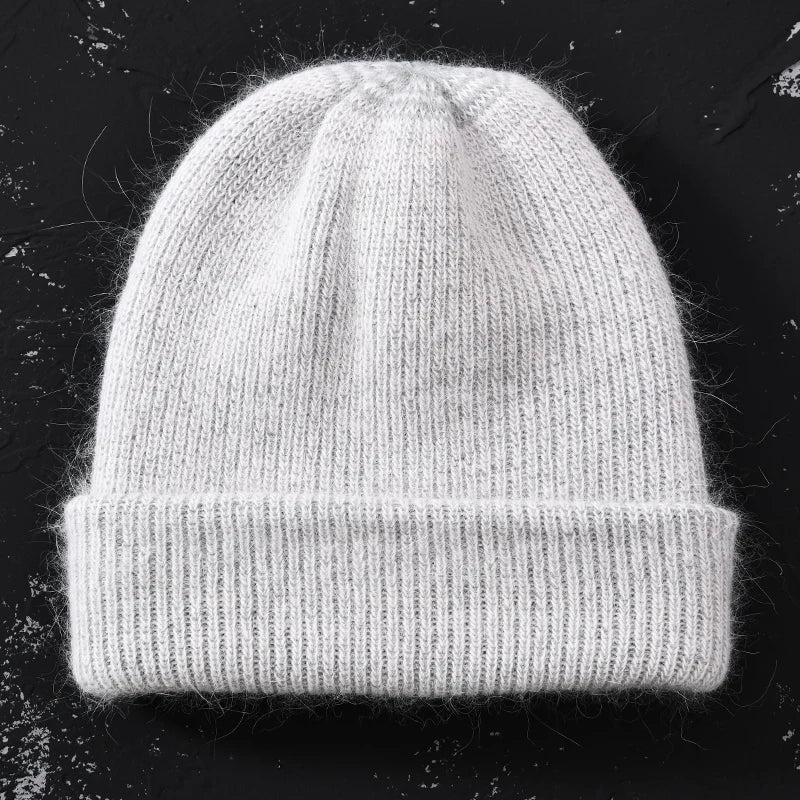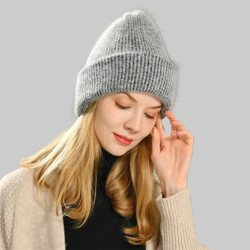 Long Rabbit Cashmere Double Layer Wool Knitted Cuffed Beanie Hat for Women