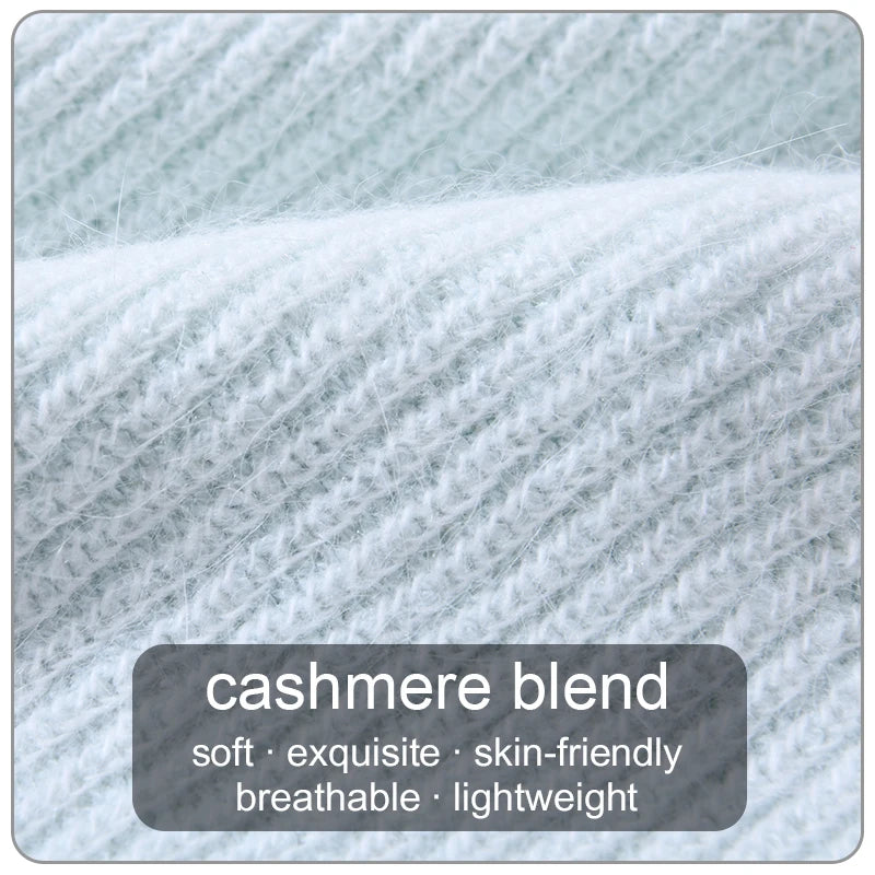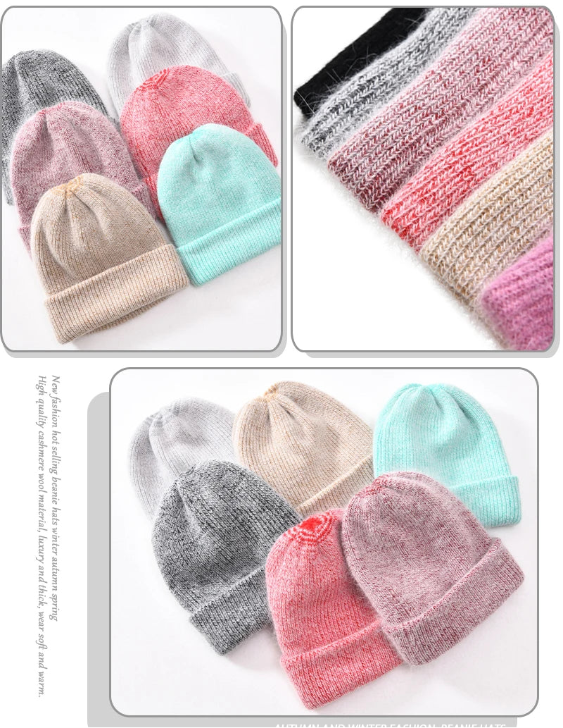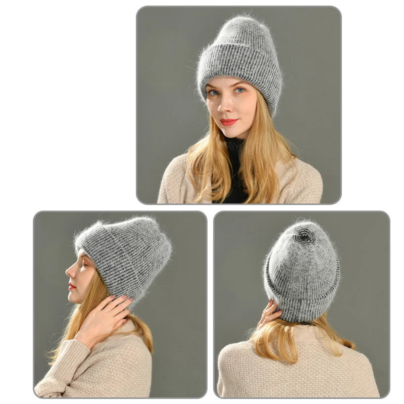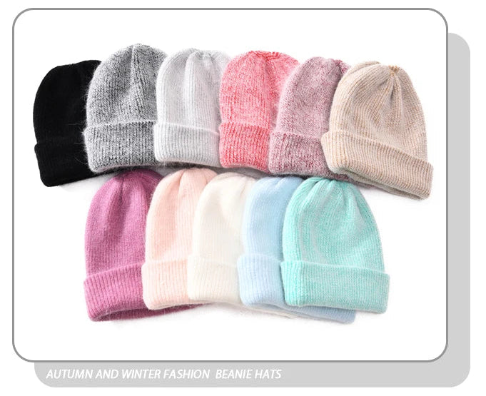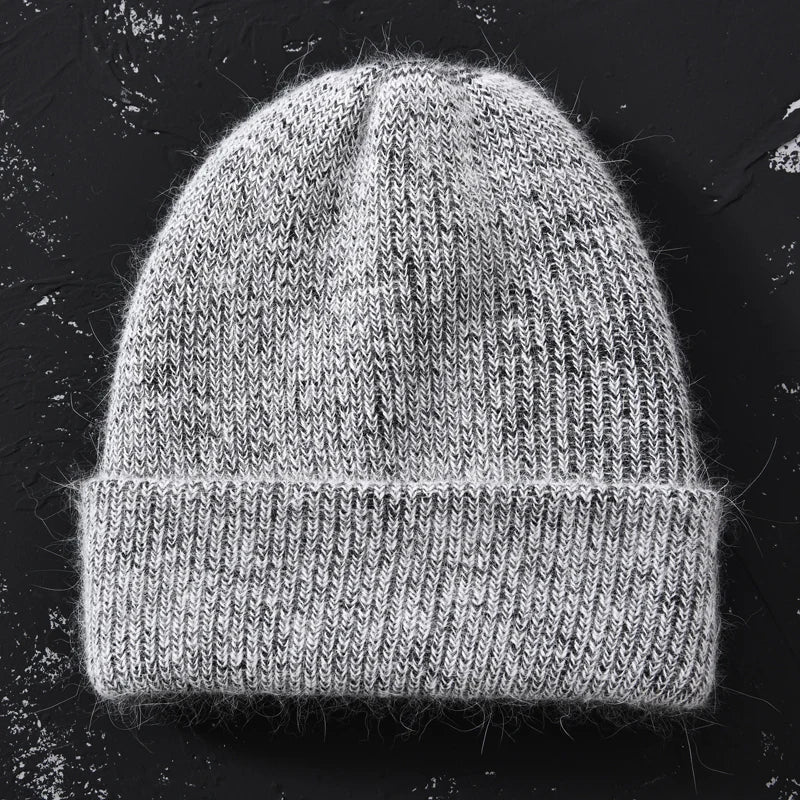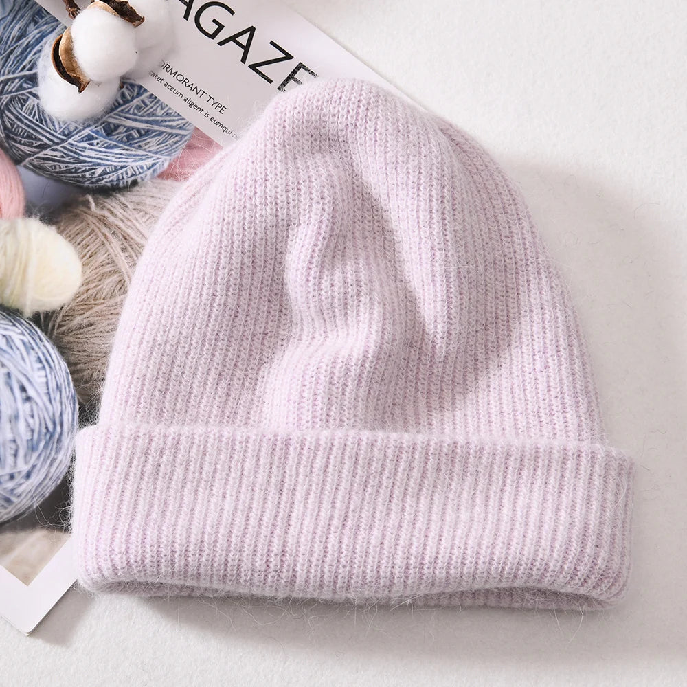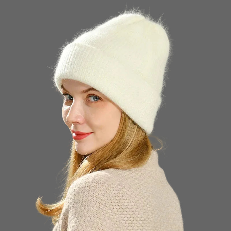 Long Rabbit Cashmere Double Layer Wool Knitted Cuffed Beanie Hat for Women