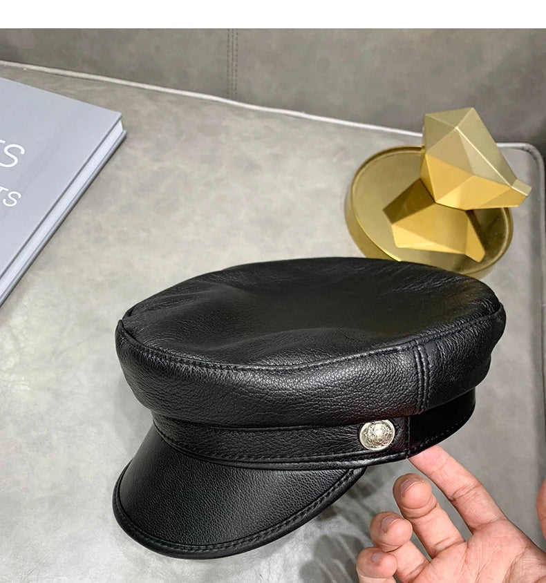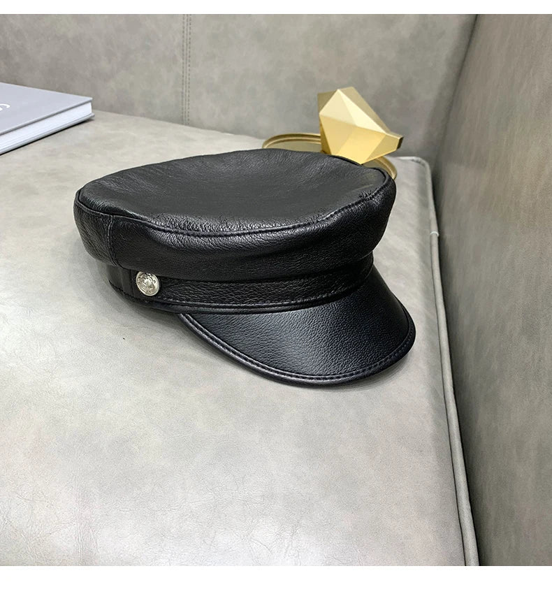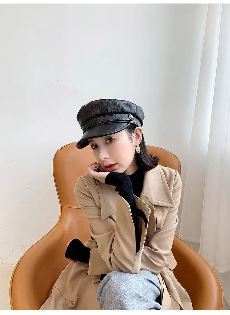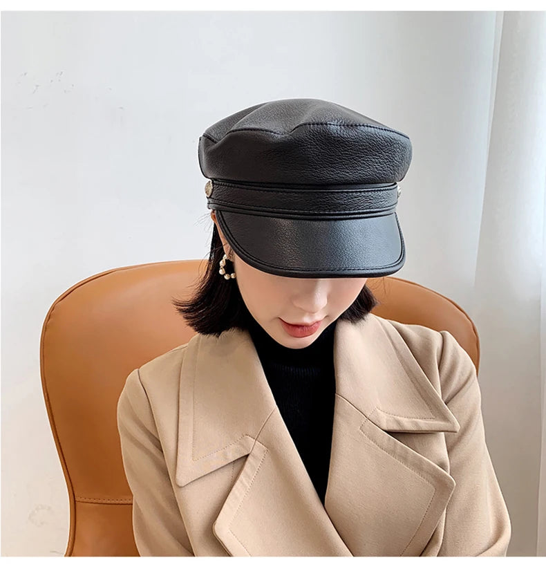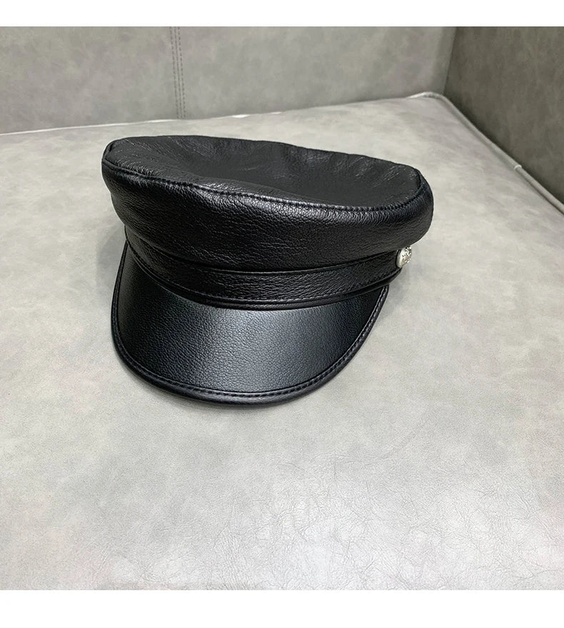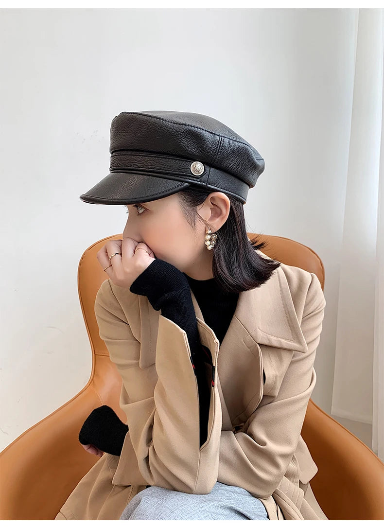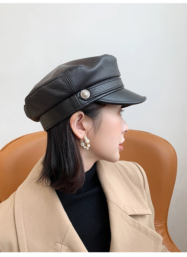Trendy American Leisure Genuine Leather Visor Flat Top Military Hat for Women