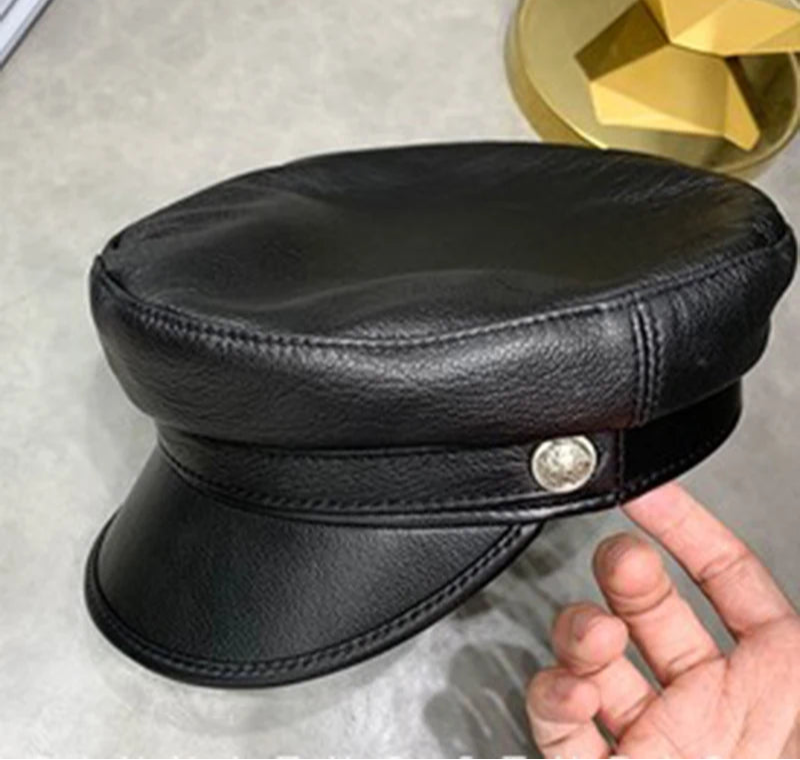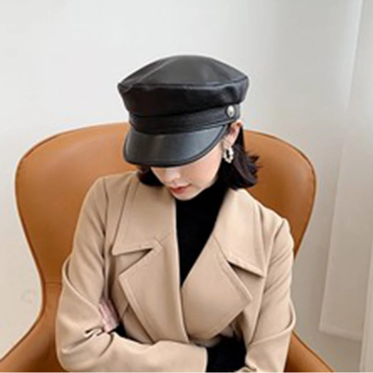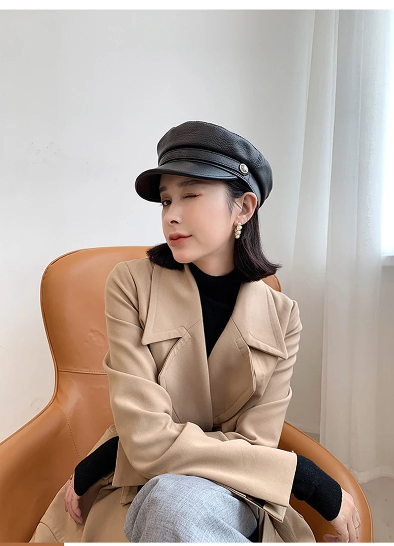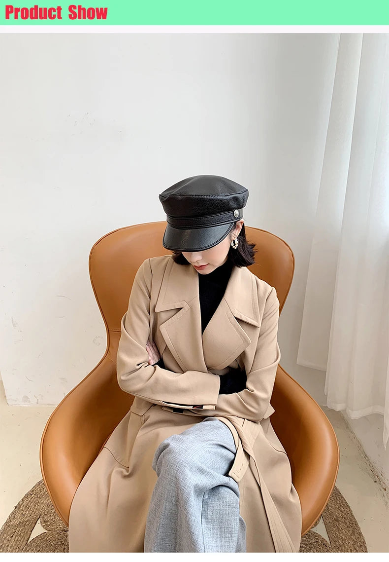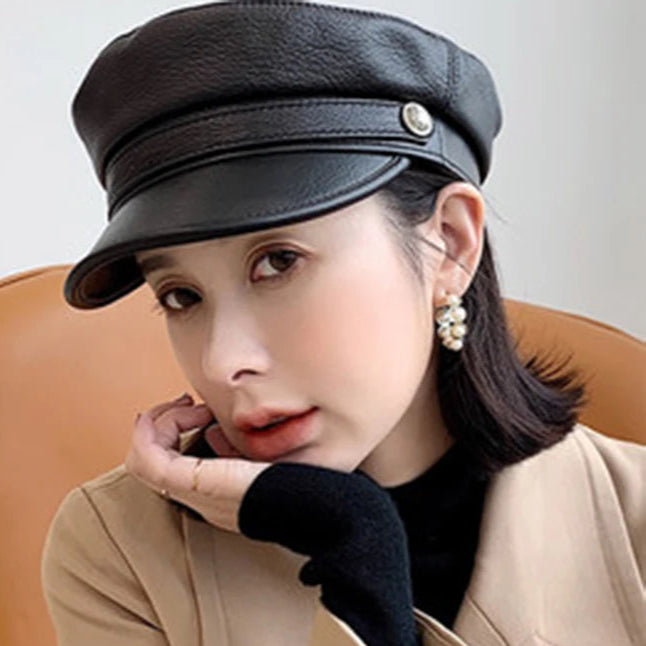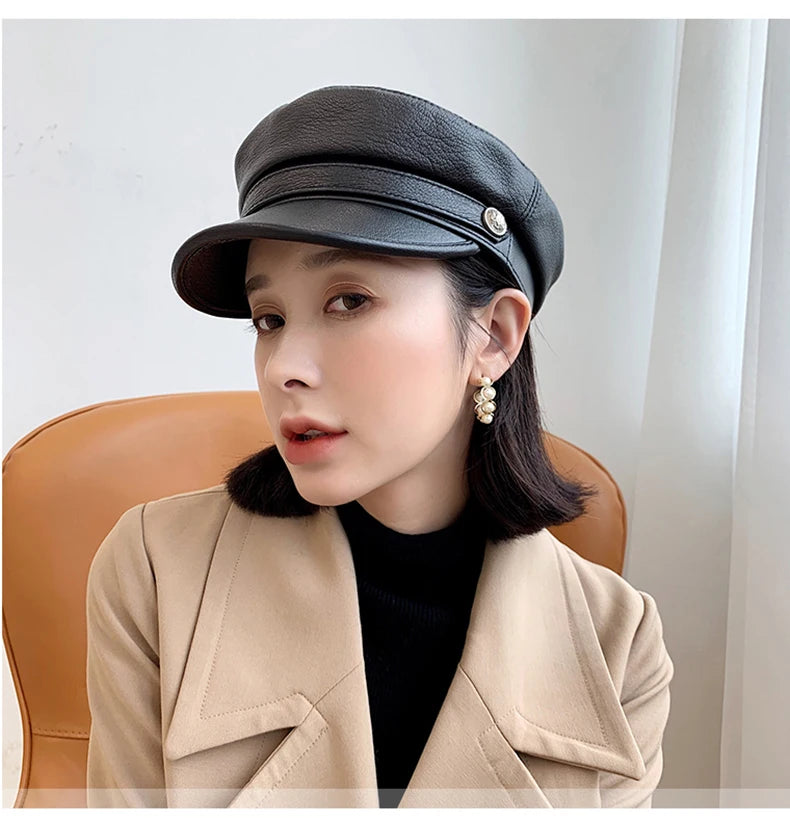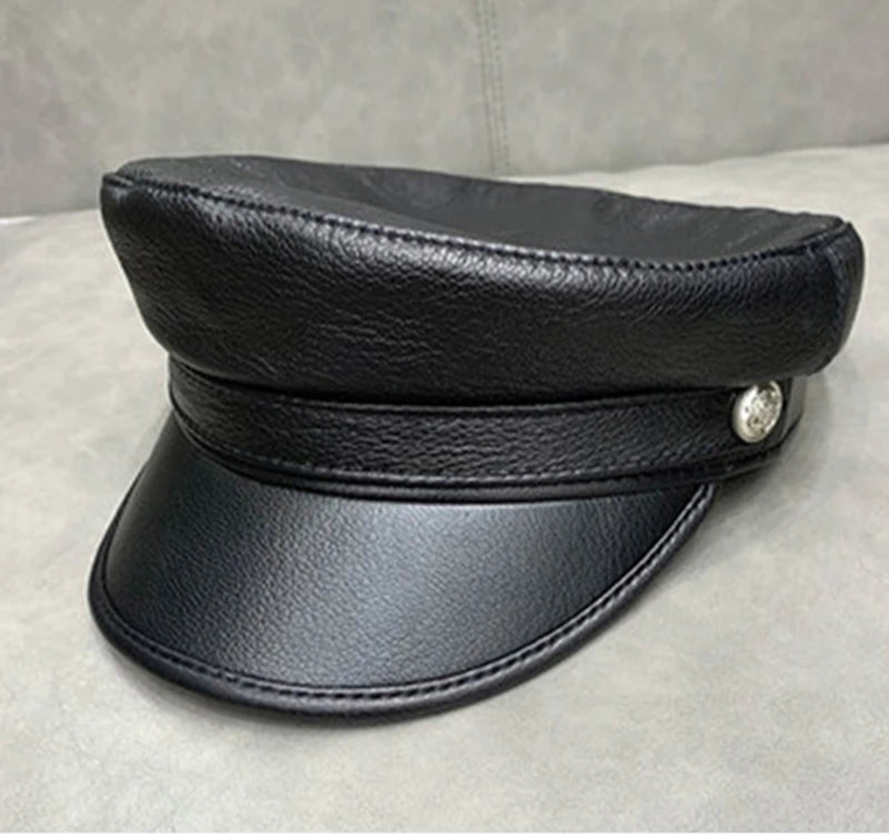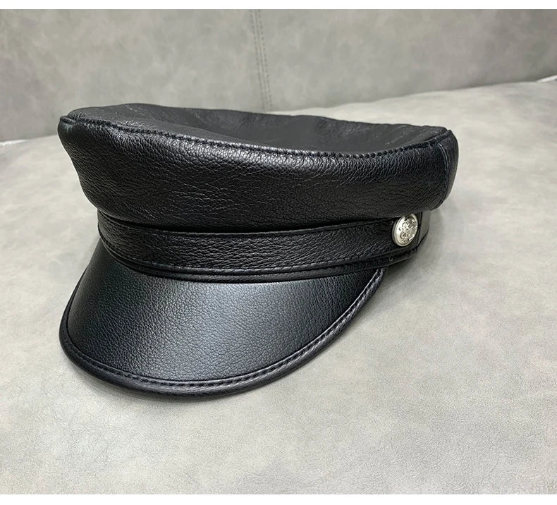 Trendy American Leisure Genuine Leather Visor Flat Top Military Hat for Women