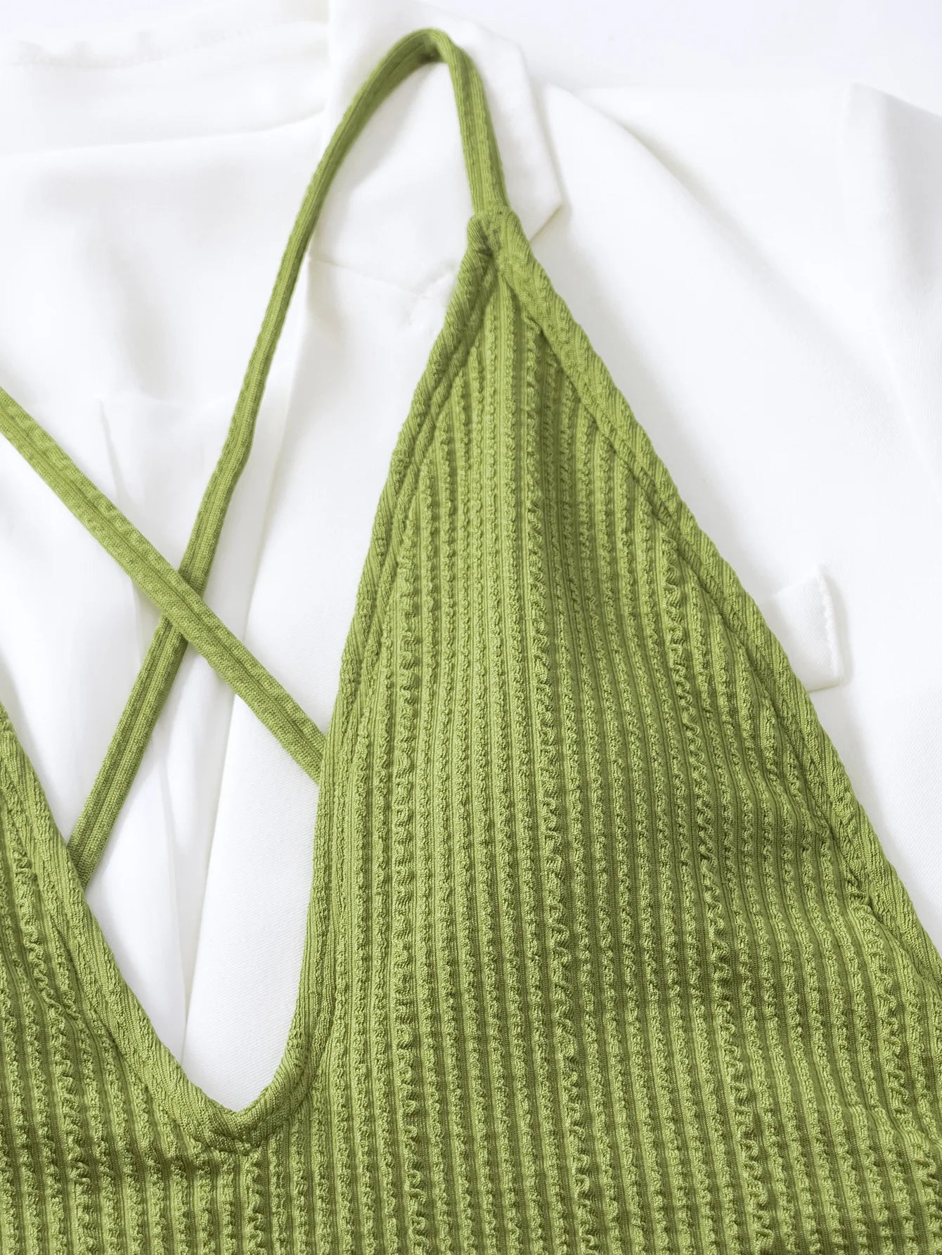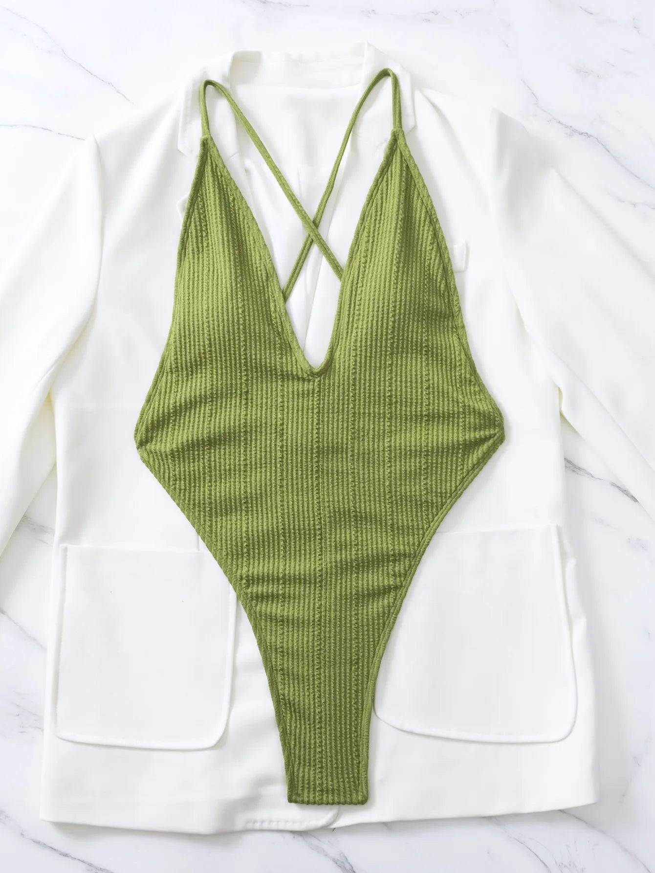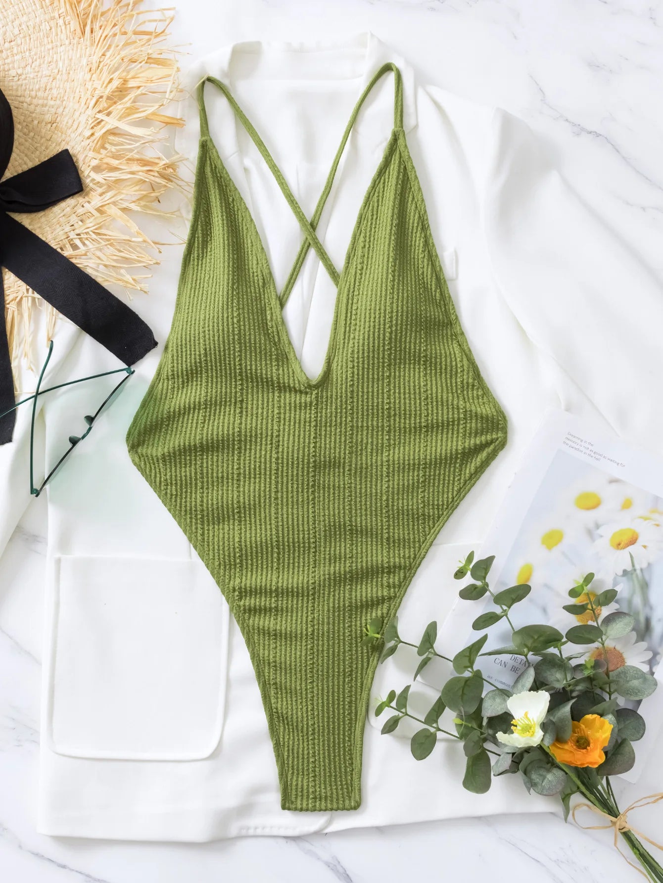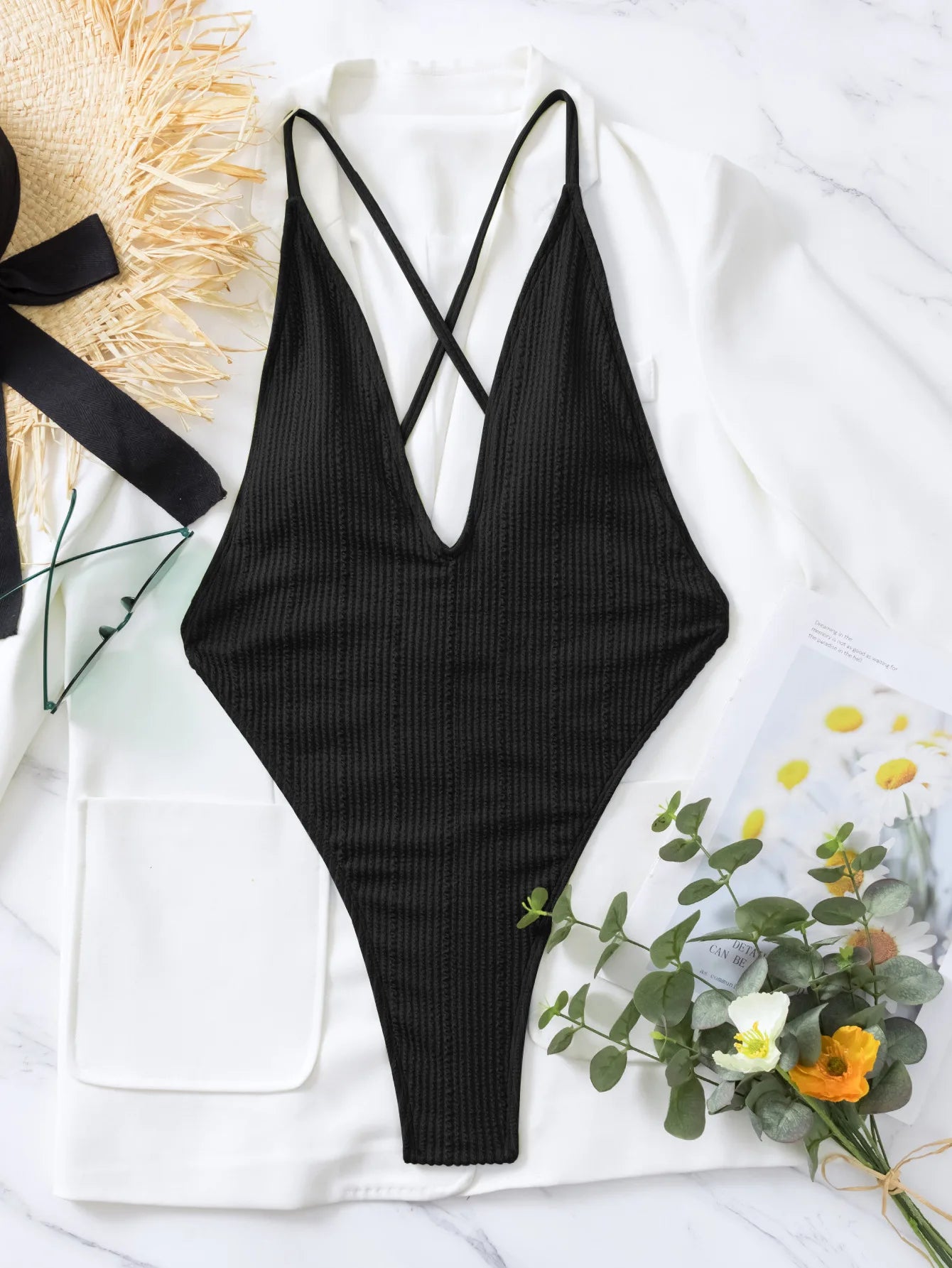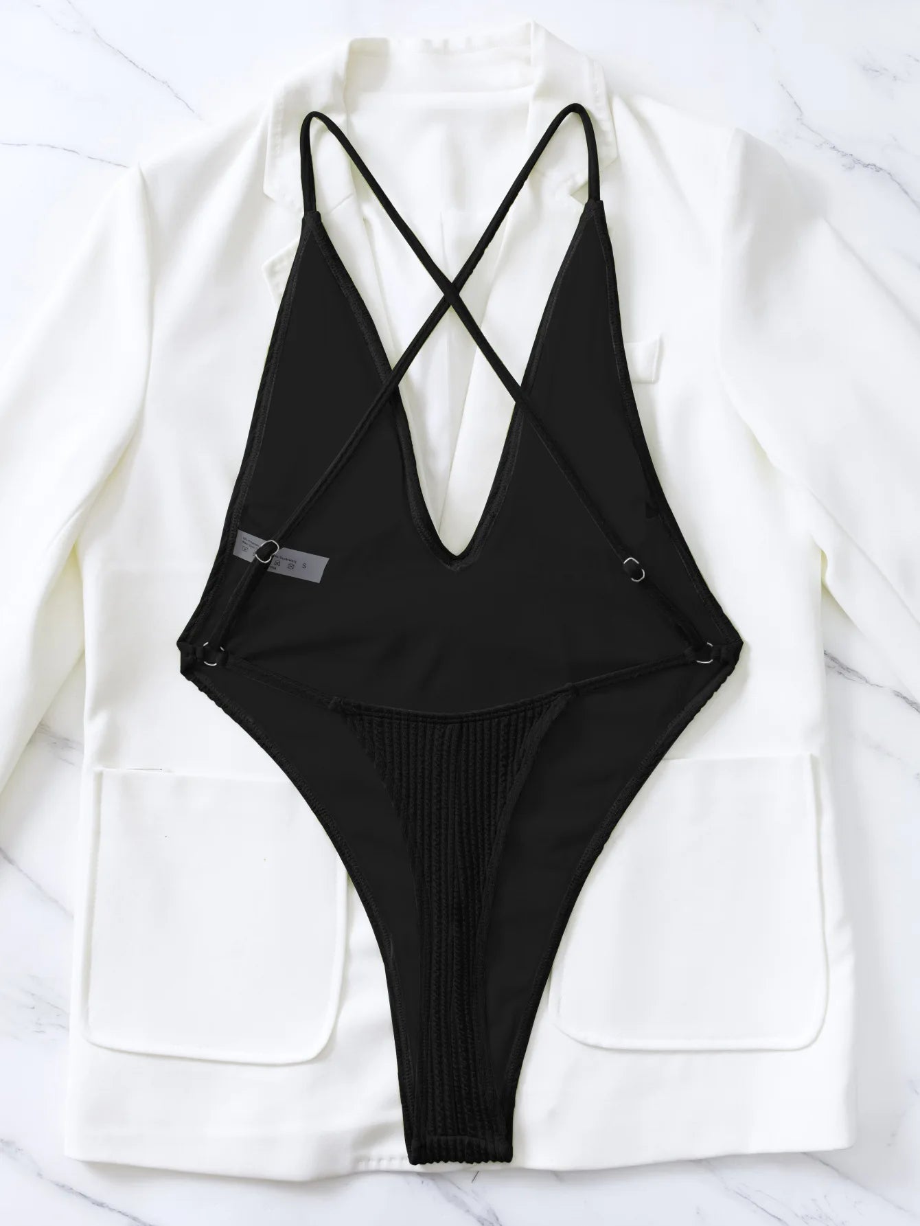 Sexy Deep V Neck Ribbed Backless Tummy Control One Piece Swimsuit for Women