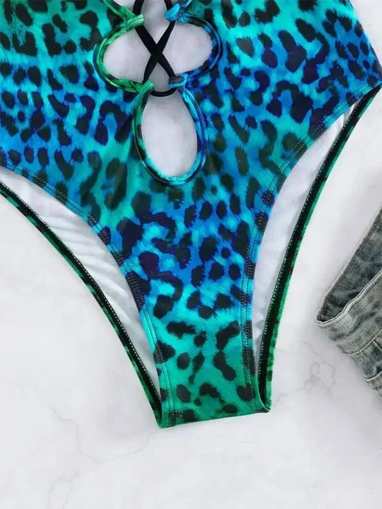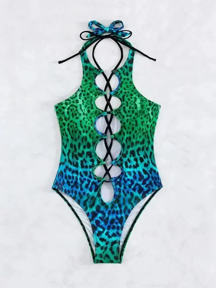 Sexy Leopard Print Gradient Hollow Out Backless One Piece Swimsuit for Women