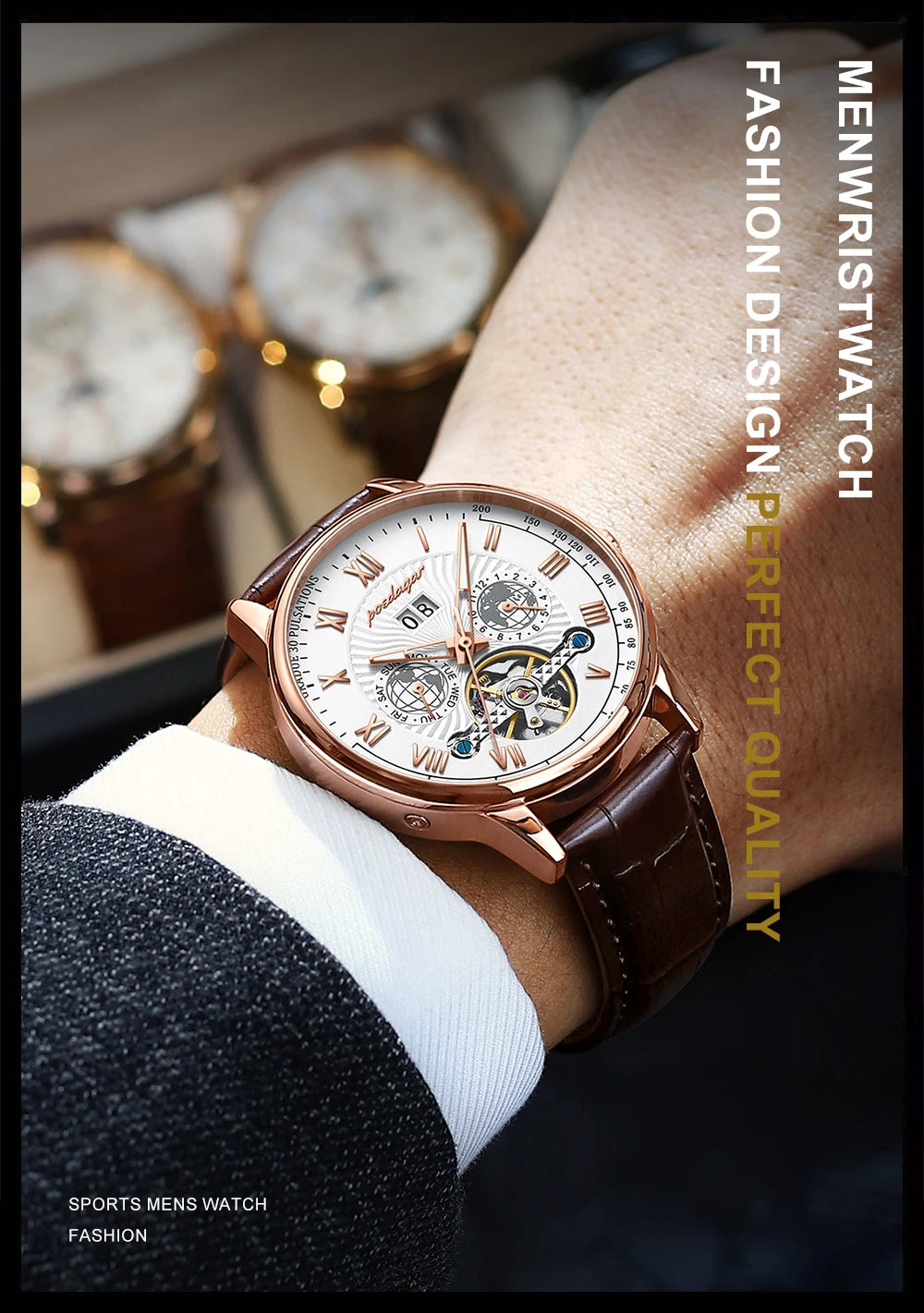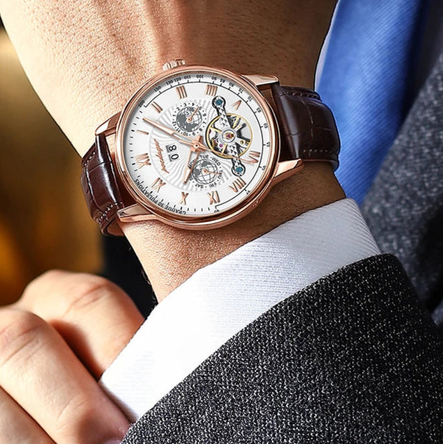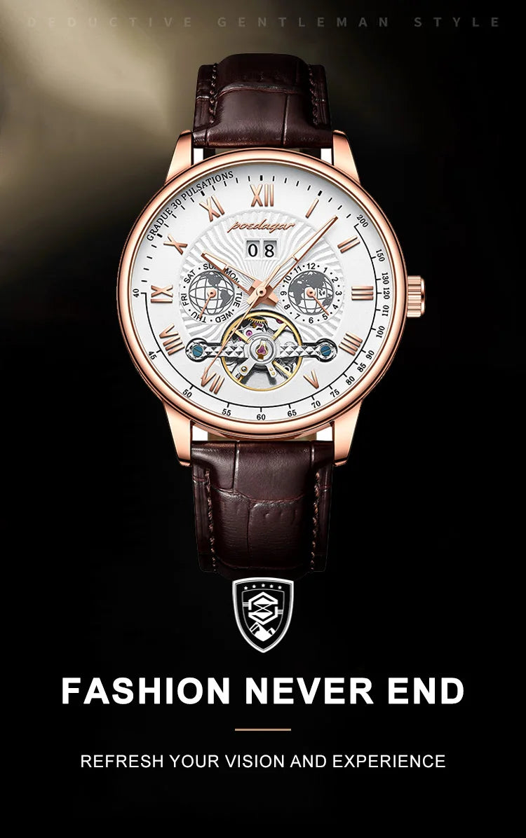 Automatic Mechanical Tourbillon Luminous Waterproof Leather Business Casual Watch for Men