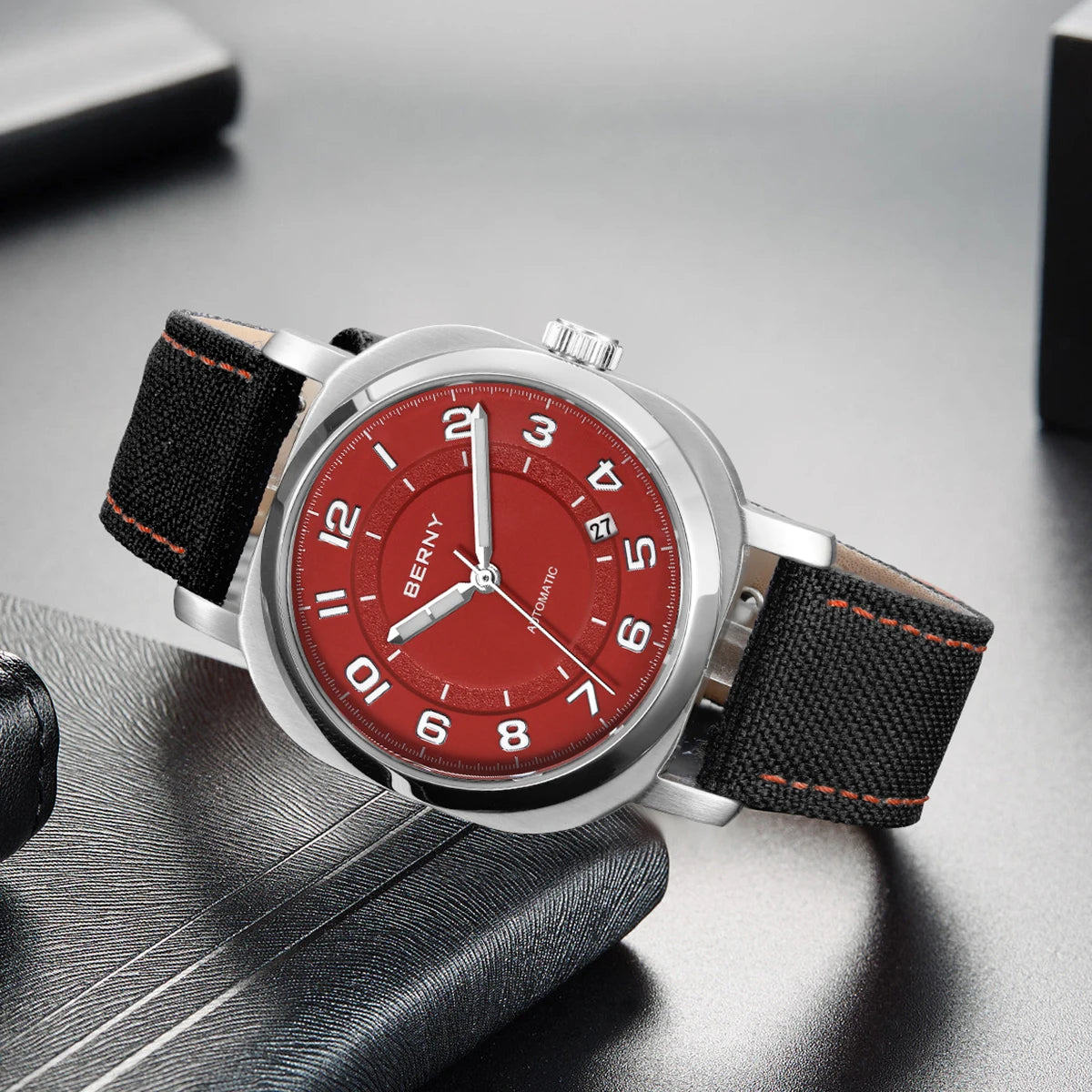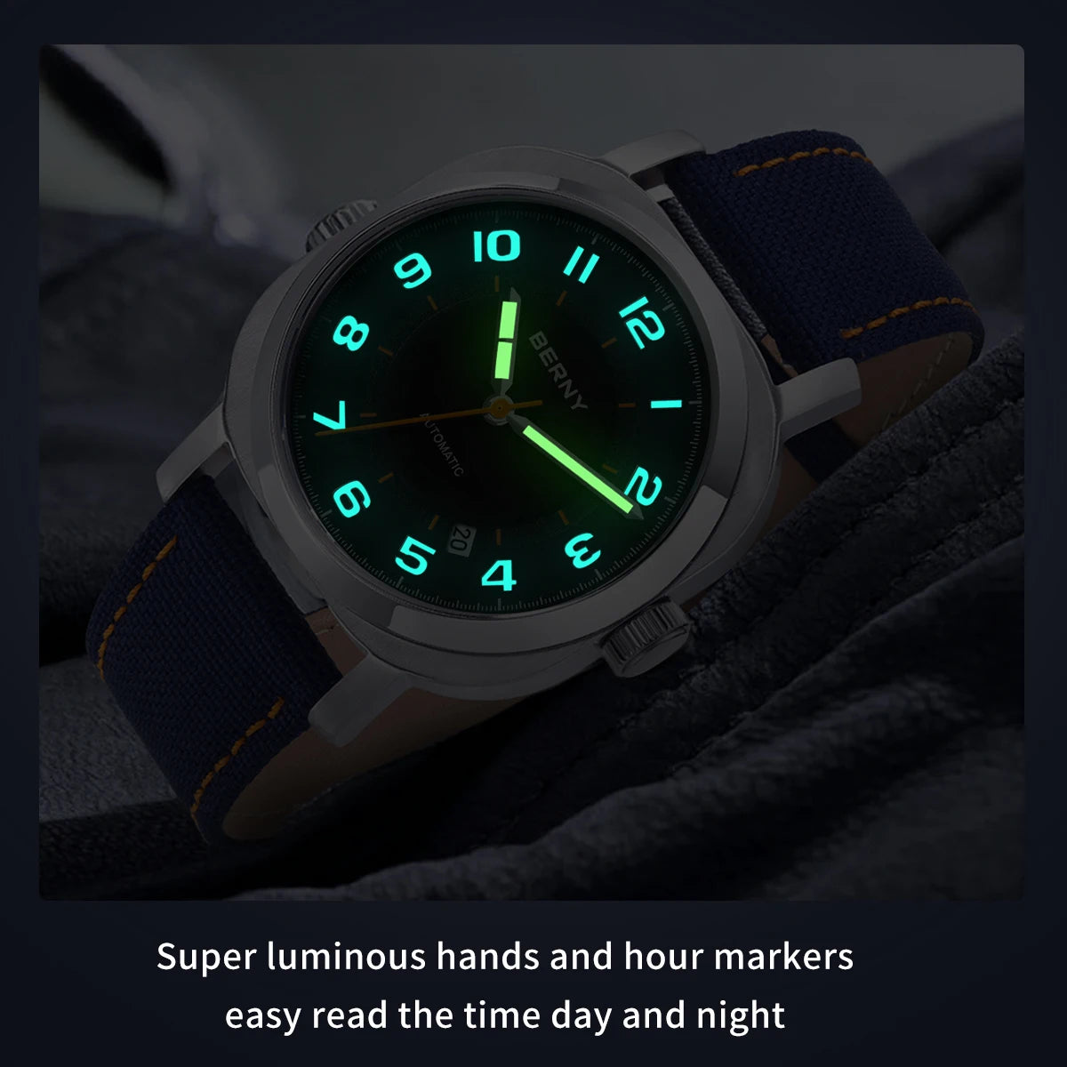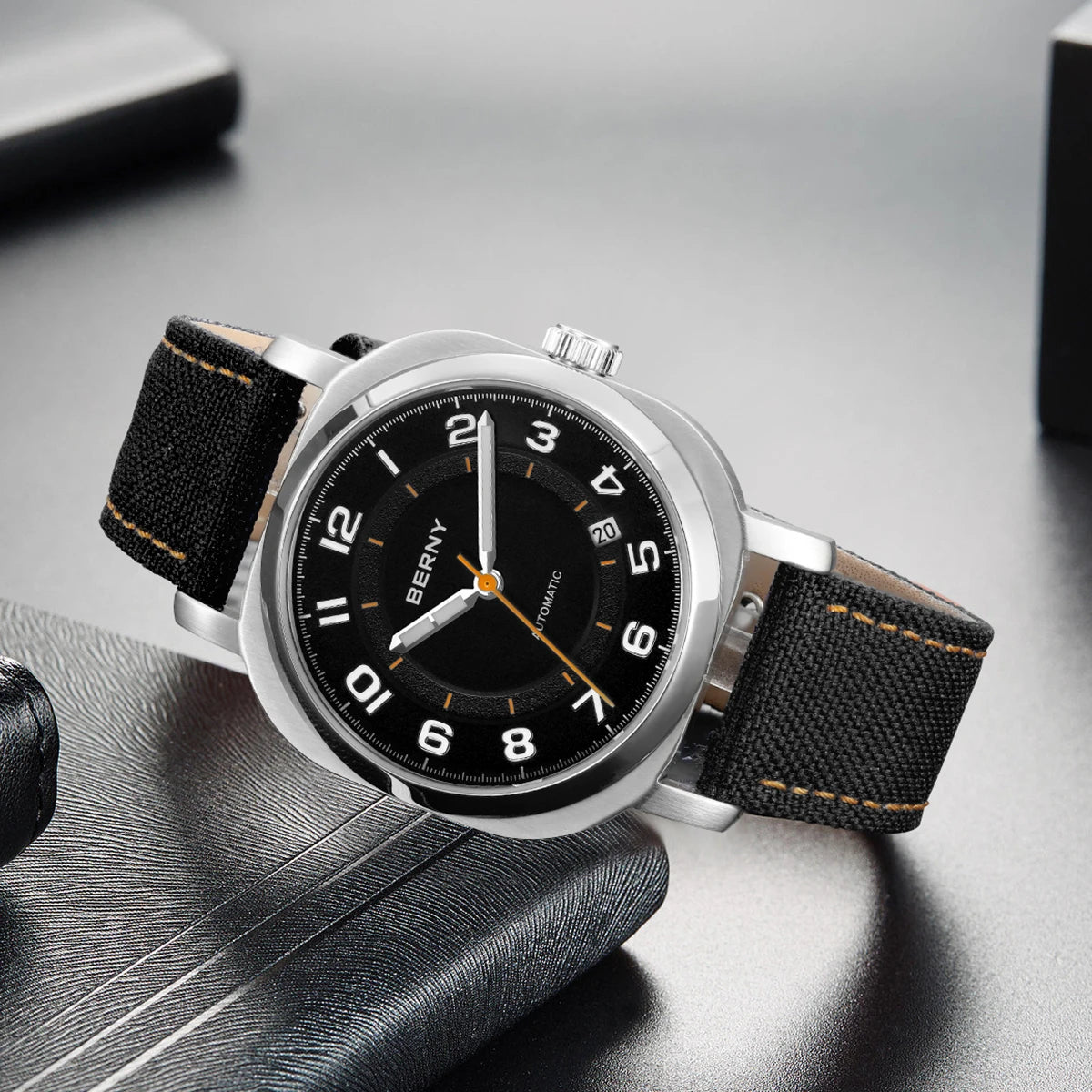 Stainless Steel Cushion Case Canvas Band Super Luminous Hands Mechanical Wristwatch for Men