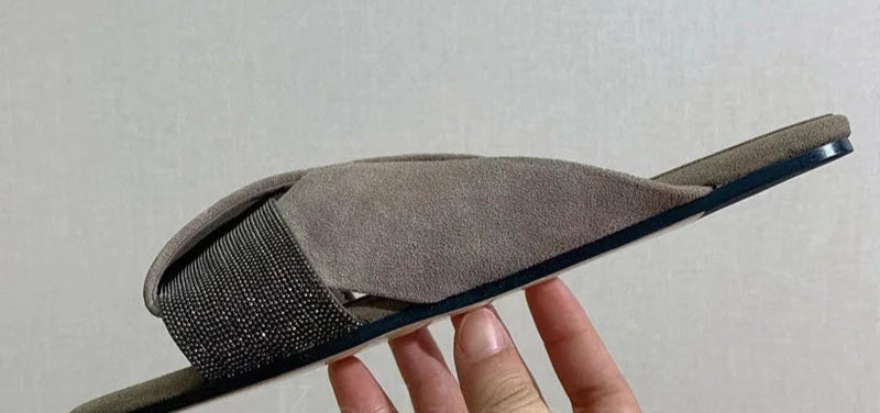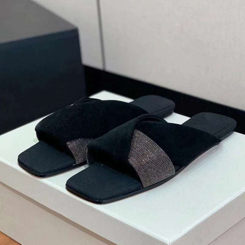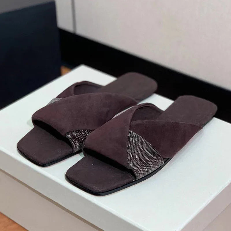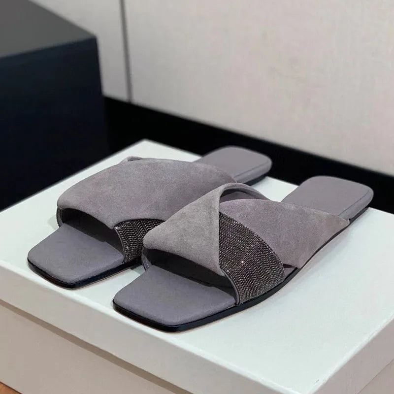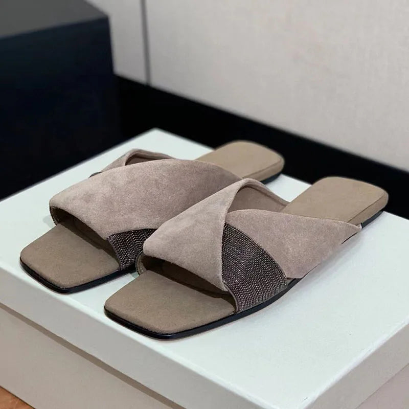 Luxury Cow Suede Flat Square Peep Toe Slippers Mules for Women