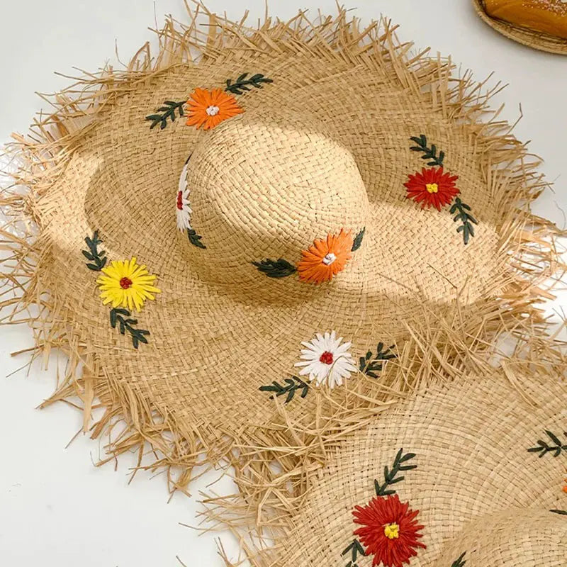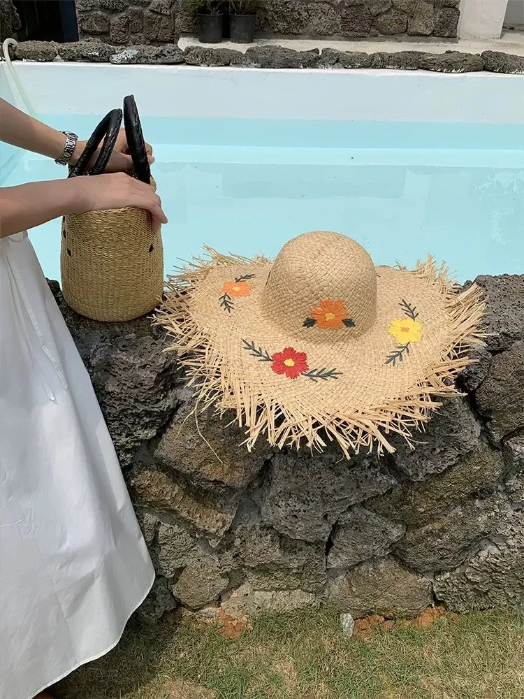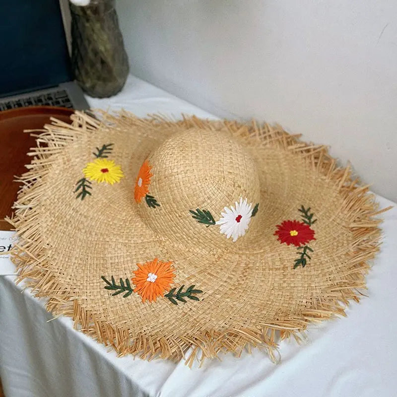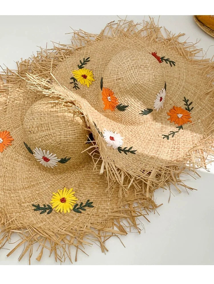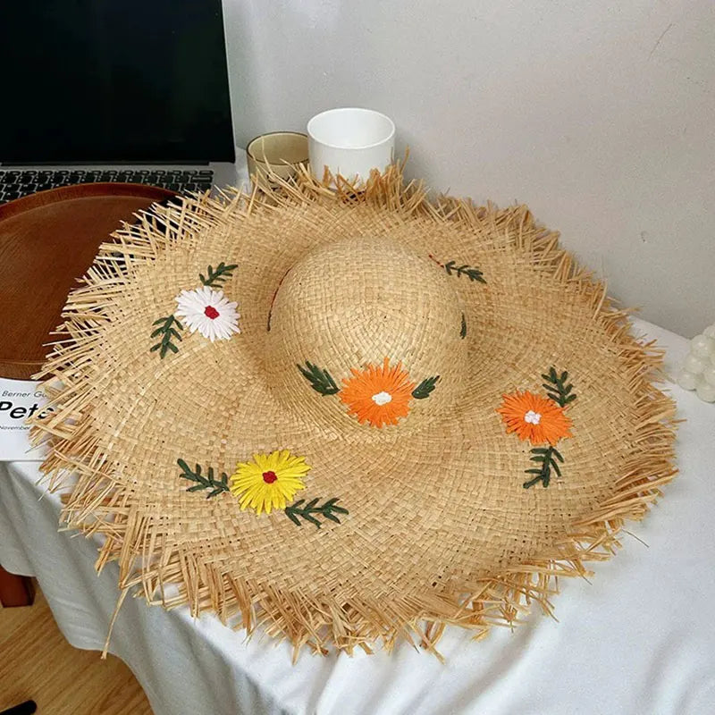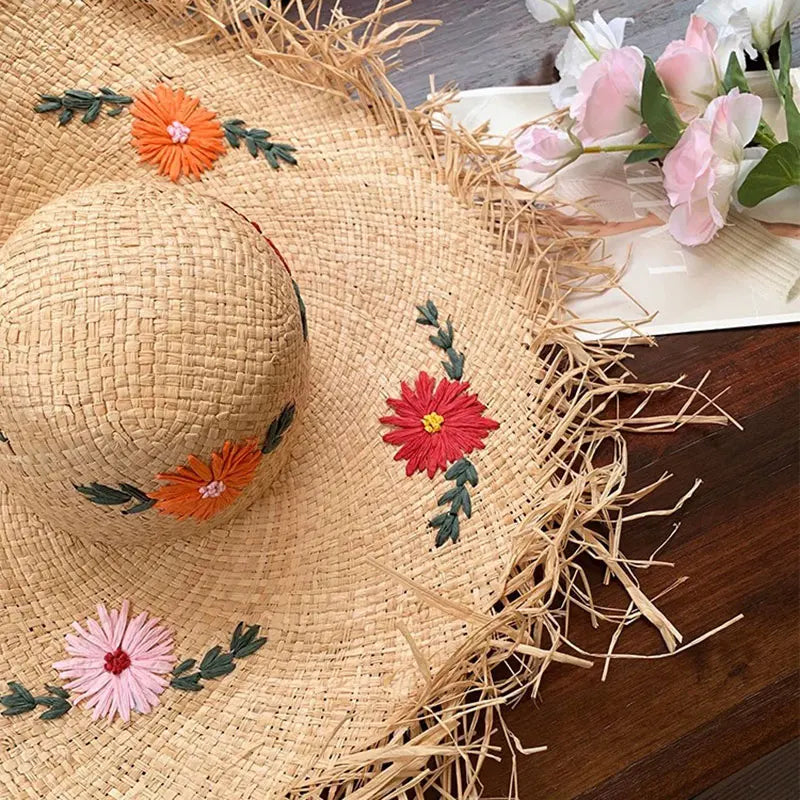 Fashion Designer Raffia Grass Flower Embroidered Oversized Sunscreen Sun Hat for Women