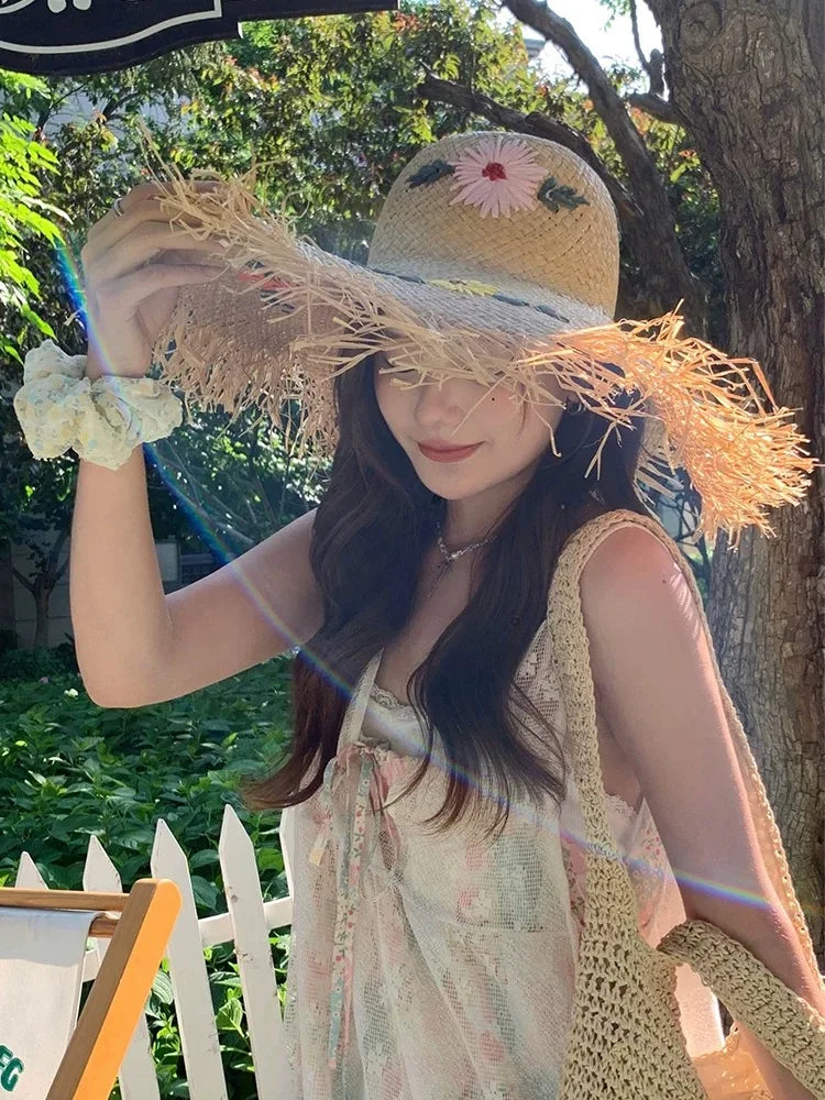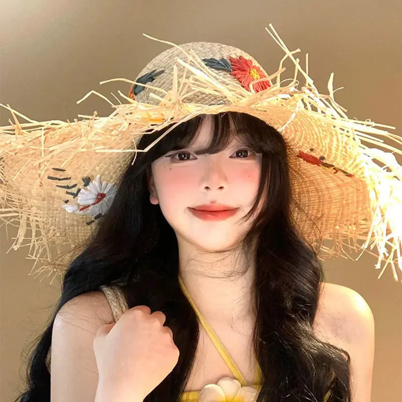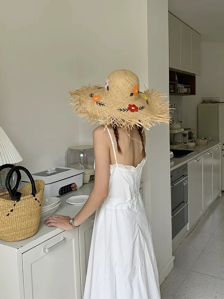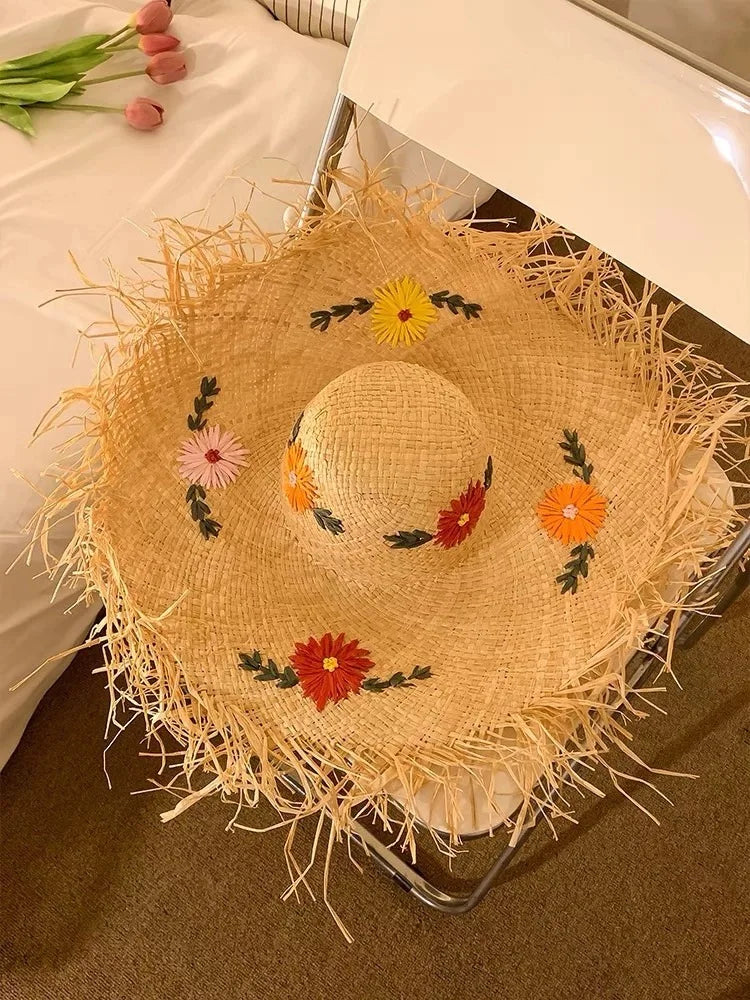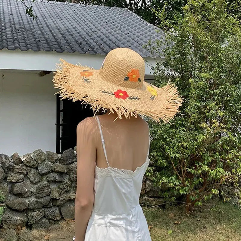 Fashion Designer Raffia Grass Flower Embroidered Oversized Sunscreen Sun Hat for Women