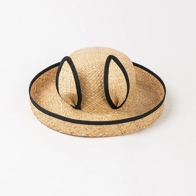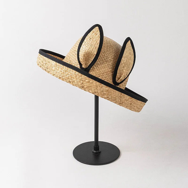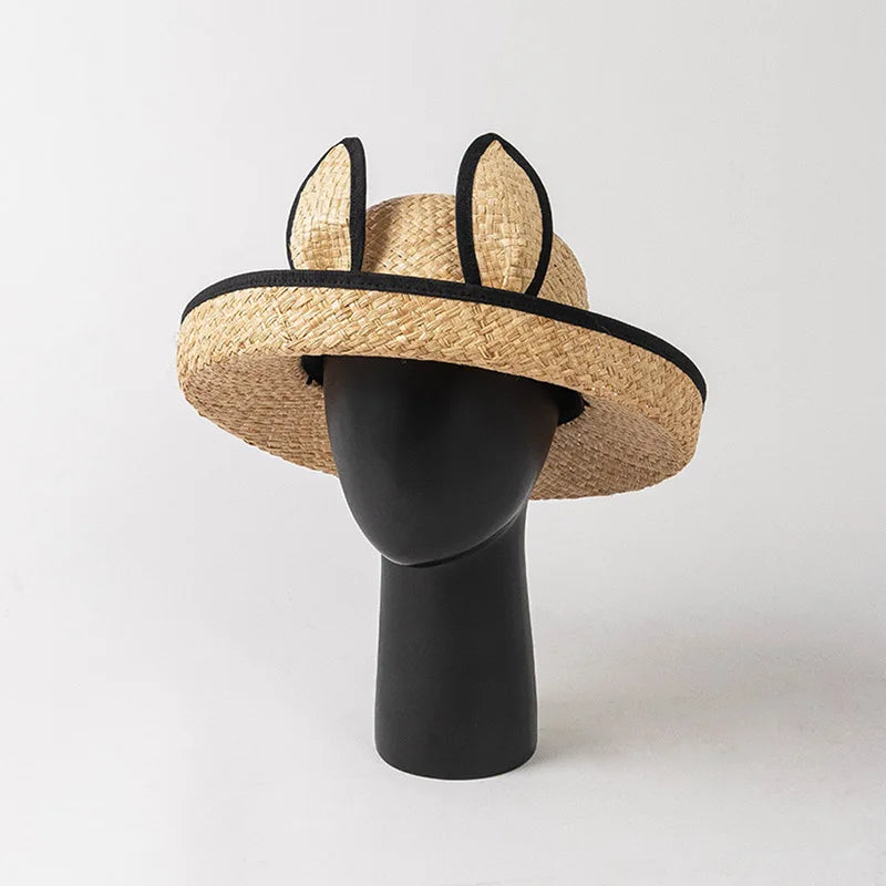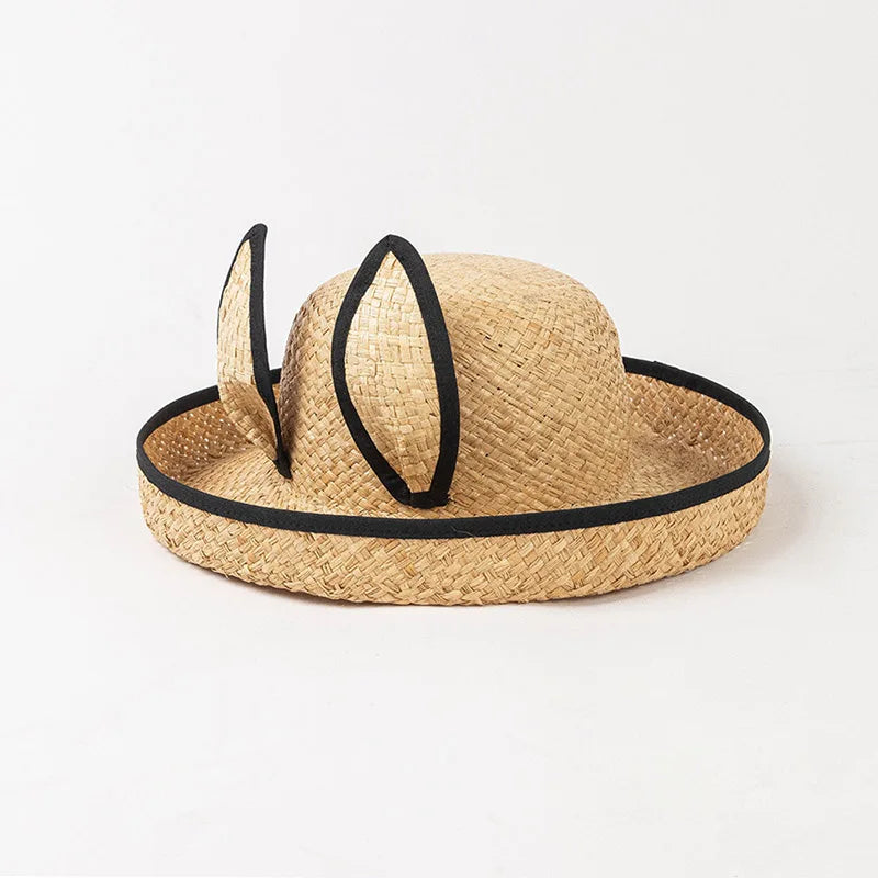 Korean Fashion Cute Rabbit Ears Dome Curling Handmade Raffia Straw Hat for Women