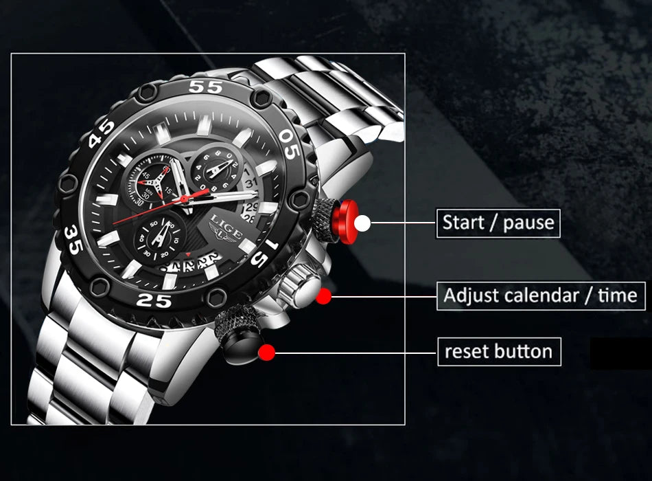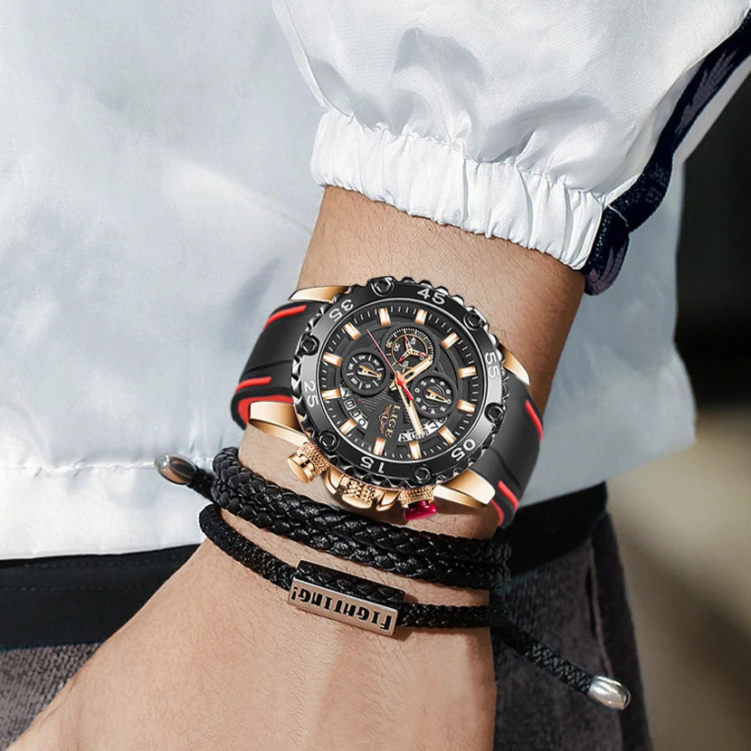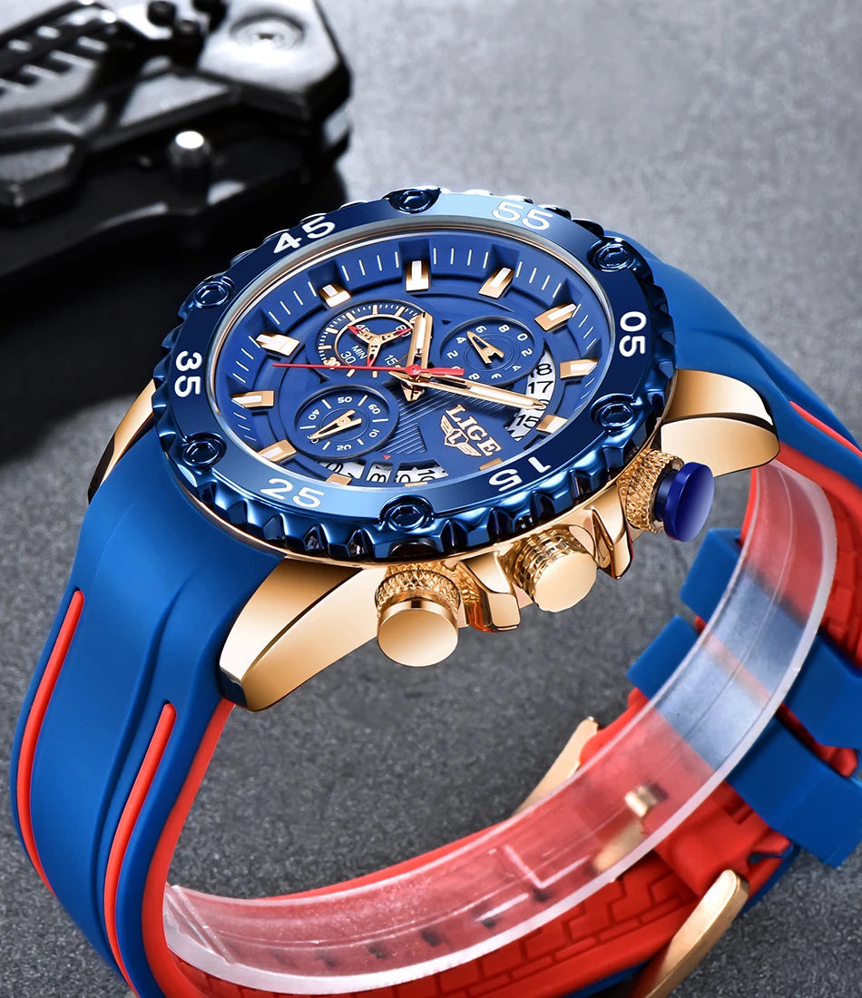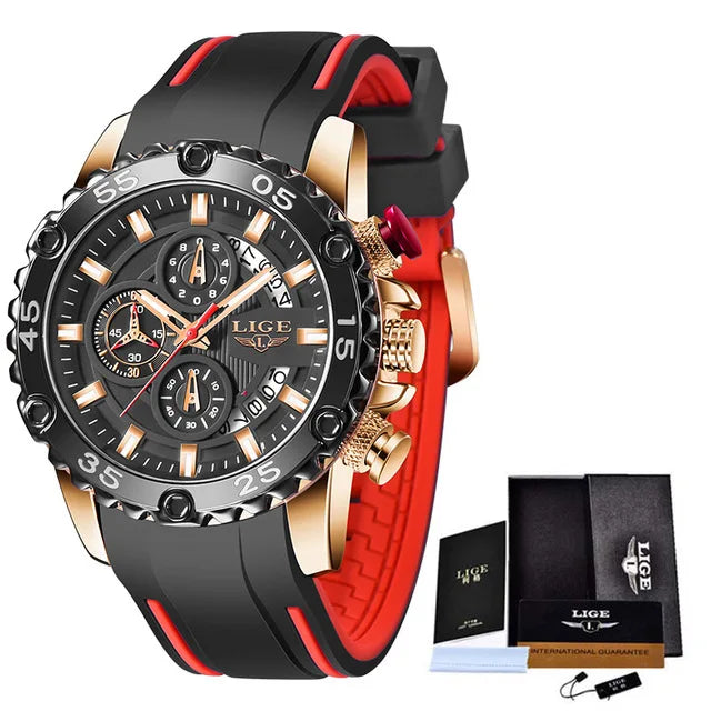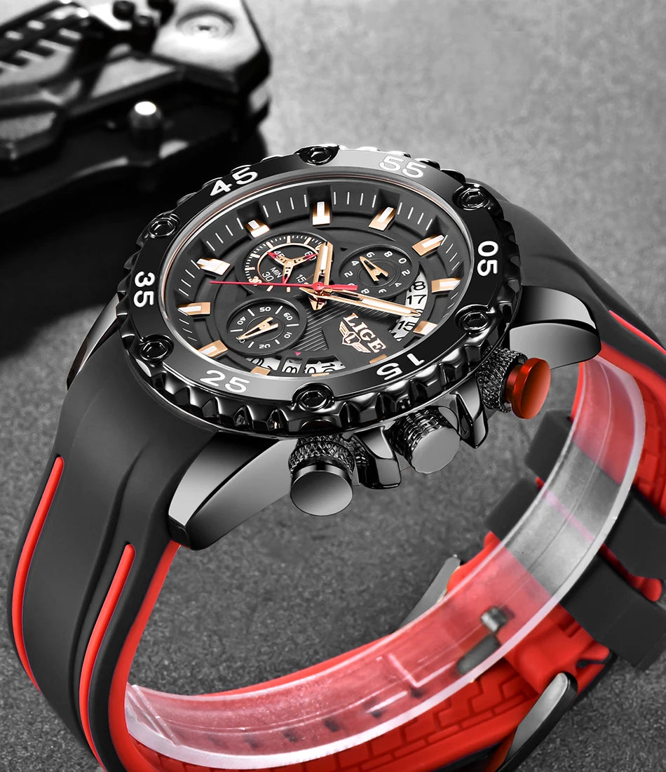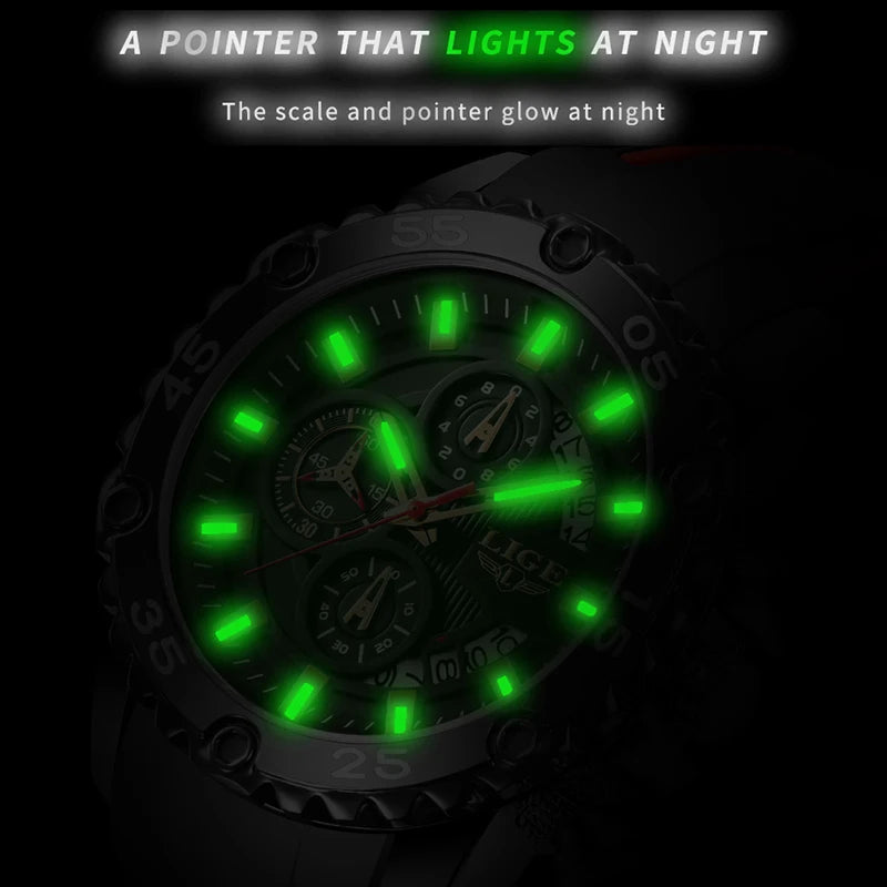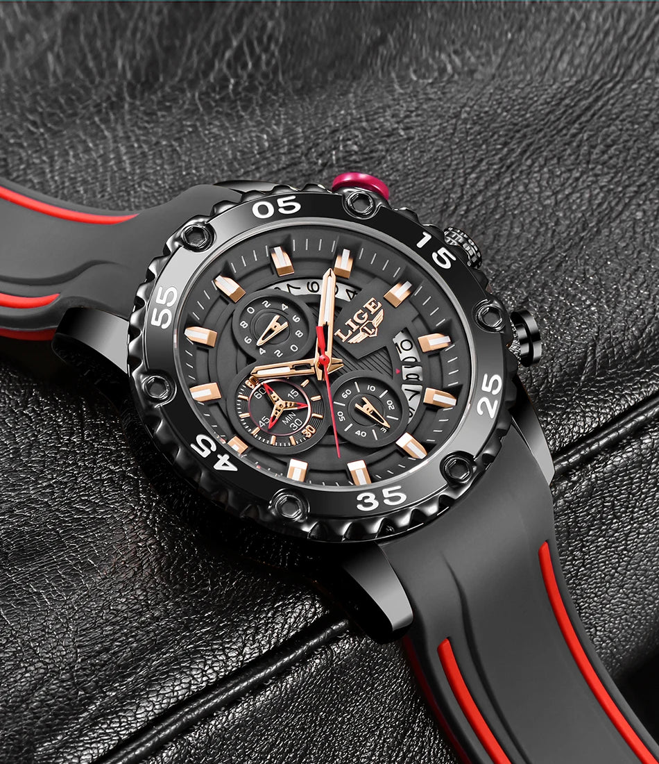 Looking for a fantastic men's watch? Then this is for you. Made with a silicone strap and stainless steel casing, this watch sits comfortably on your wrist. The big dial, along with luminous hands, makes it easy to read the time in the light and in the darkness. Designed with stop watch, shock resistance, auto date, chronograph, complete calendar and water resistance, this watch is more than just a fashion accessory. Buy now!