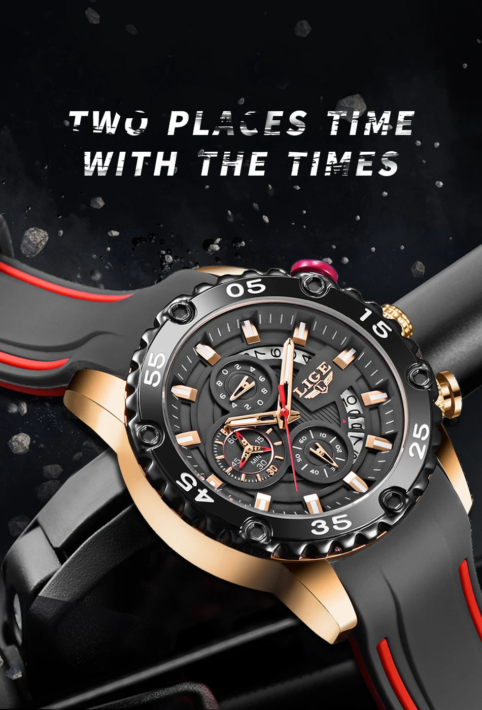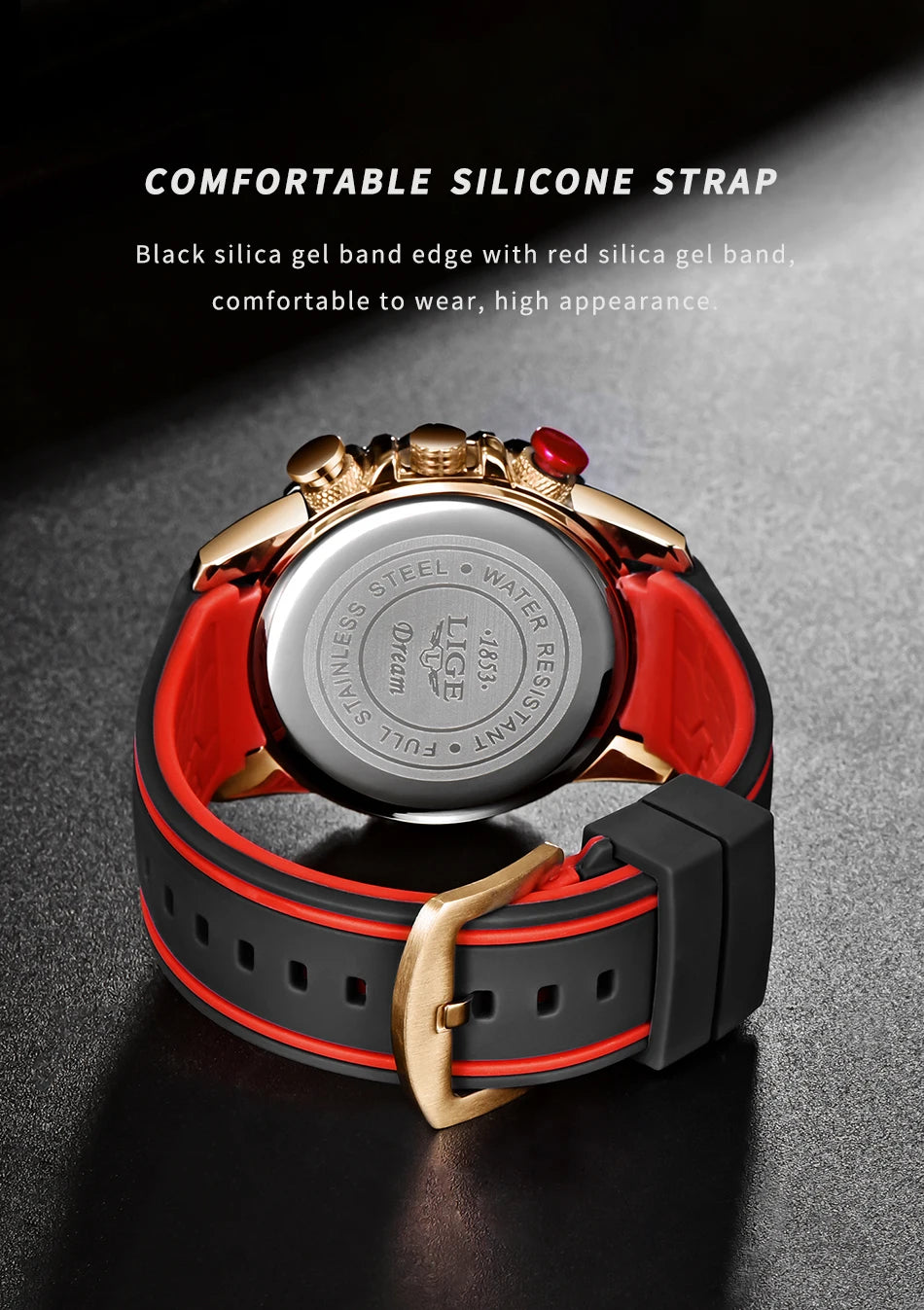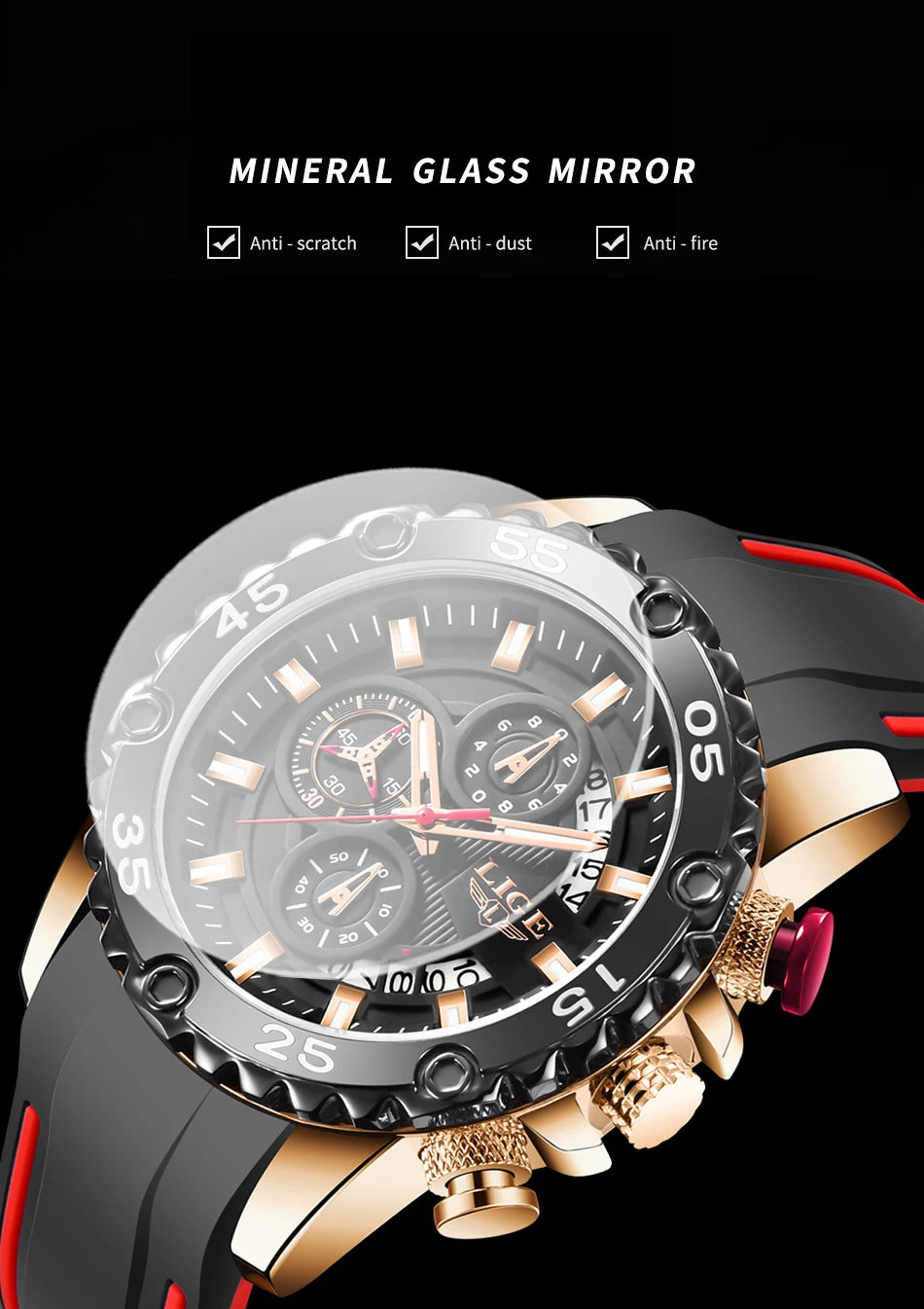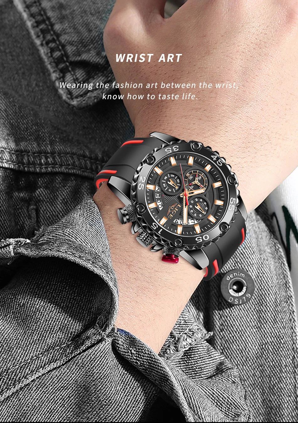 Looking for a fantastic men's watch? Then this is for you. Made with a silicone strap and stainless steel casing, this watch sits comfortably on your wrist. The big dial, along with luminous hands, makes it easy to read the time in the light and in the darkness. Designed with stop watch, shock resistance, auto date, chronograph, complete calendar and water resistance, this watch is more than just a fashion accessory. Buy now!