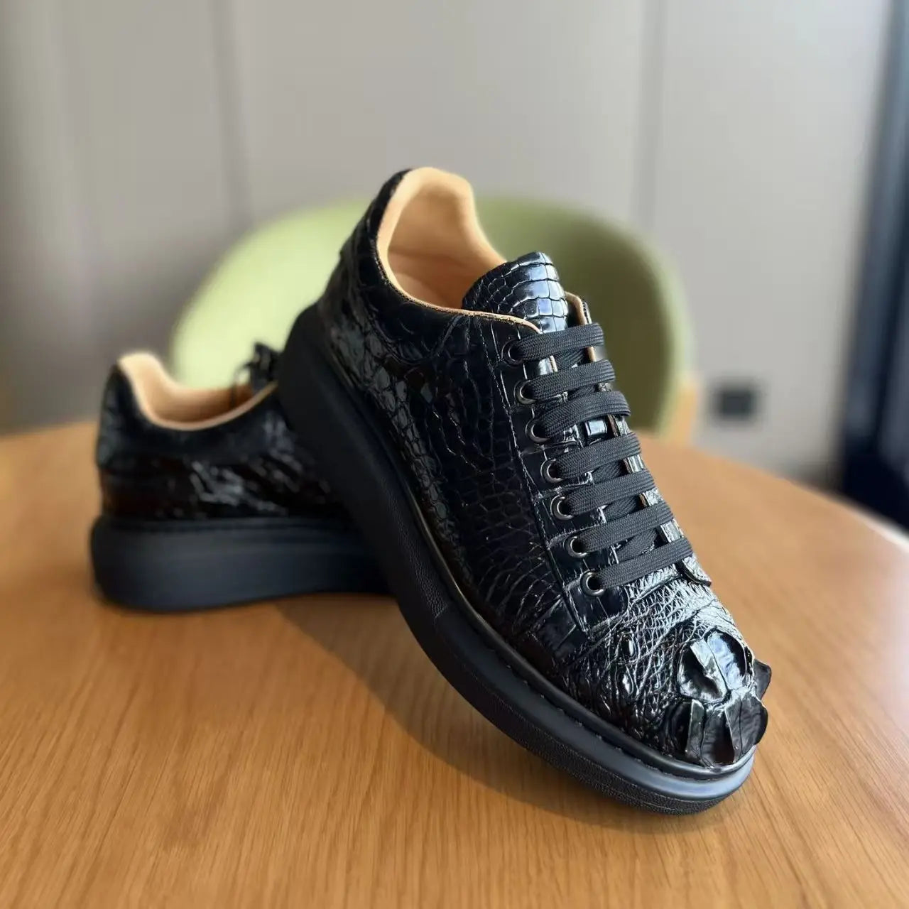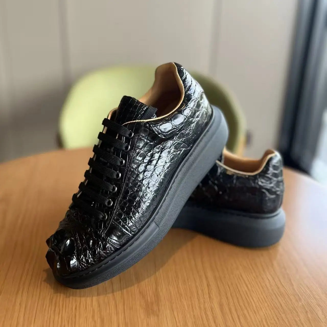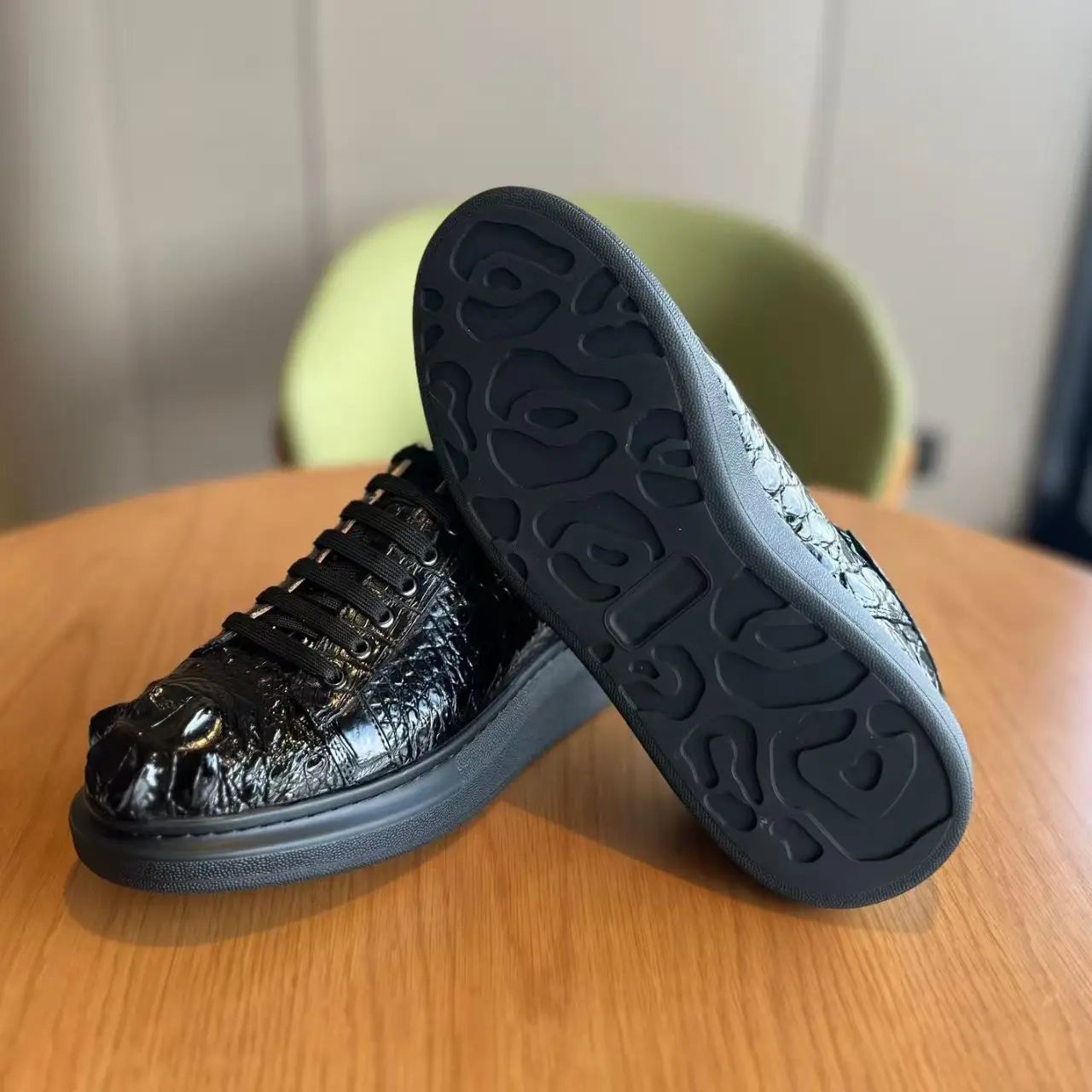 Men's Glossy Black Embossed Crocodile Skin Leather Casual Sneakers