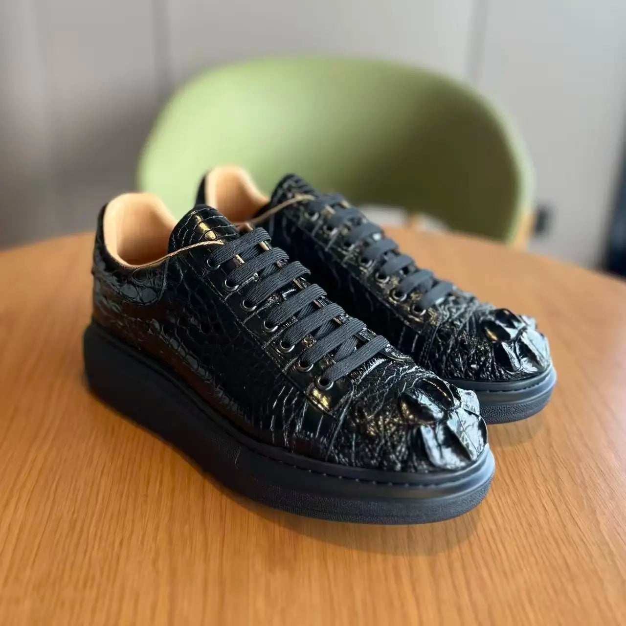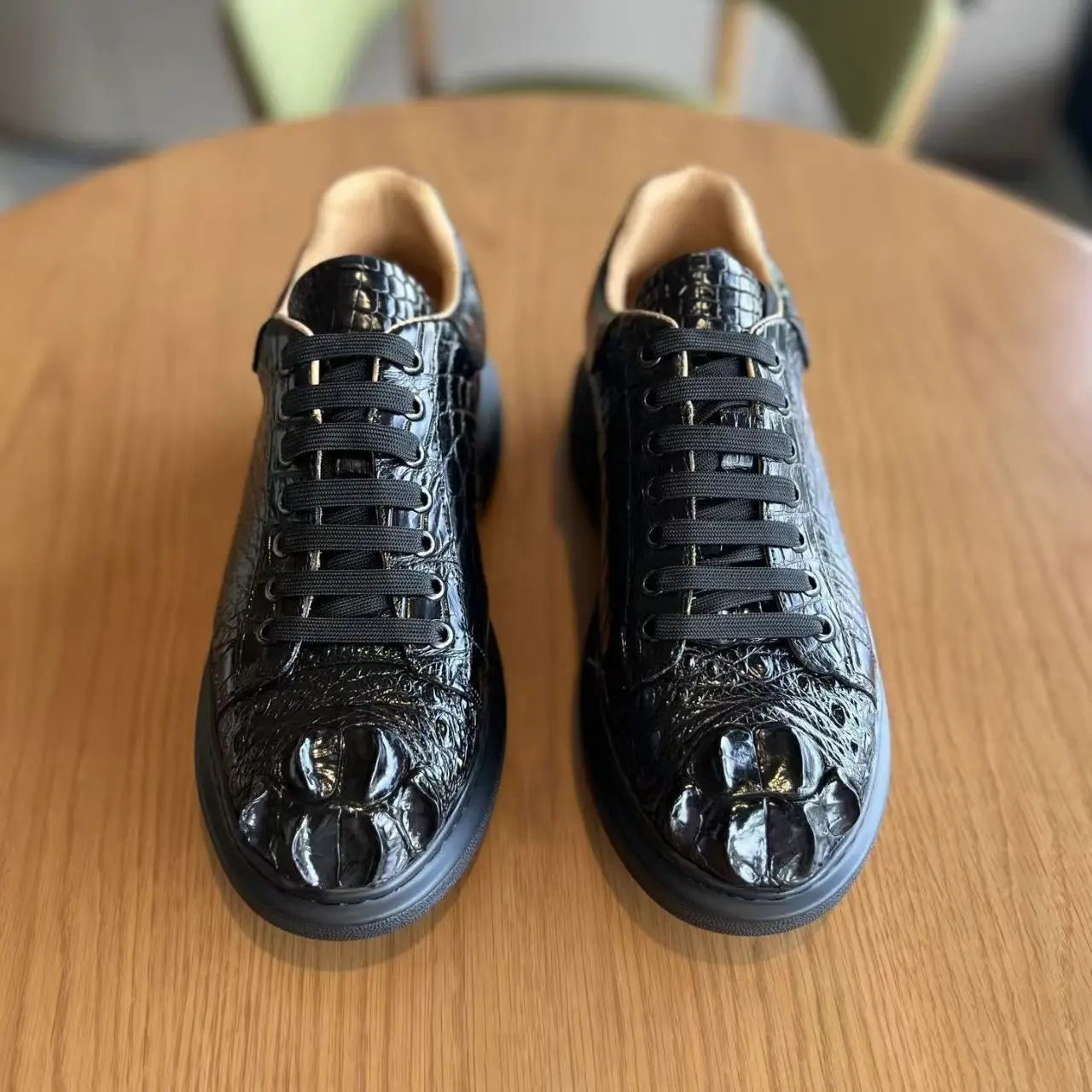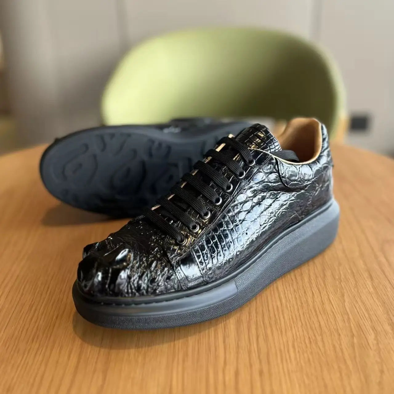Men's Glossy Black Embossed Crocodile Skin Leather Casual Sneakers