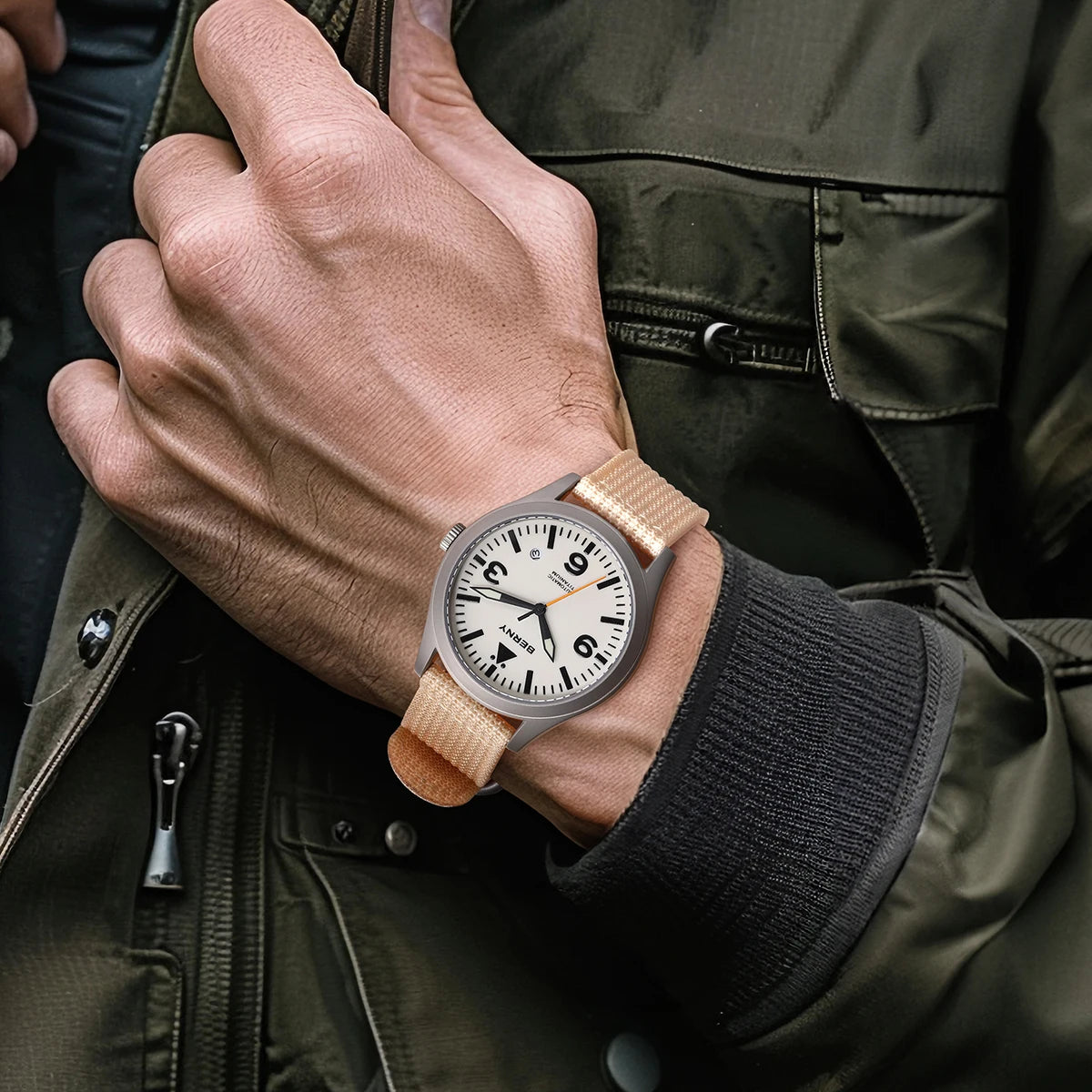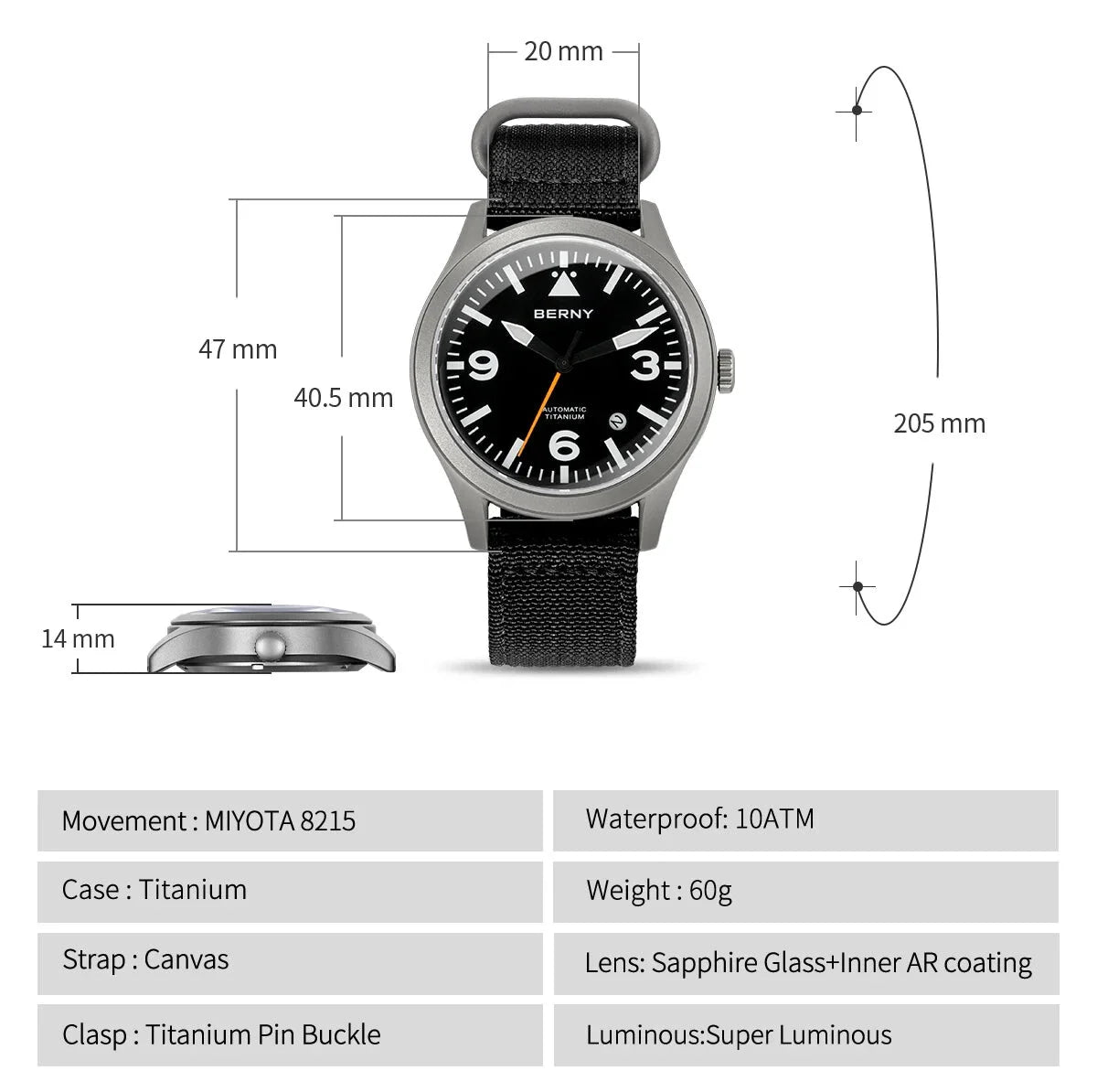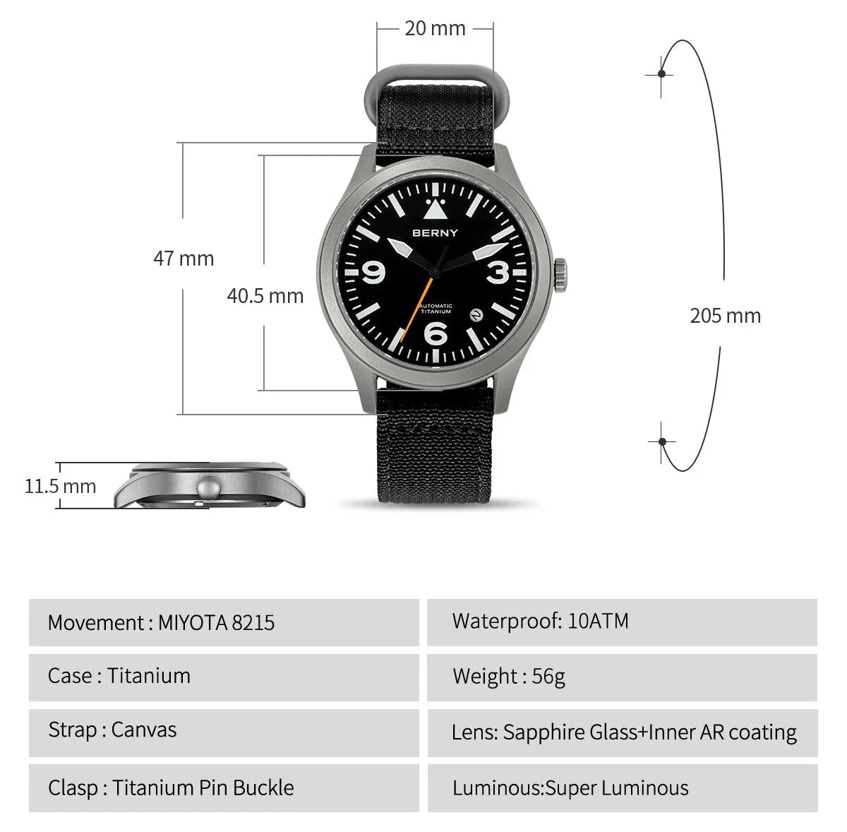 Designed with titanium and canvas straps, offering both durability and style, this men's watch is an epitome of style and luxury. The waterproof construction, luminous display and the AR coating make it a practical accessory for water activities and casual wear. Its versatile design makes it a must-have addition to your watch collection.