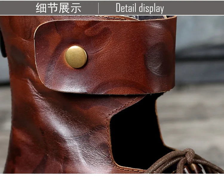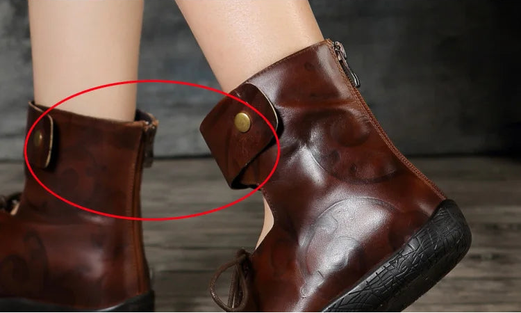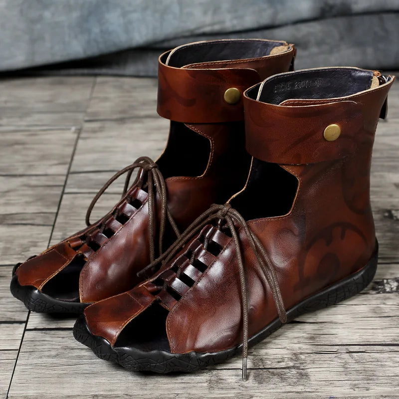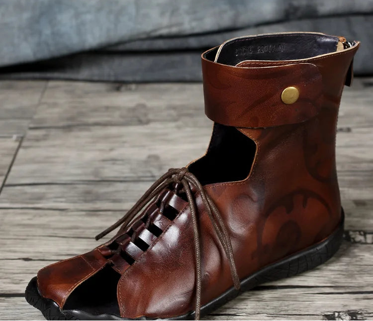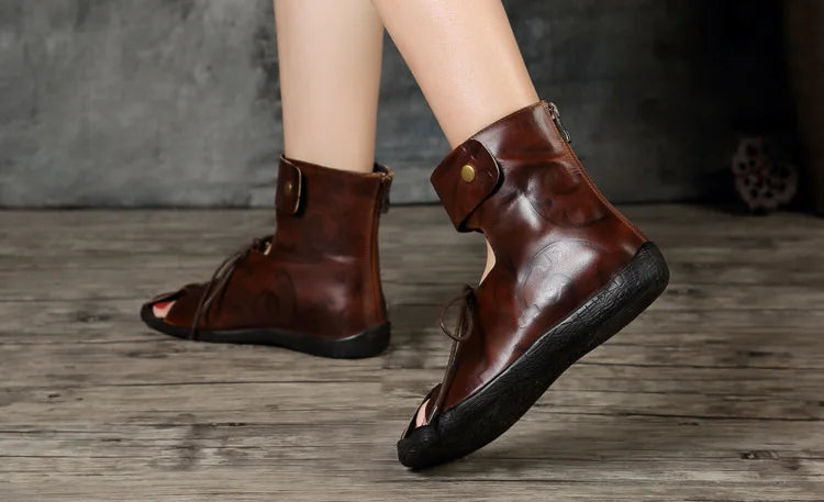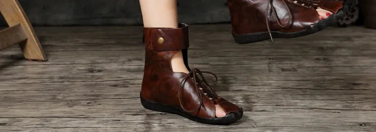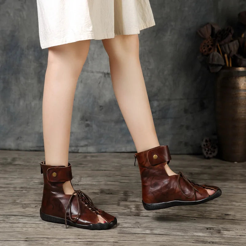 Women's Summer Casual Embossed Cowhide Sandals with Front Lace and Back Zipper