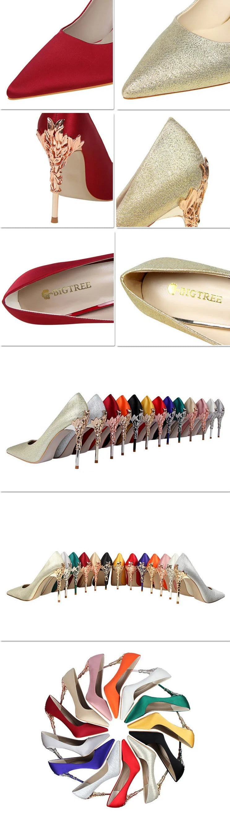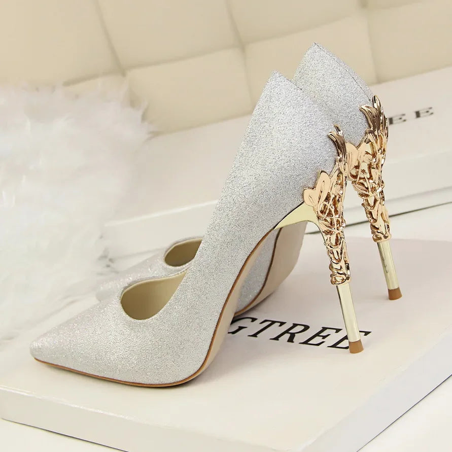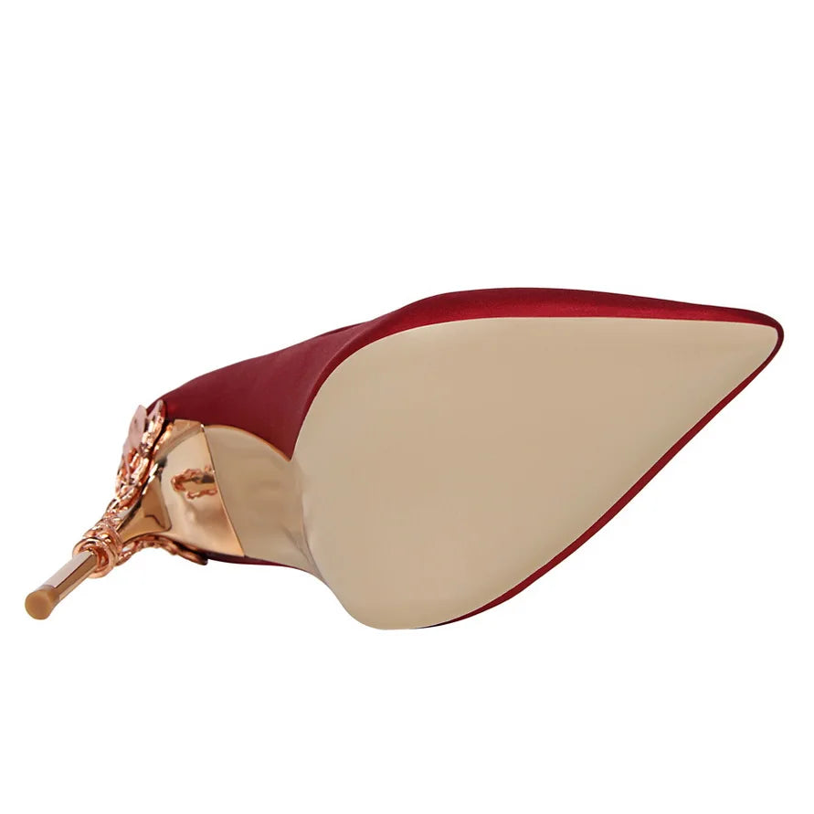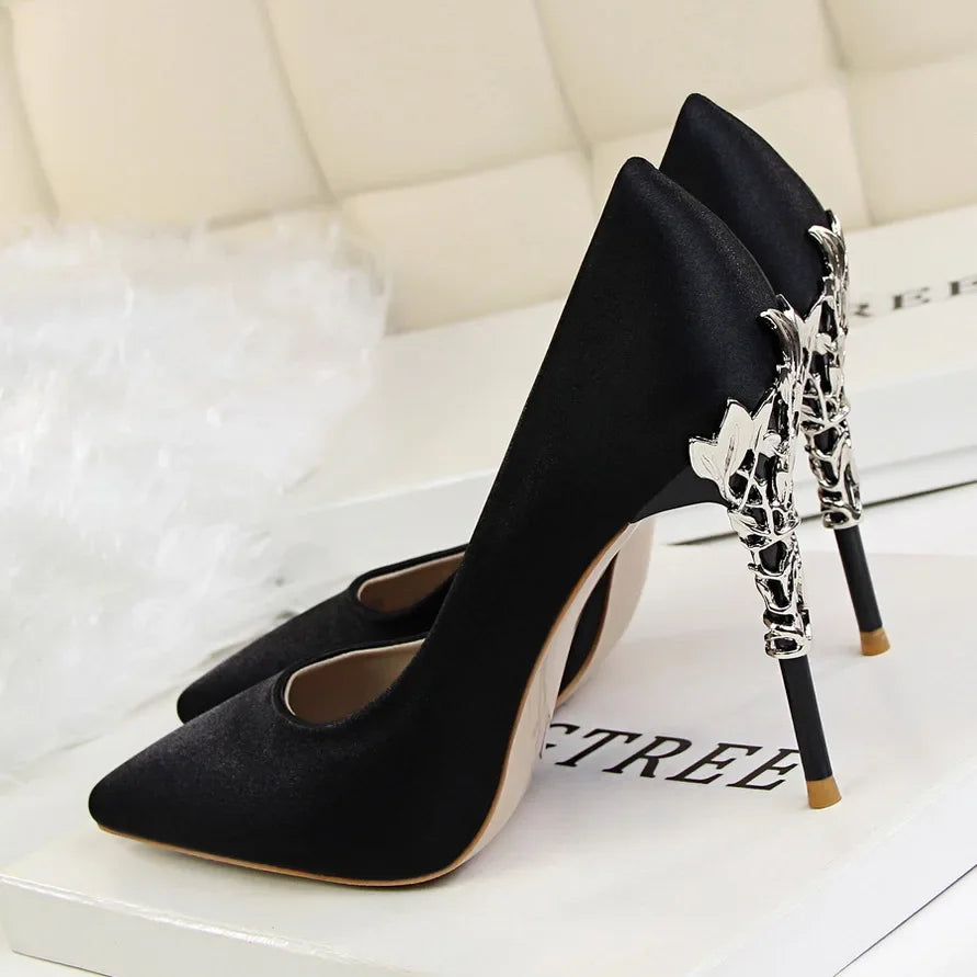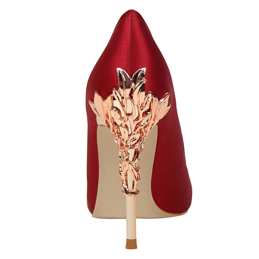 Wearing these sexy women's pumps with your favorite party outfit adds extra style points to your stylish look. The sleek design with a silk upper and rubber outsole makes it comfortable. Designed with super high, thin heels and pointed toes, these pumps are a sexy fashion accessory for fashionistas. To top it all, the metallic decoration in the heels gives you a much more chic look. It offers both practicality and elegance!