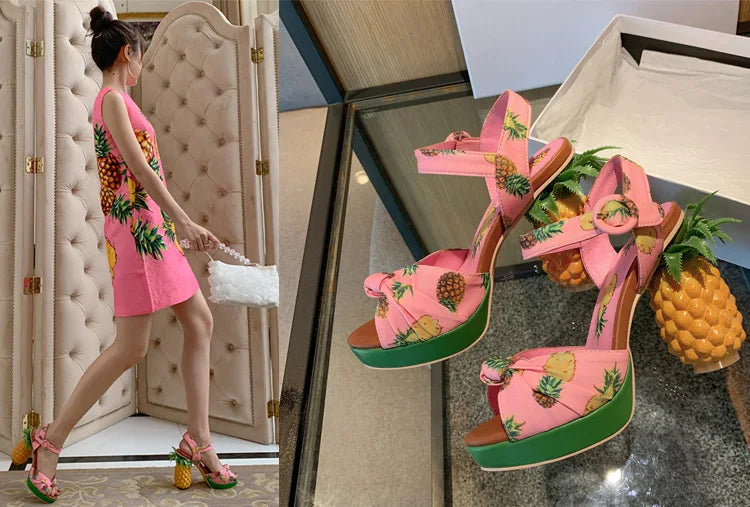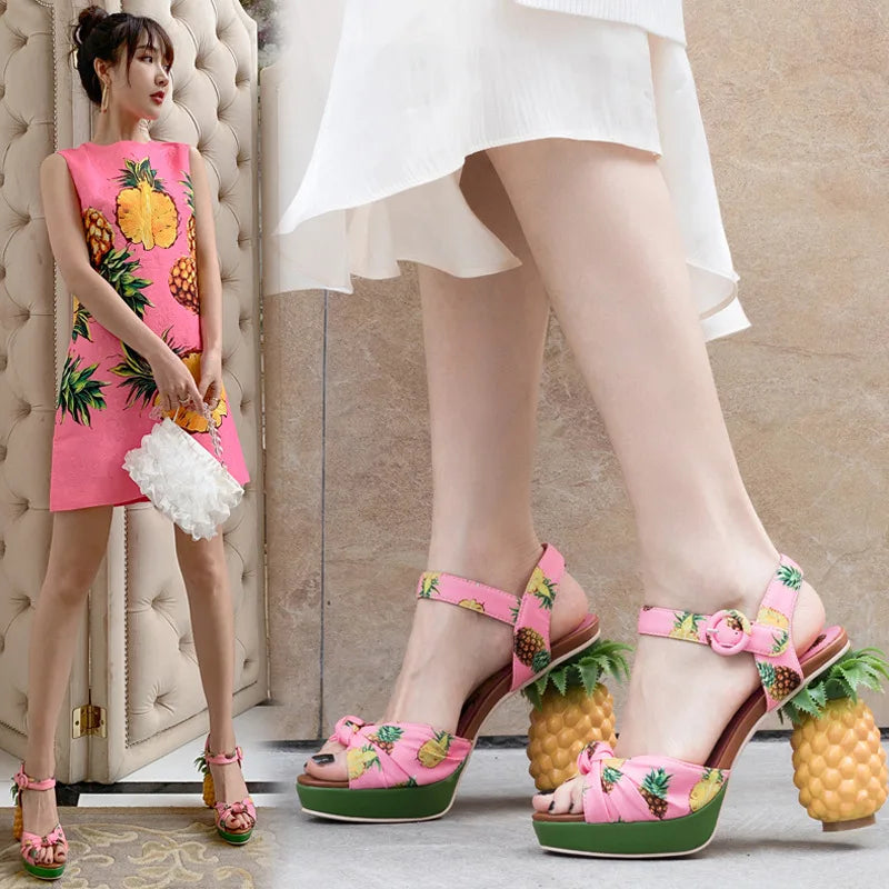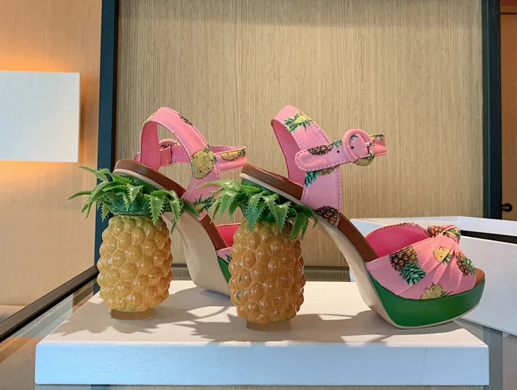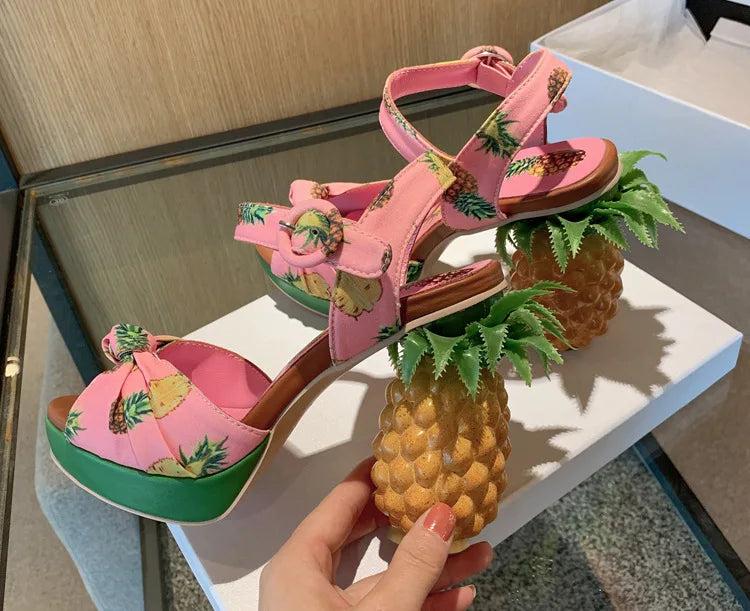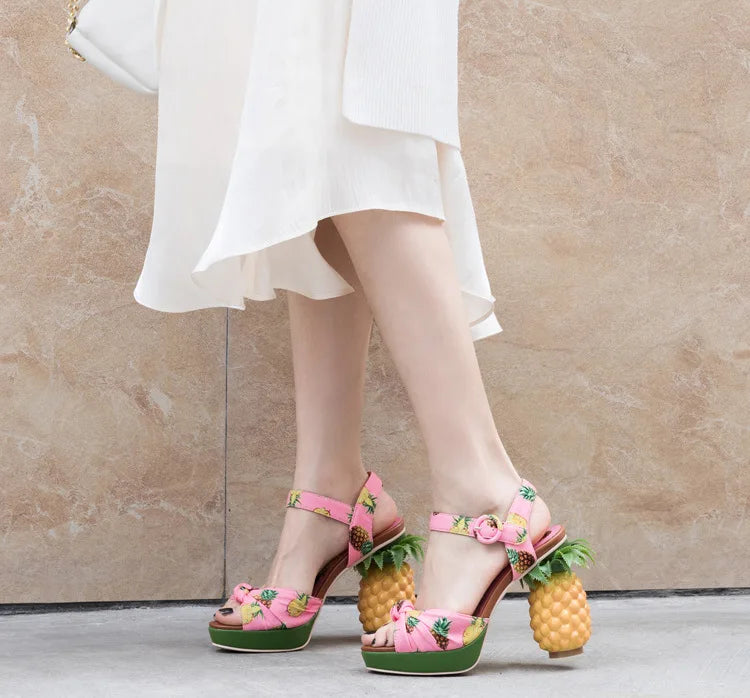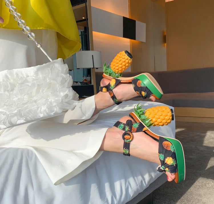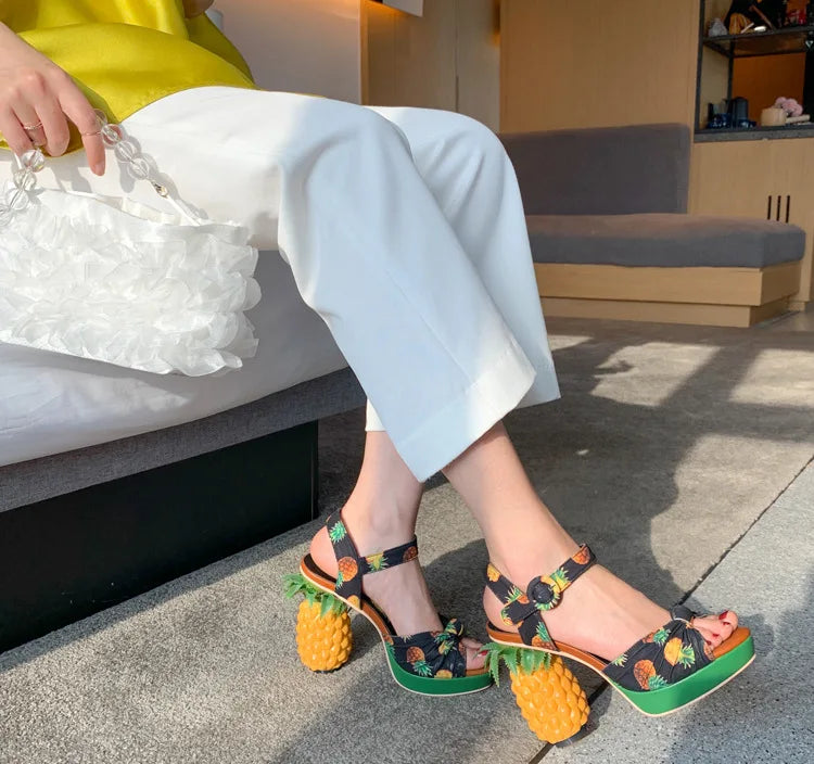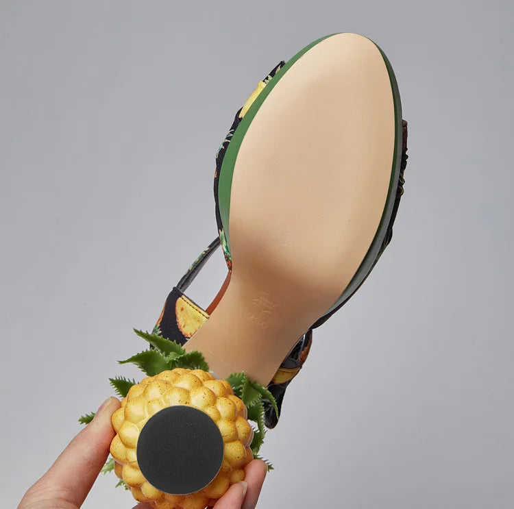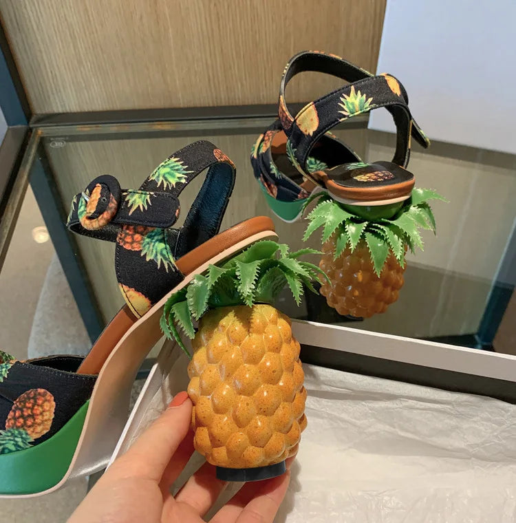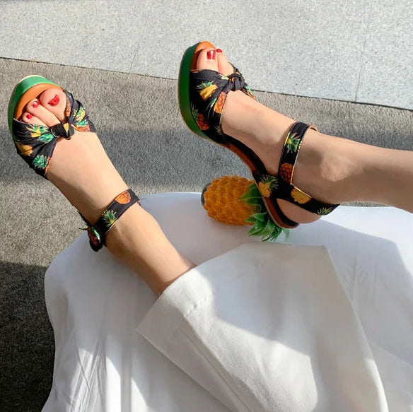Summer Pineapple Print High-heel Buckle Strap Open-toe Sandals for Women
