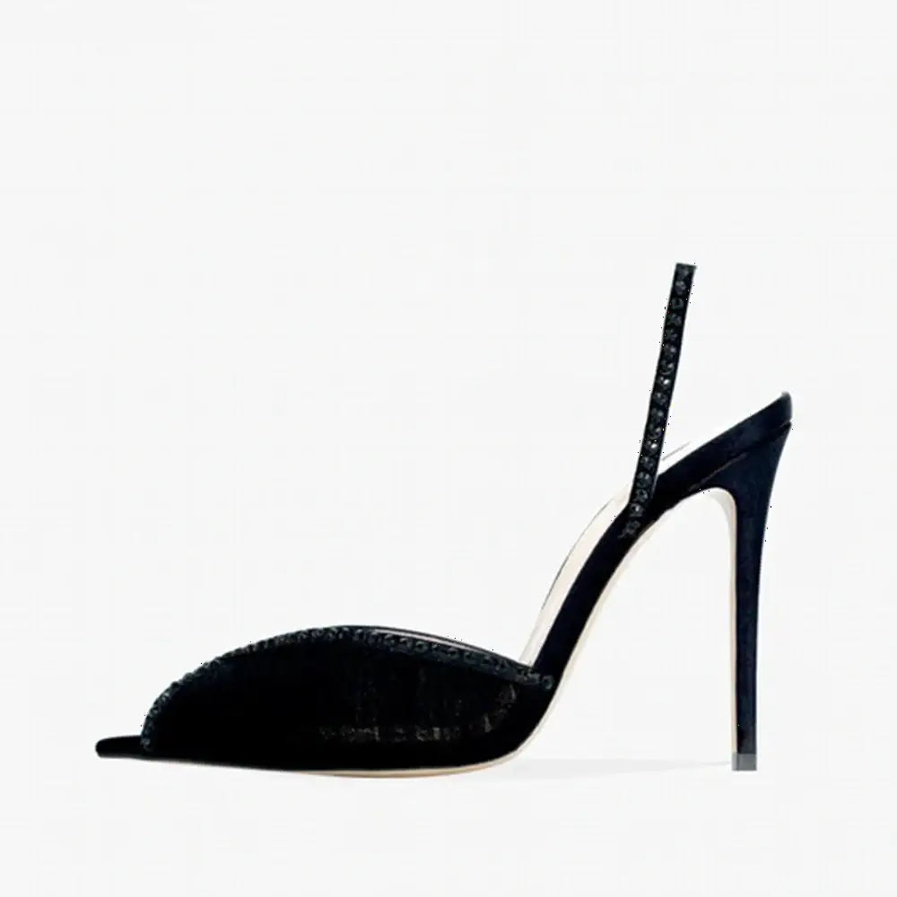 Women's Black Crystal Mesh Peep Toe Shallow Pointed Thin High Heeled Stilettos Pumps