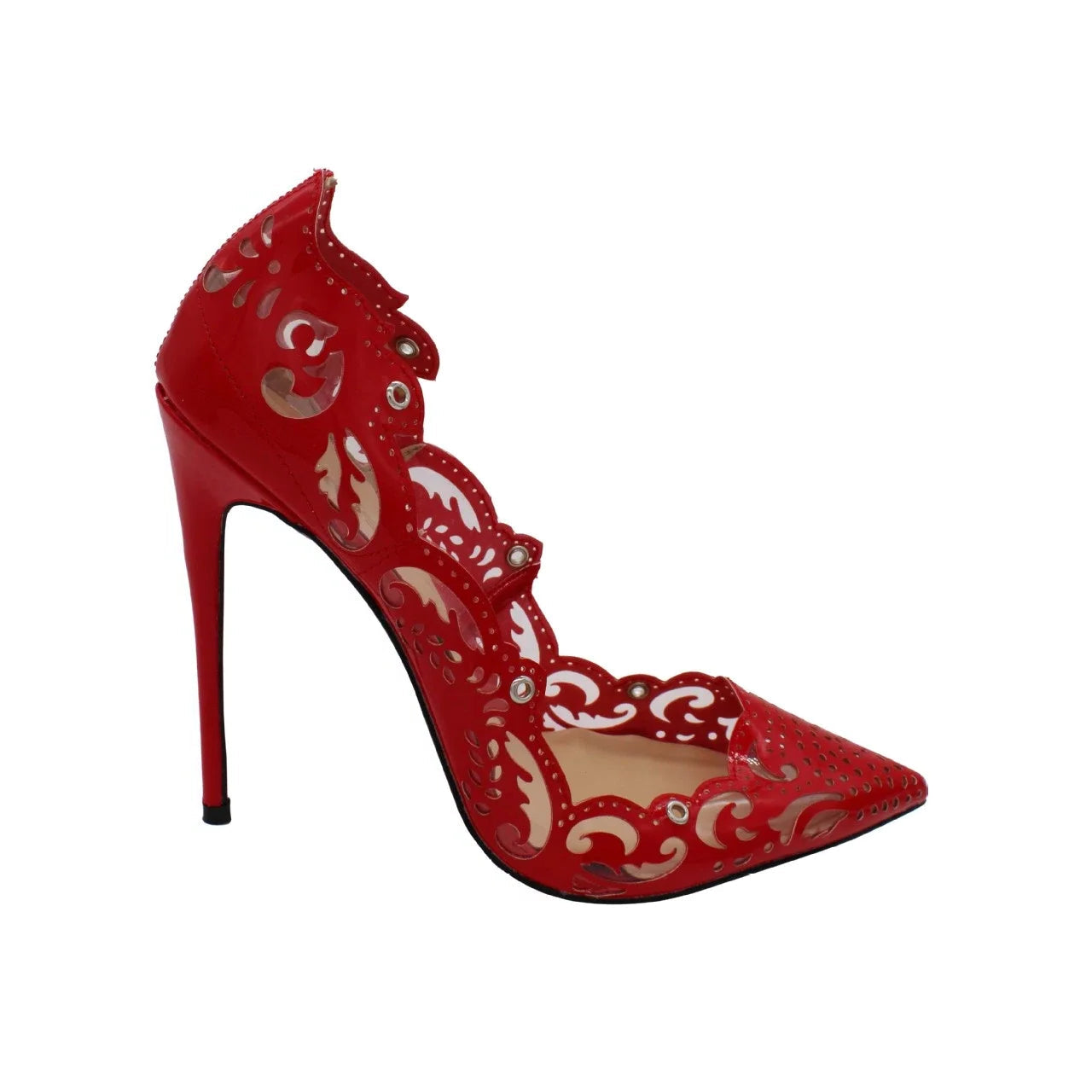 Women's Red Leather Carved Flowers High Heels Lace-up Pointed Toe Pumps
