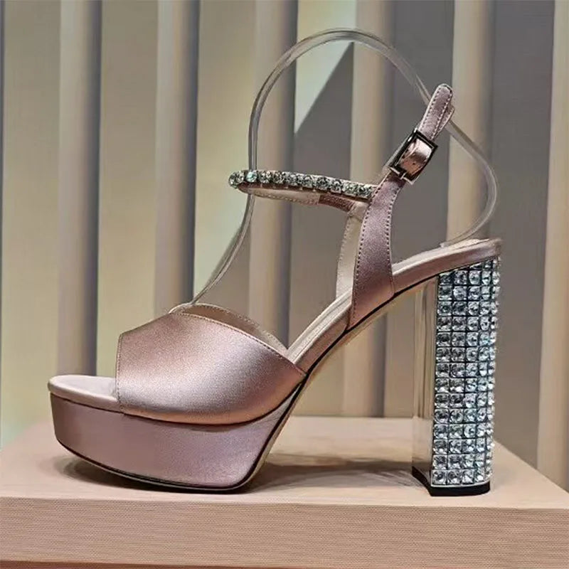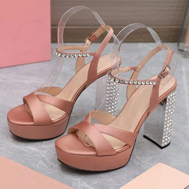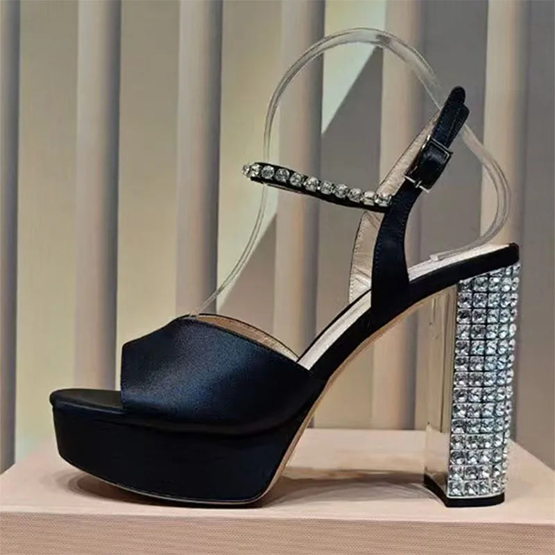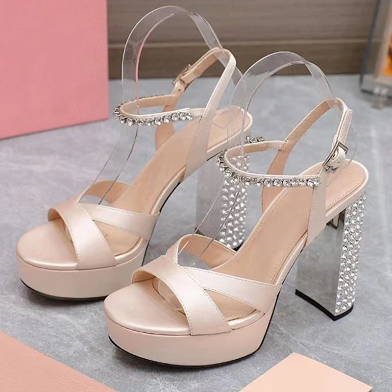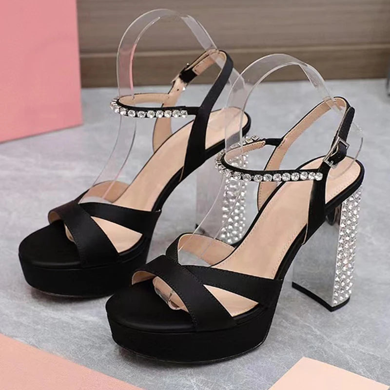 Women's Summer Rhinestone Studded Chunky Super High Heels Party Sandals
