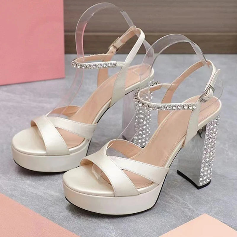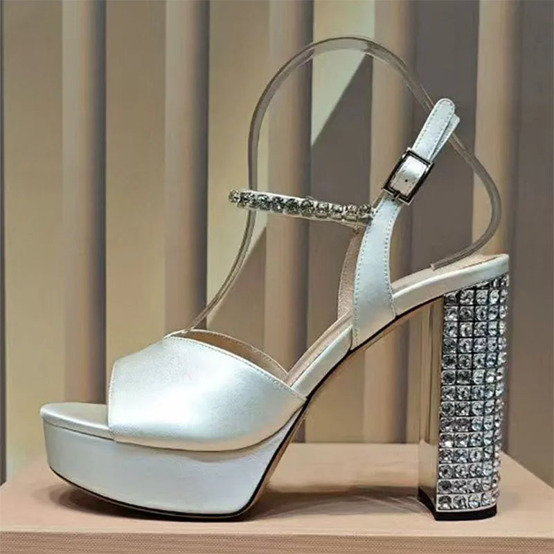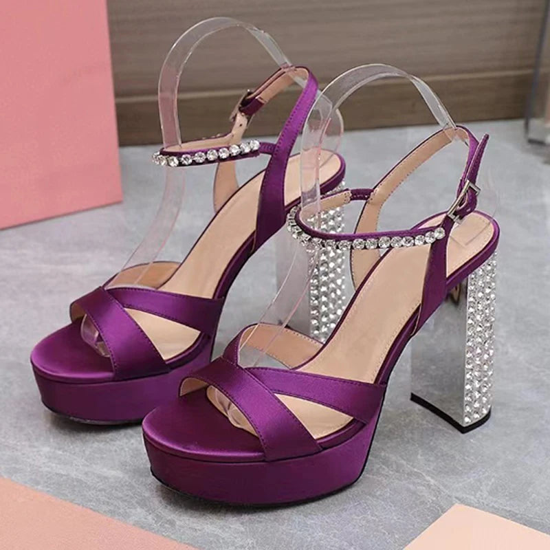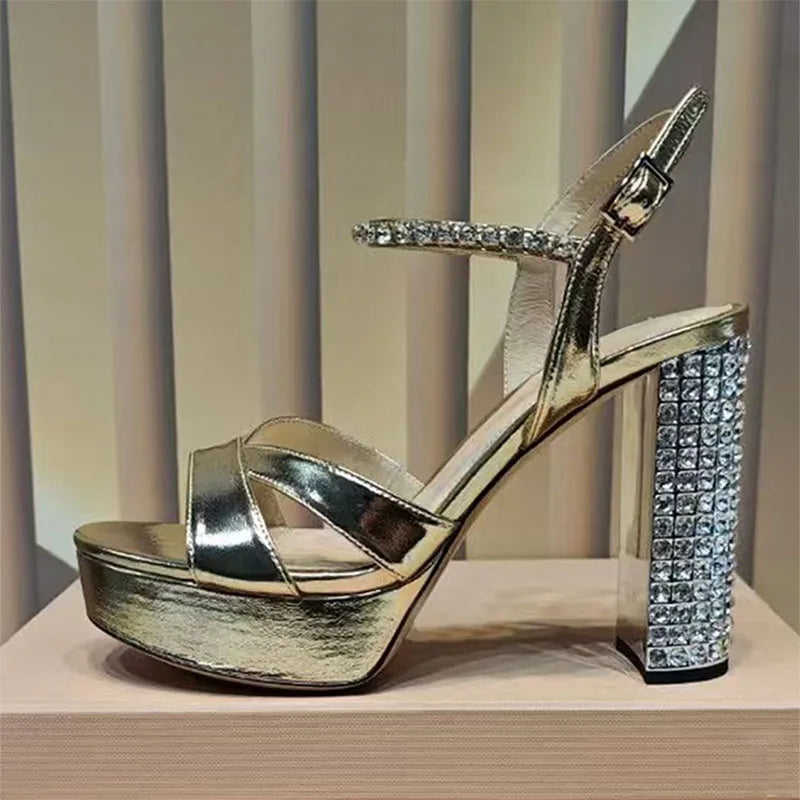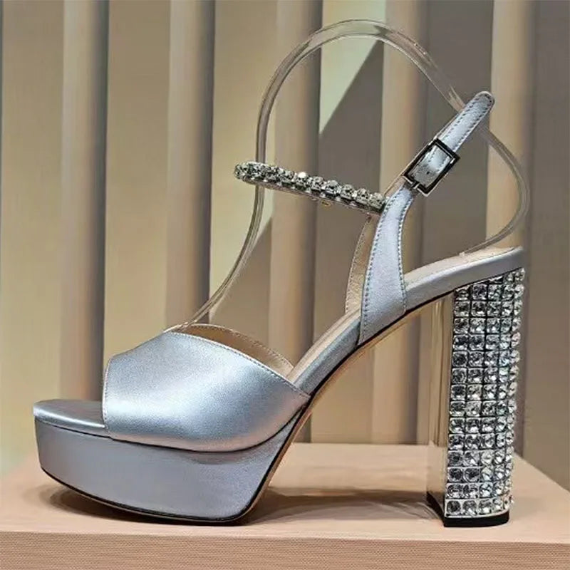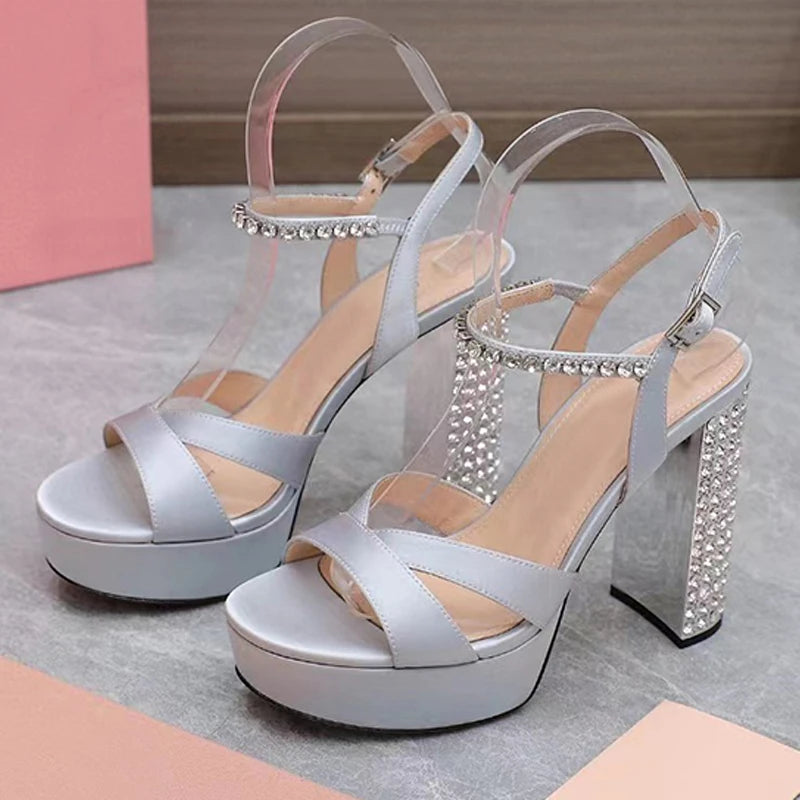 Women's Summer Rhinestone Studded Chunky Super High Heels Party Sandals