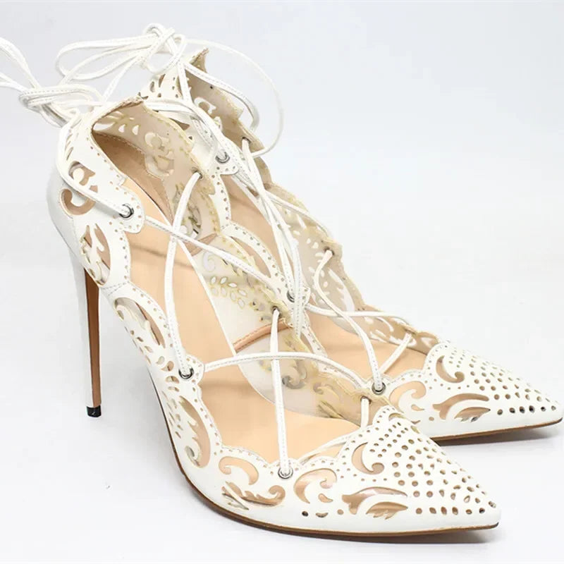Women's White Leather Carved Flowers High Heels Lace-up Pointed Toe Pumps