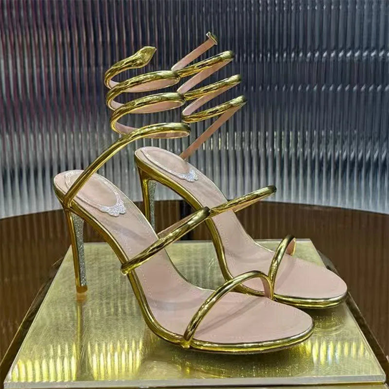 Yellow Gold Summer Snake Twine Ankle Strap High Heels Gladiator Sandals for Women