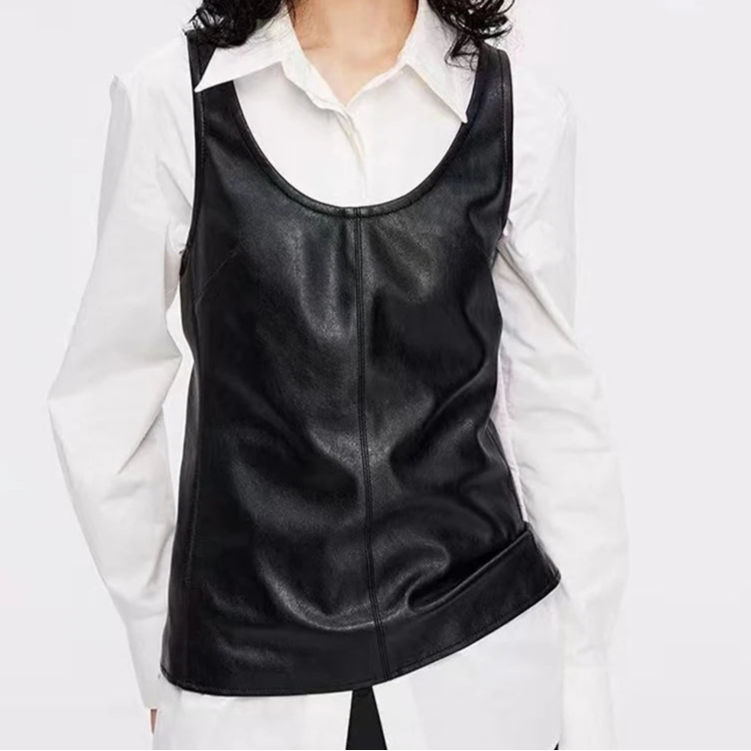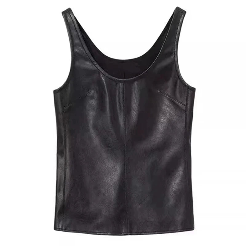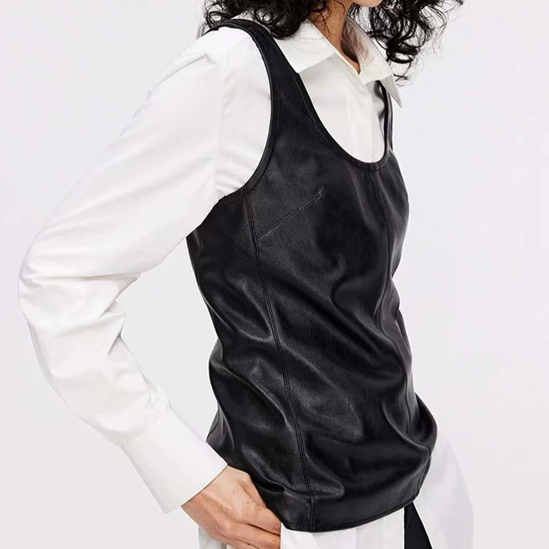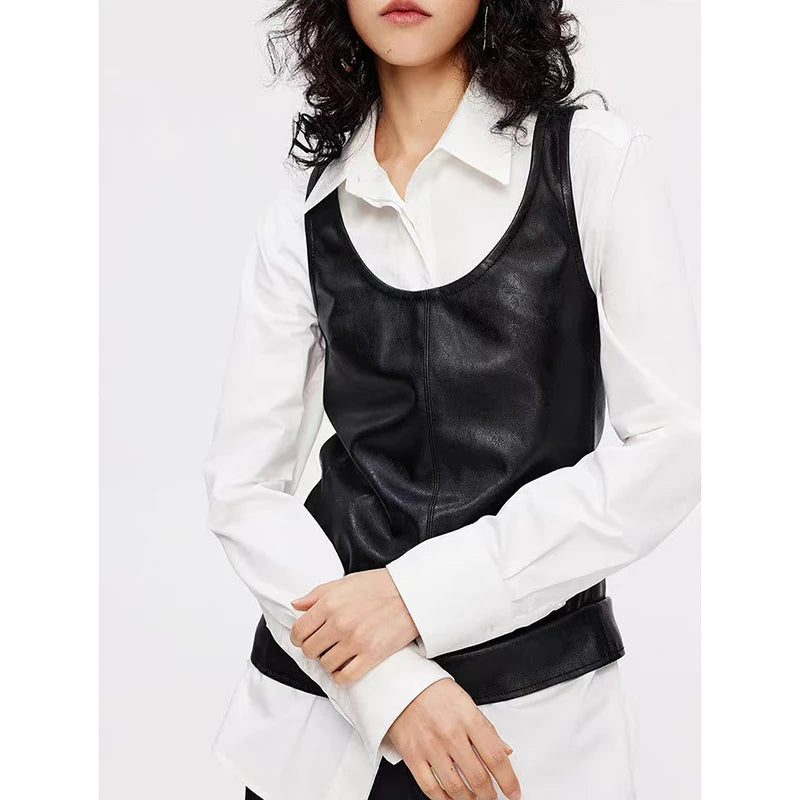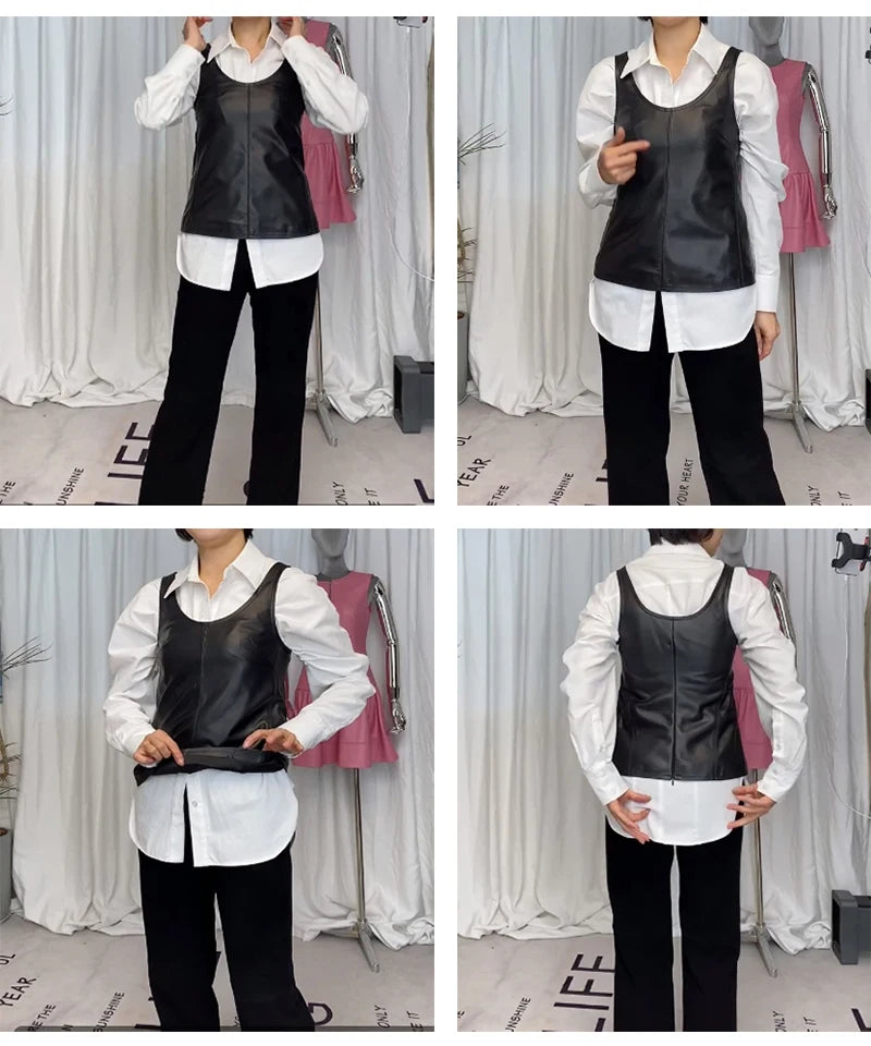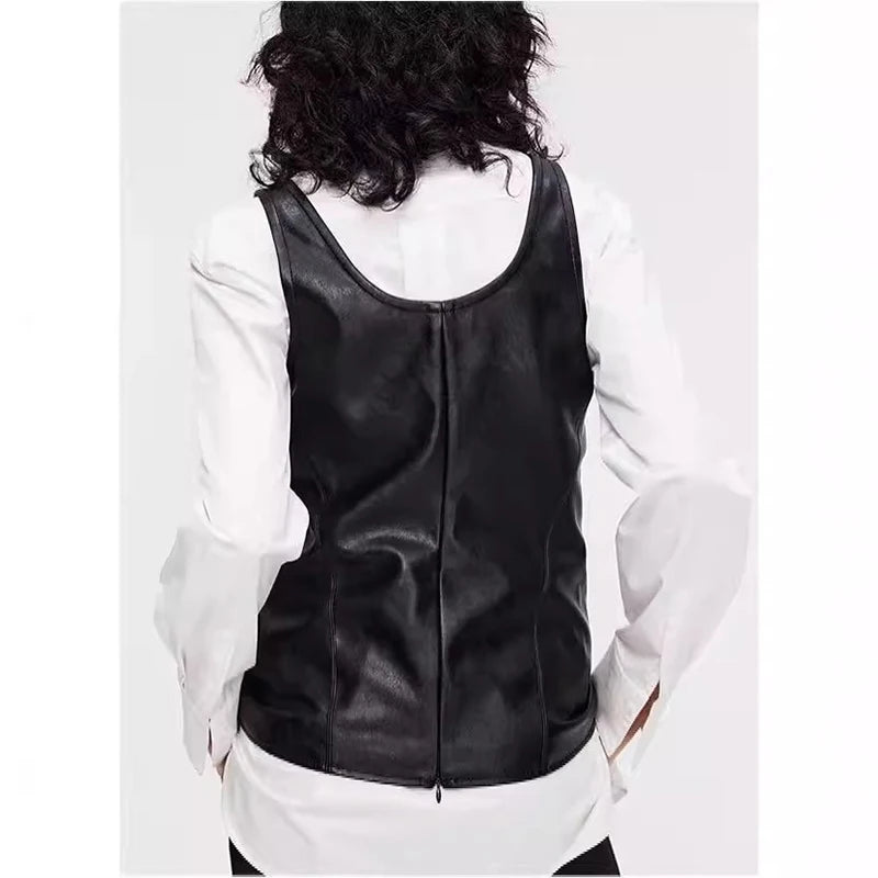 Spring Summer Casual Fashion Sheepskin Leather Slim Waistcoat Vest for Women