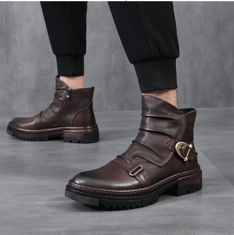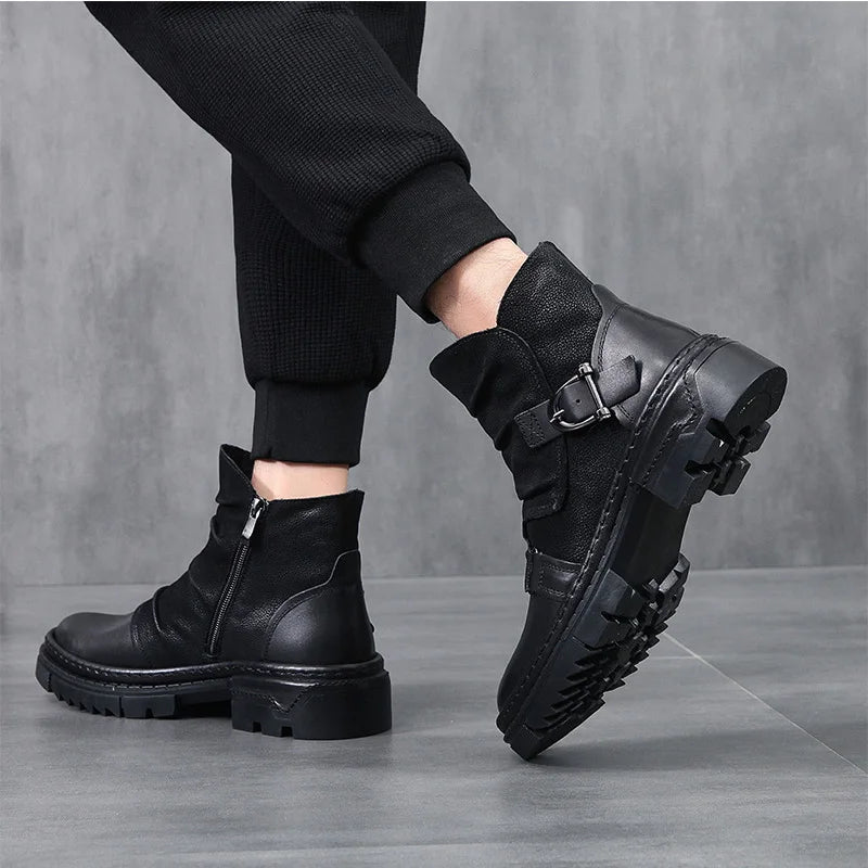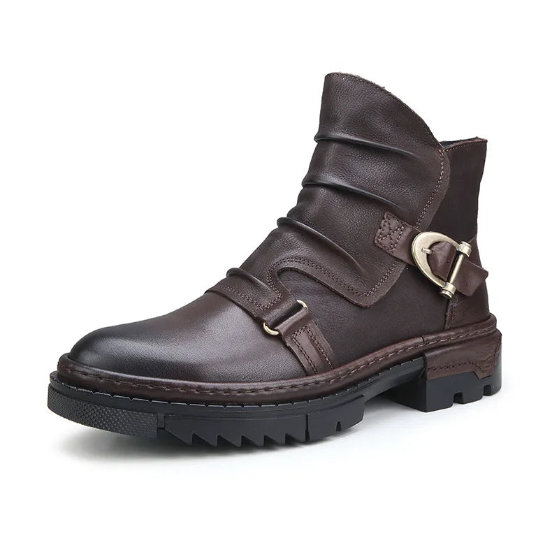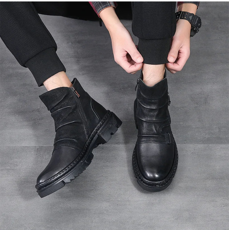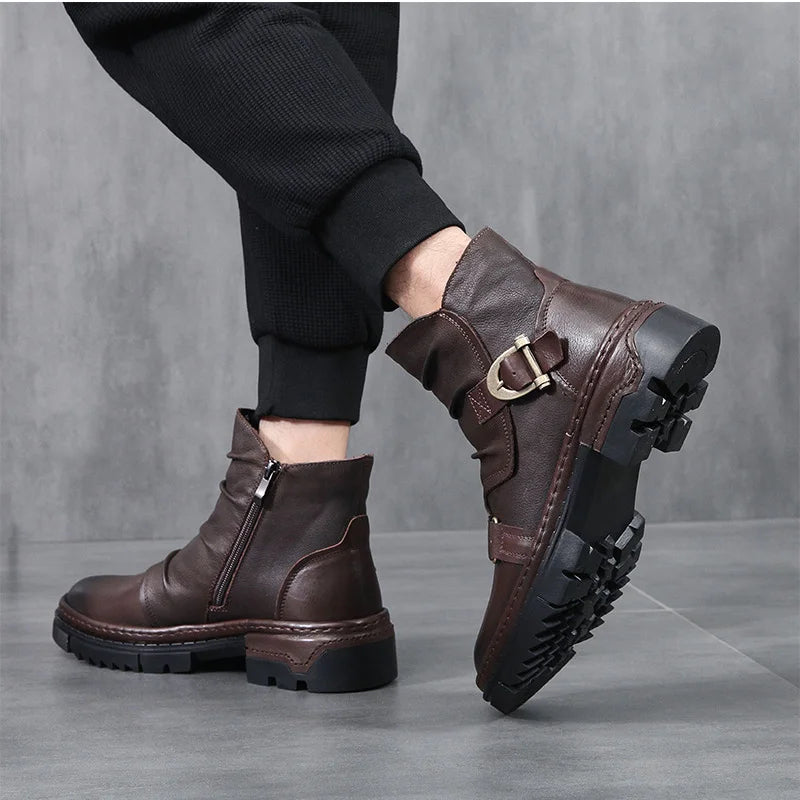 Handmade Genuine Leather Retro Fashion Buckle Zip Casual Motorcycle Riding Boots
