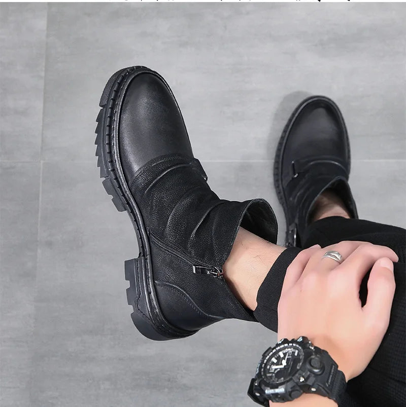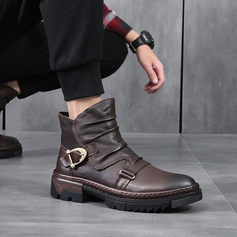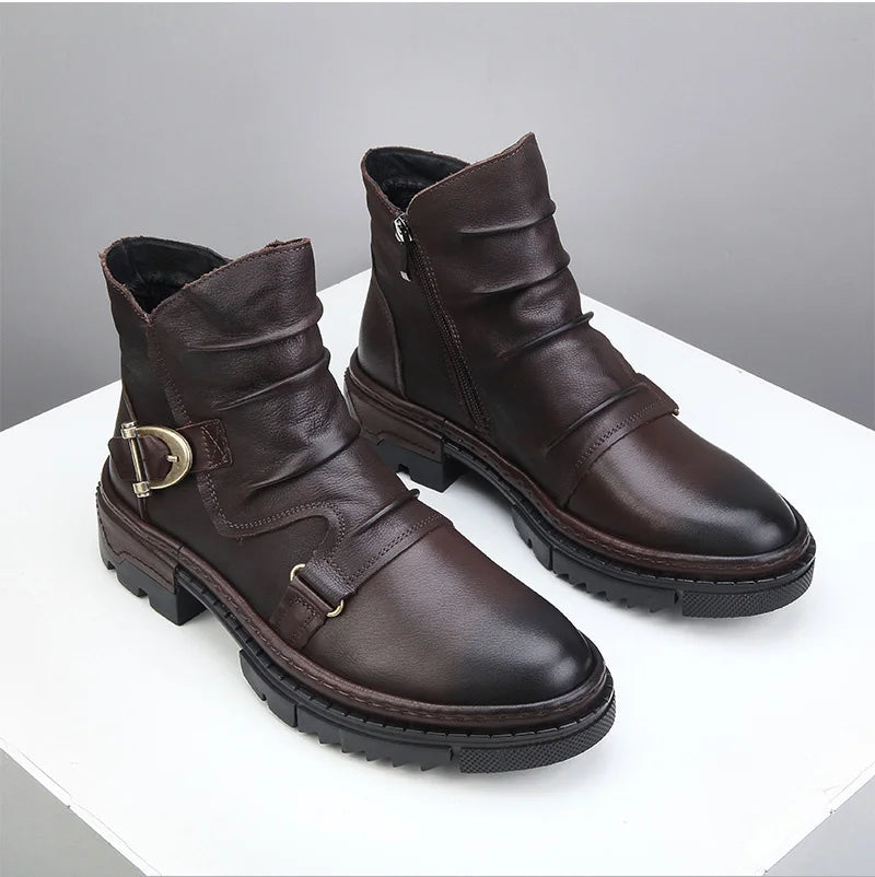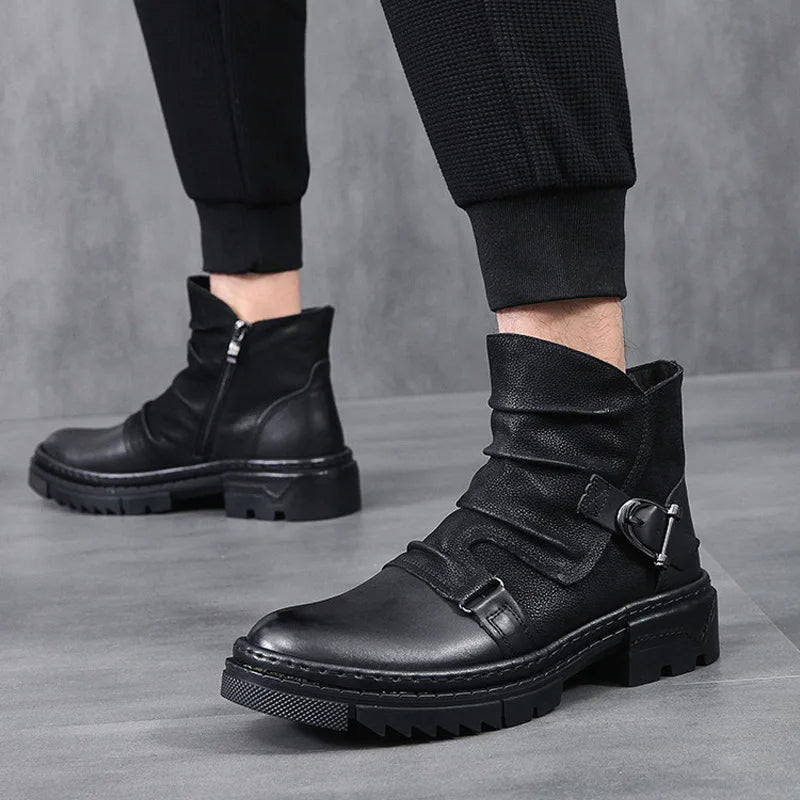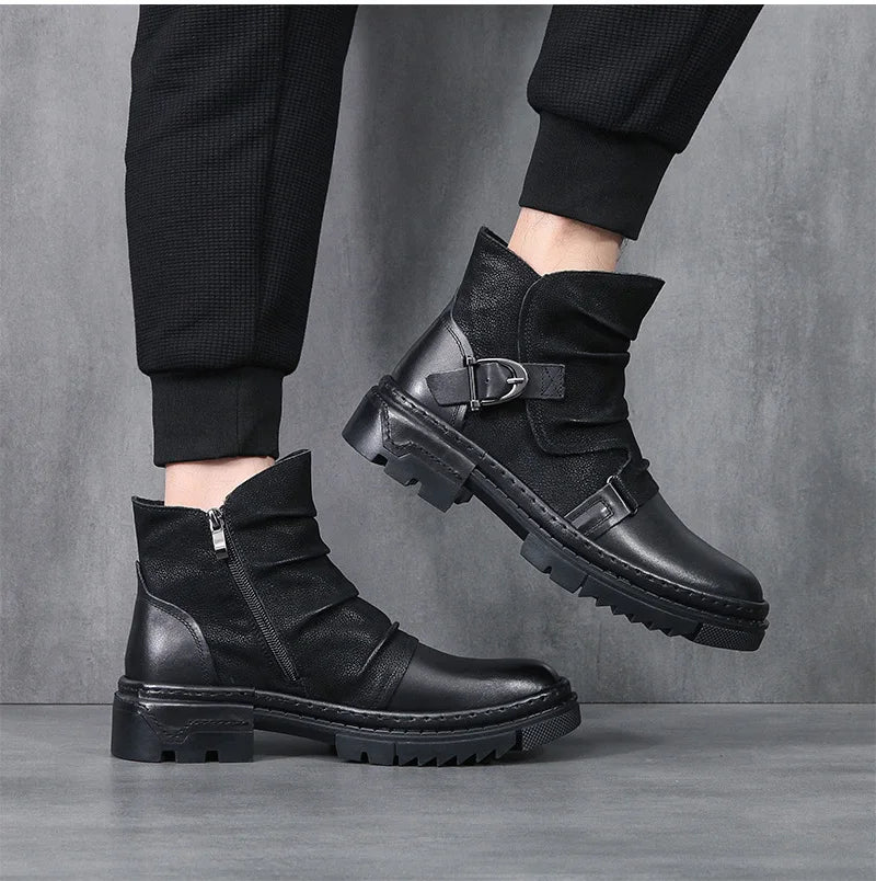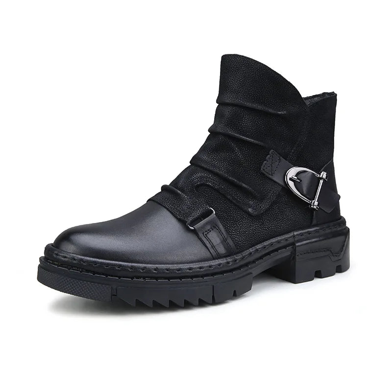 Handmade Genuine Leather Retro Fashion Buckle Zip Casual Motorcycle Riding Boots
