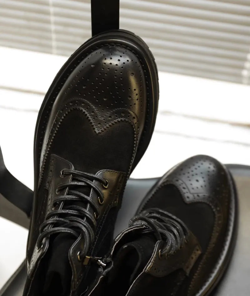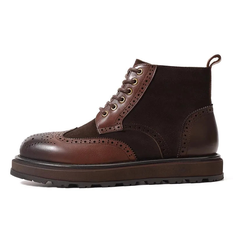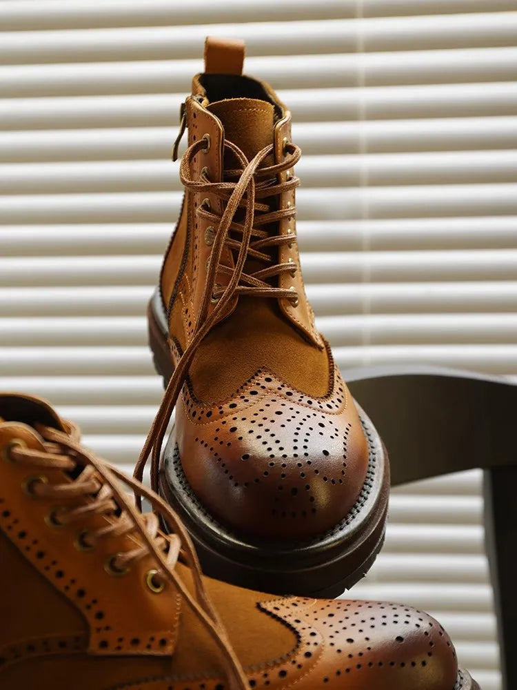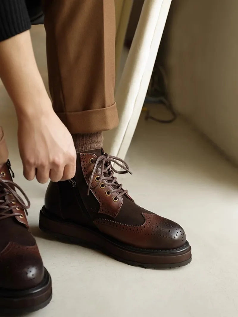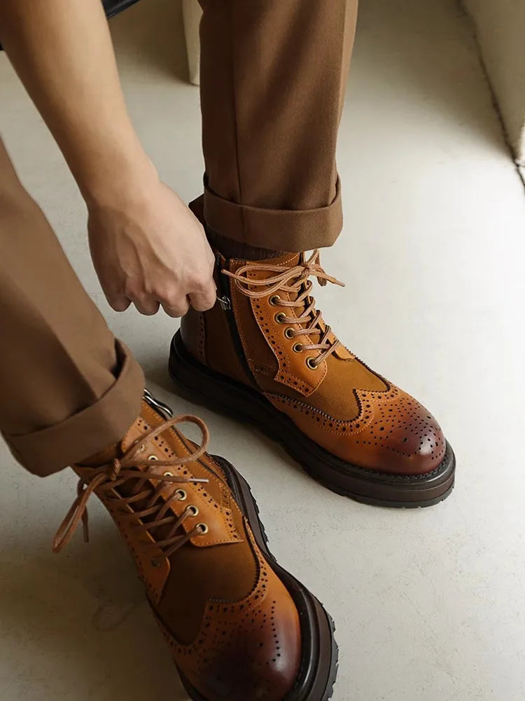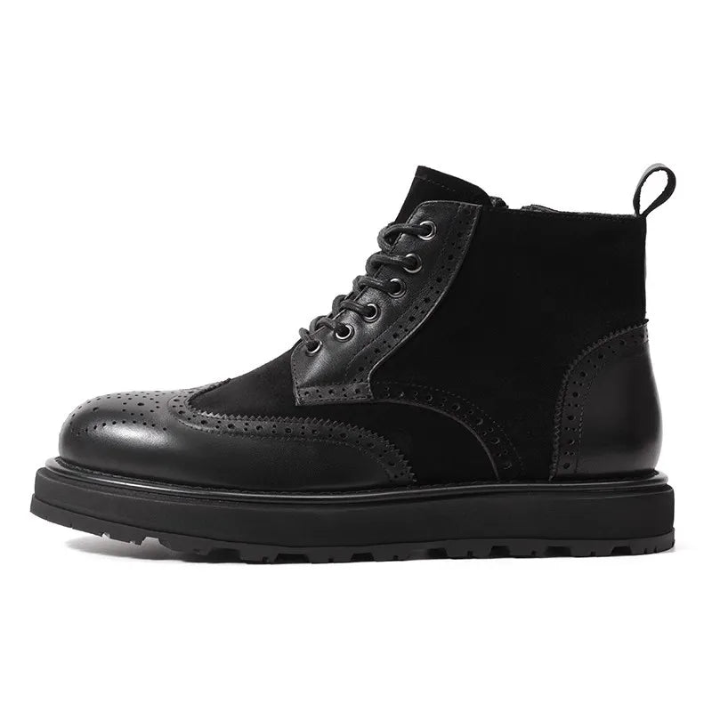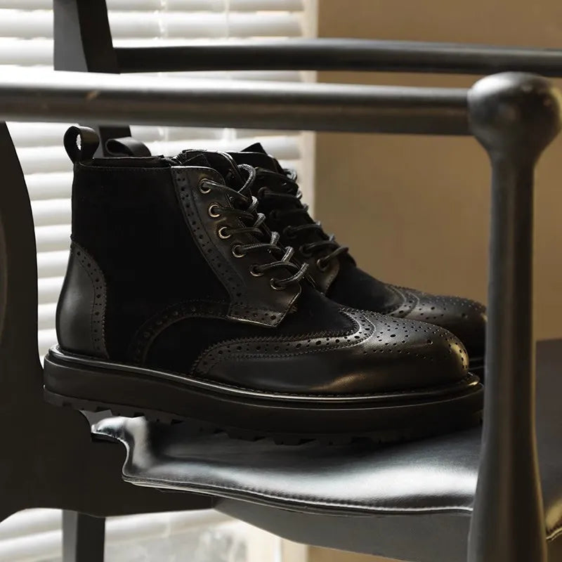 Men's British Style High Top Wing Tip Spliced Lace Up Thick Platform Business Work Ankle Boots