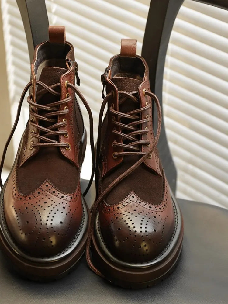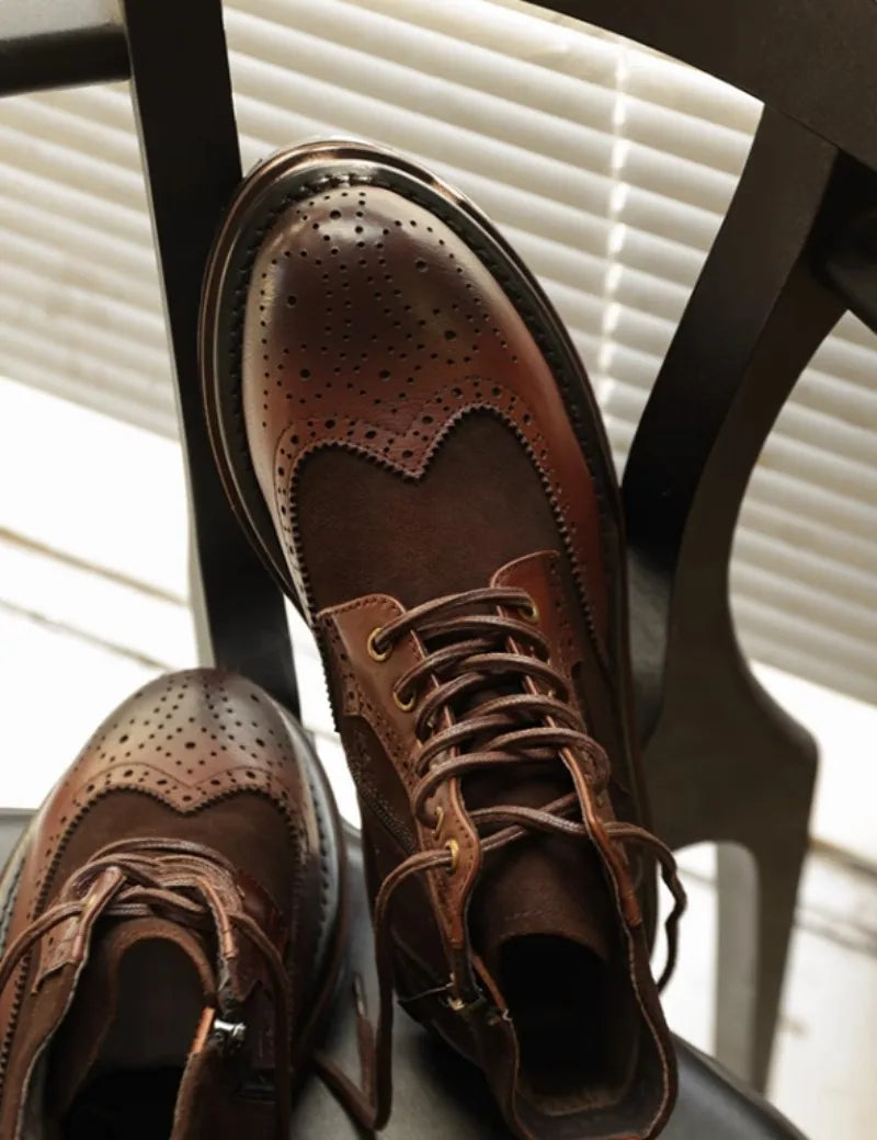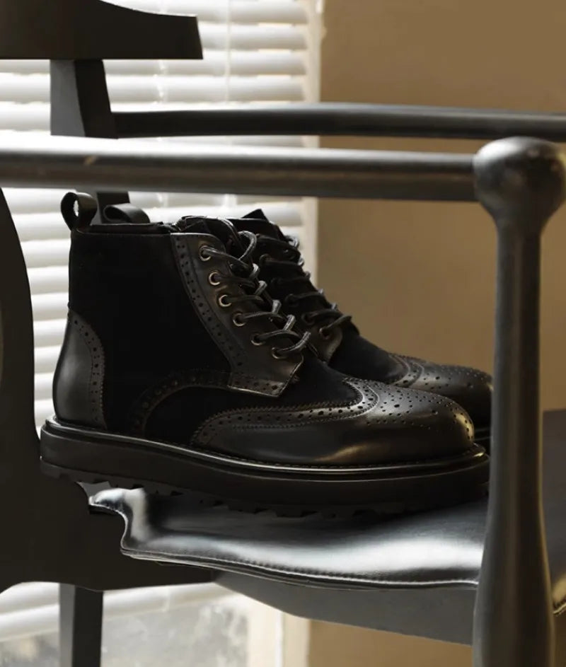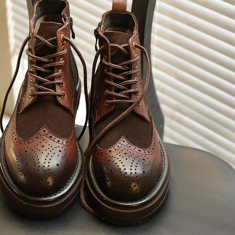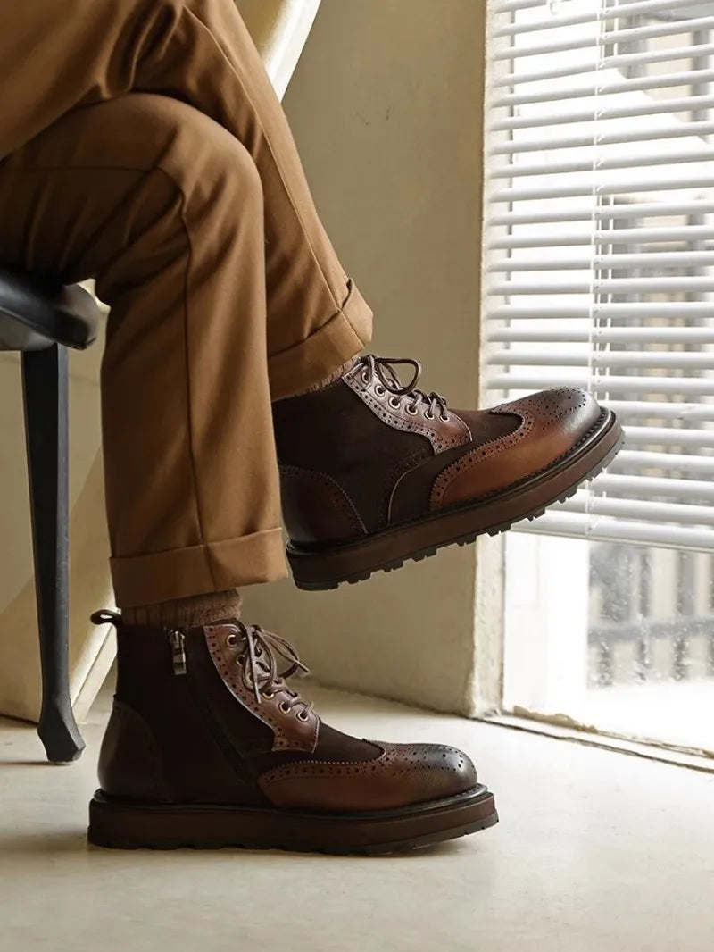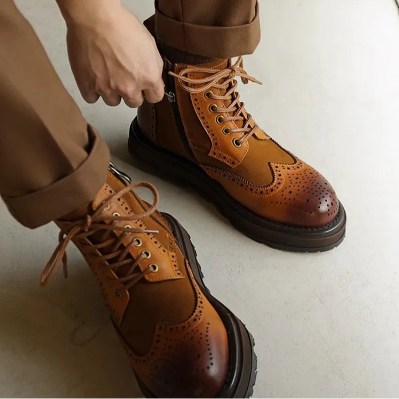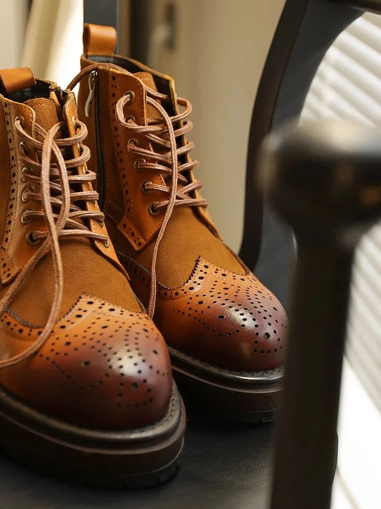 Men's British Style High Top Wing Tip Spliced Lace Up Thick Platform Business Work Ankle Boots
