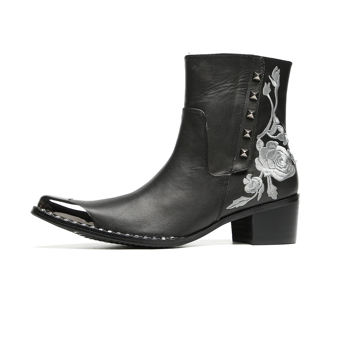 Men's Embroidered Metal Toe Rivets Retro Pattern Side Zip Chunky Heel Ankle Boots