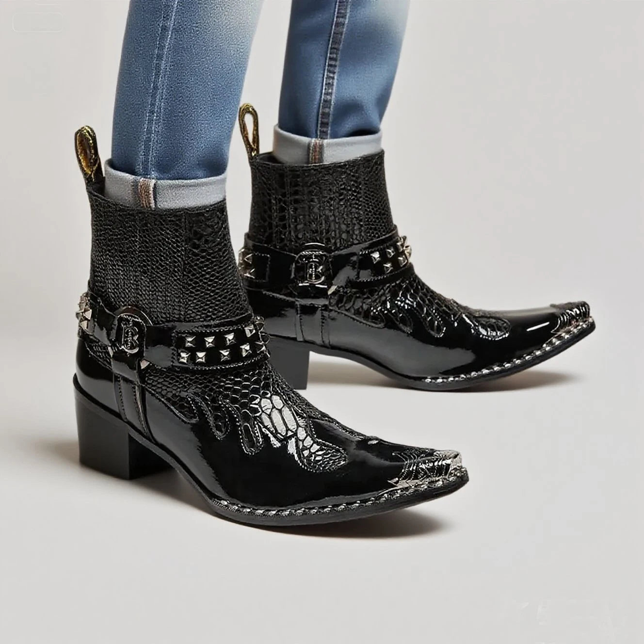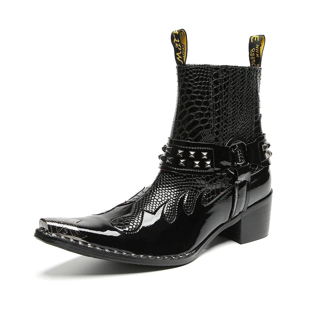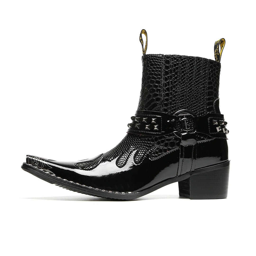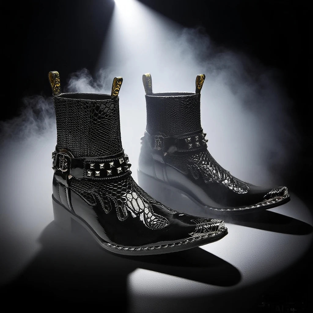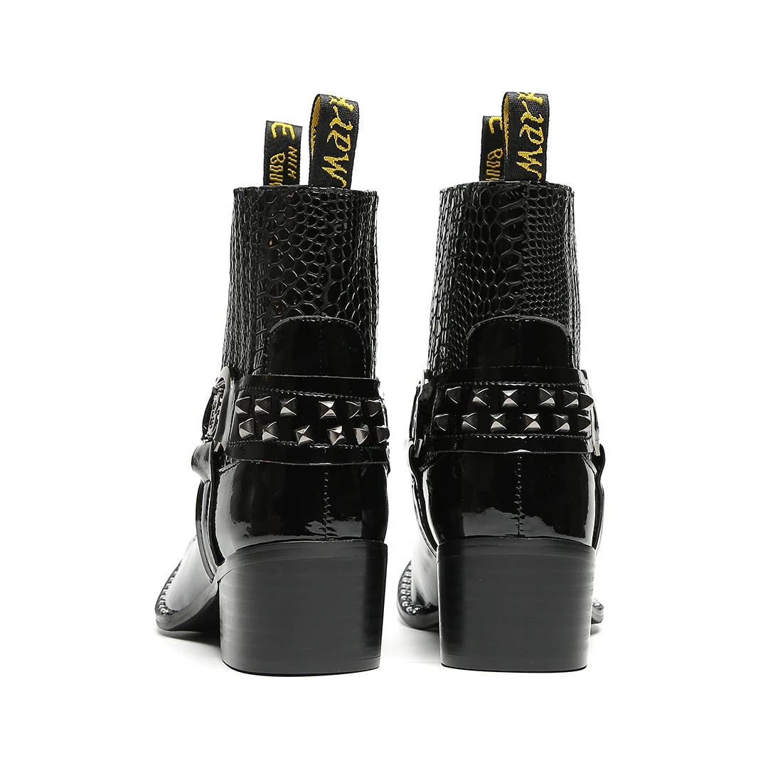 These elegant and stylish men's boots enhance your wardrobe and make you look more stylish. The sleek design with a genuine leather upper and rubber outsole makes it comfortable and durable. Designed with block heels, snakeskin pattern and studded straps, these boots are more than just a fashion accessory. Own it to enhance your wardrobe!