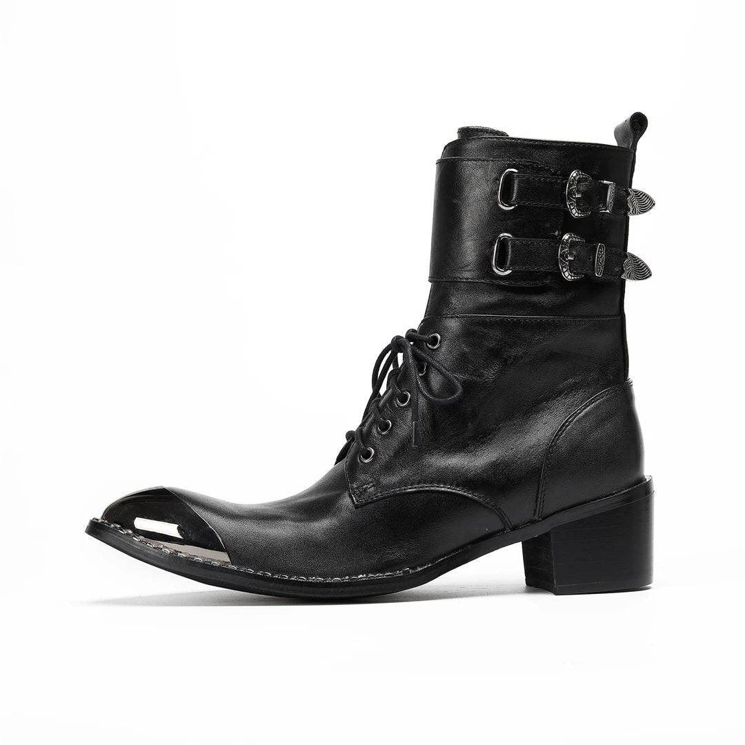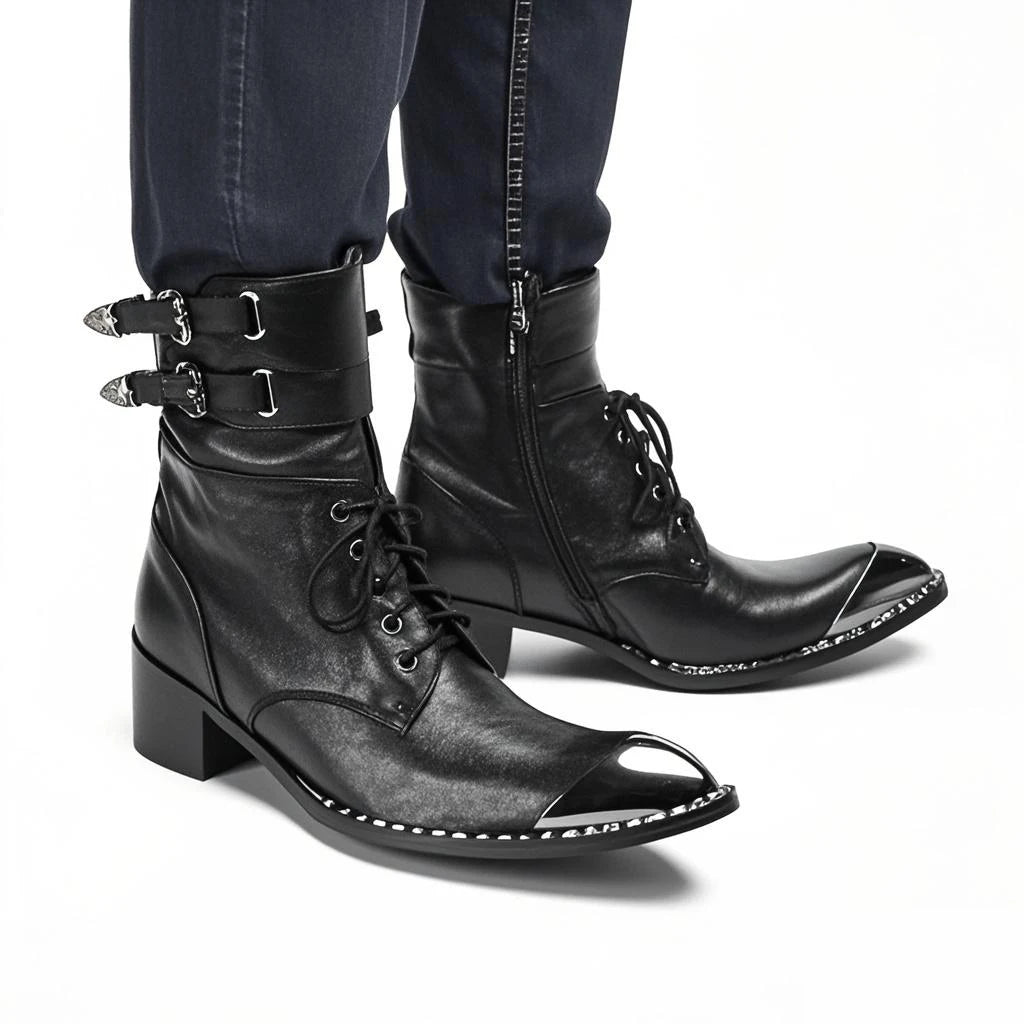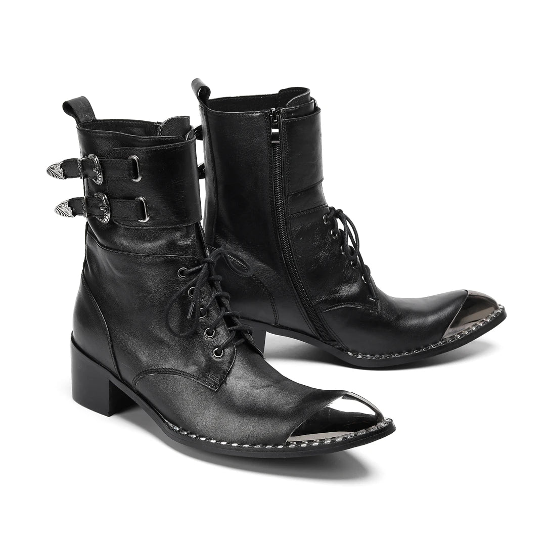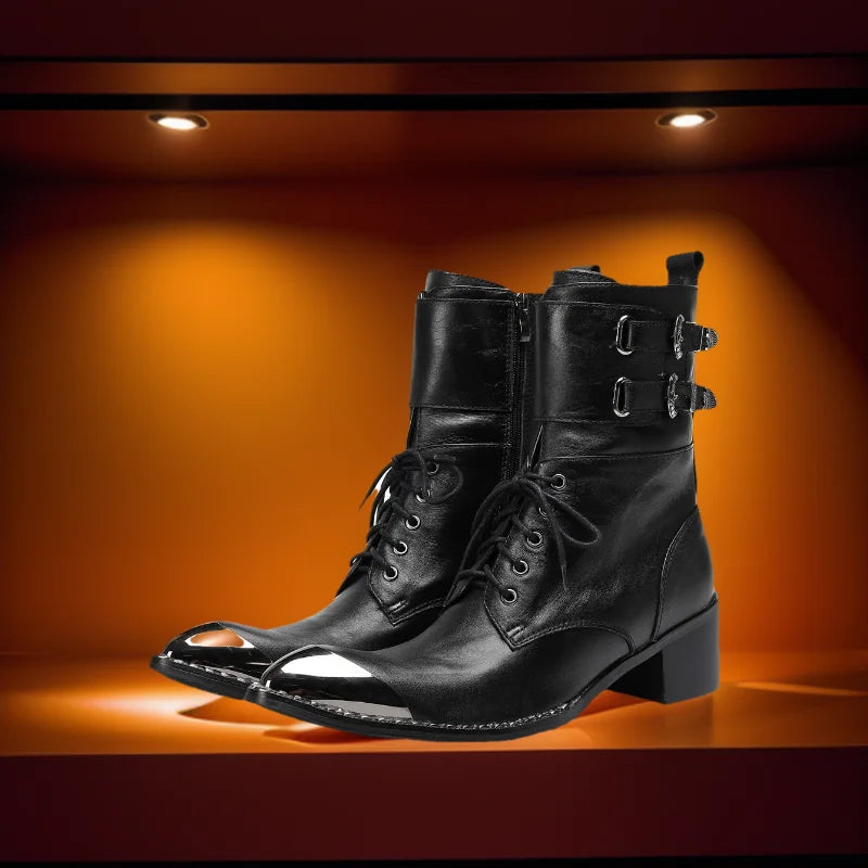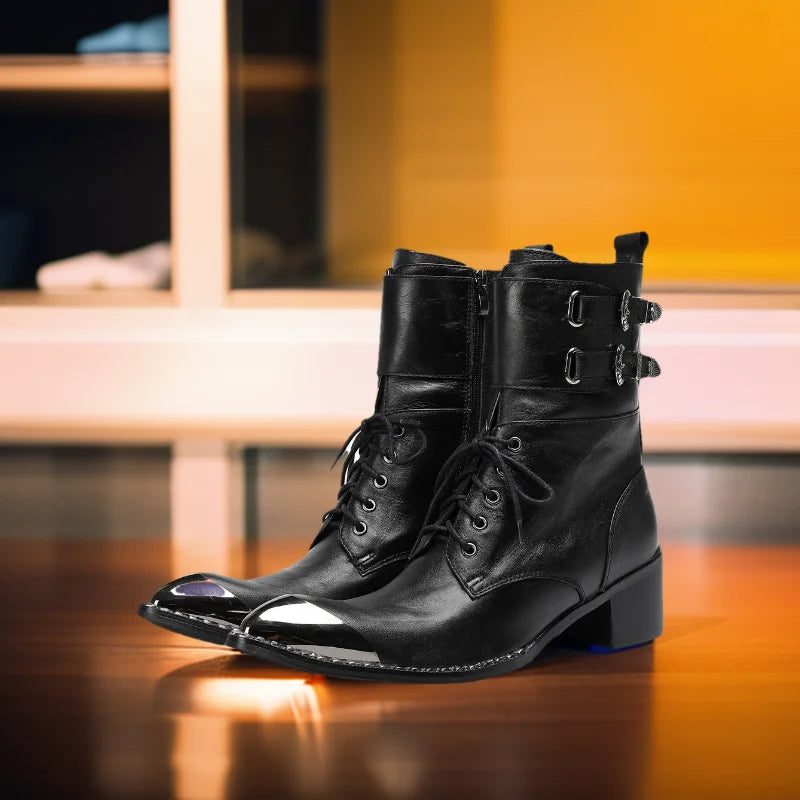 Men's Western Style Belt Buckle Pointed Toe Soft Leather Ankle Boots