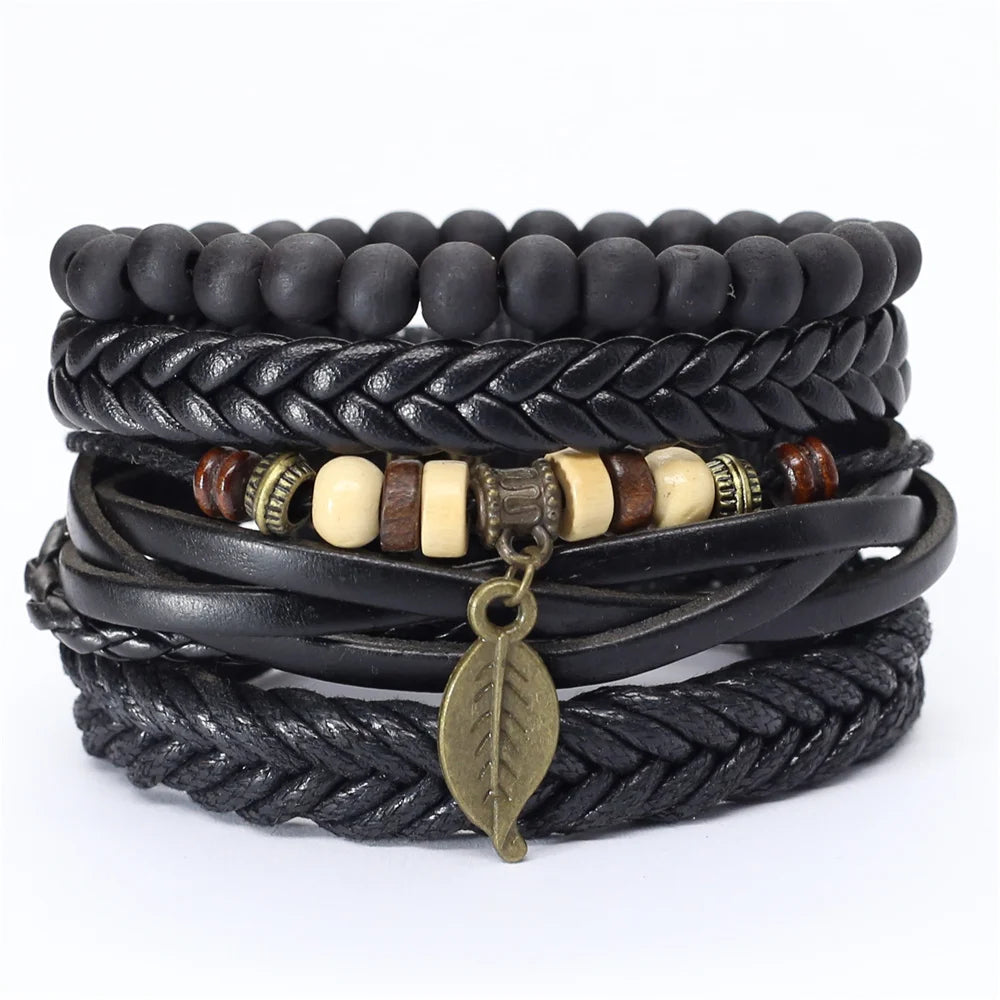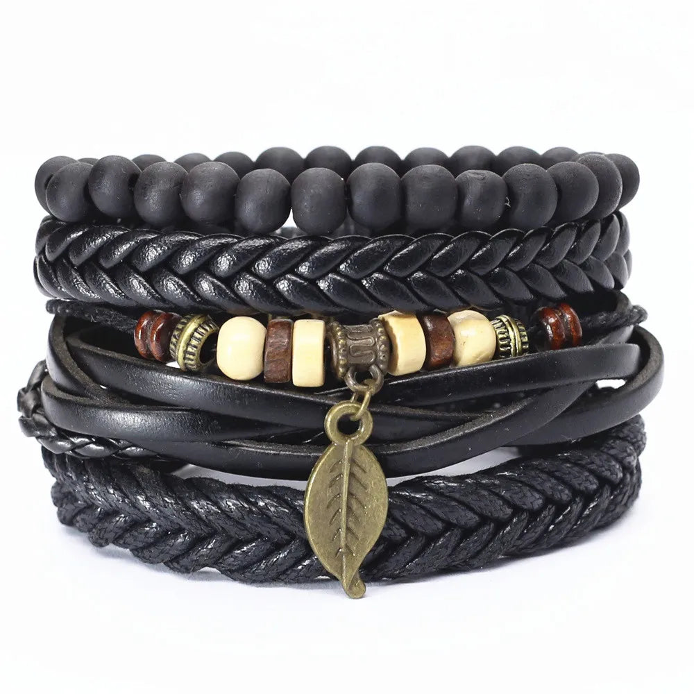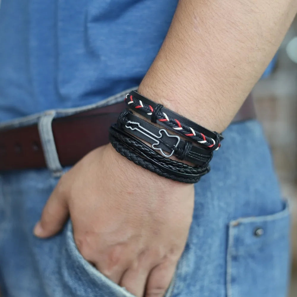 4 Pcs-per-set Guitar Leaf Charm Woven Leather Bracelet for Women and Men
