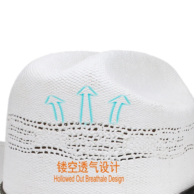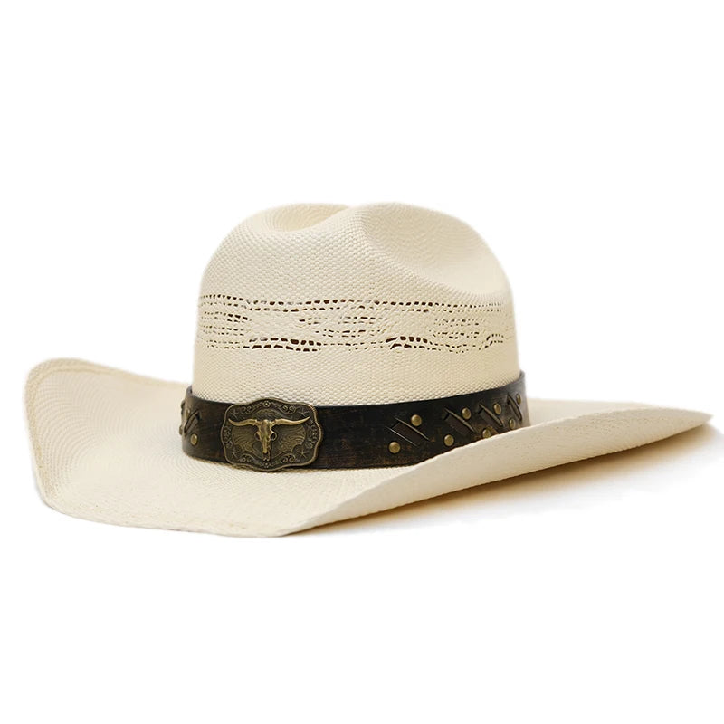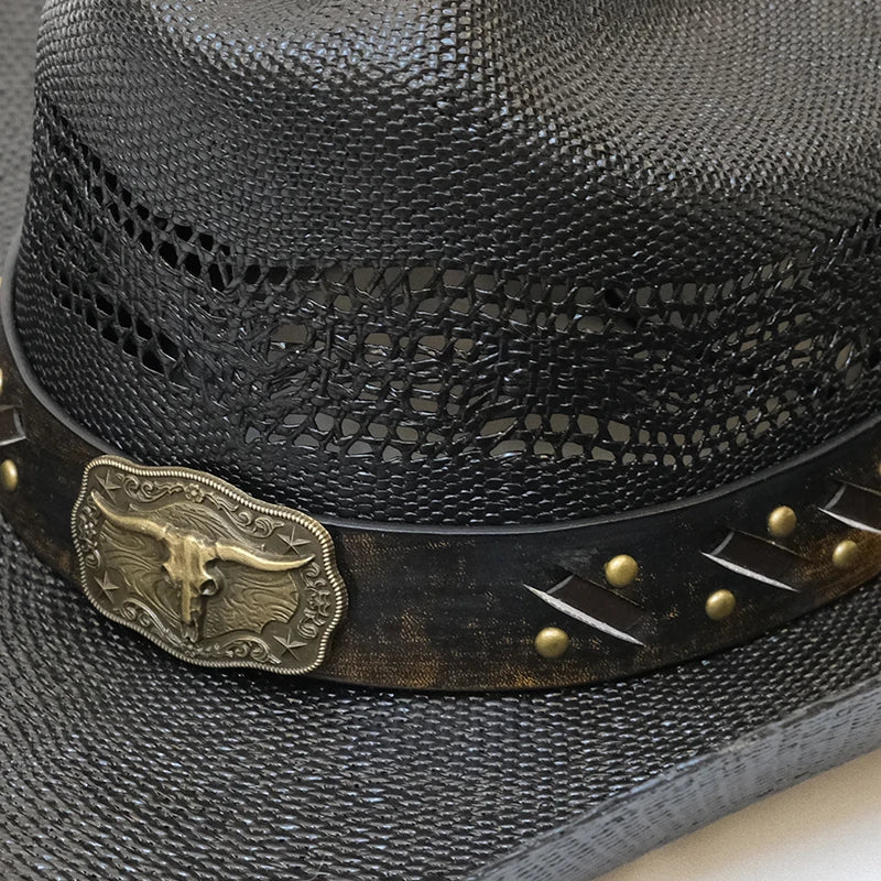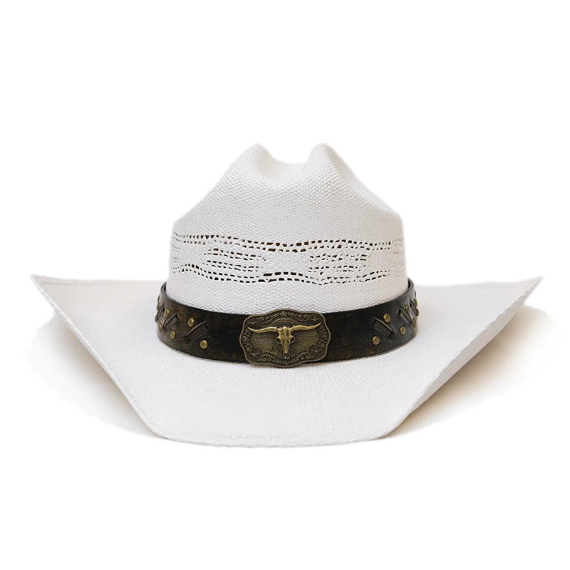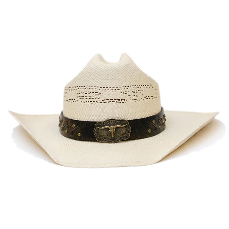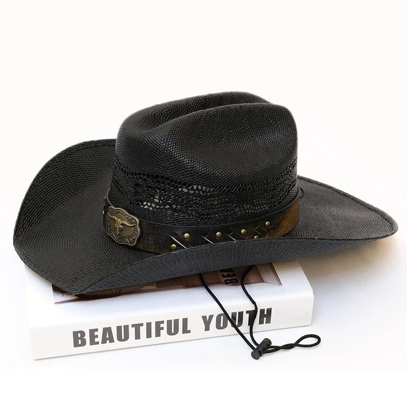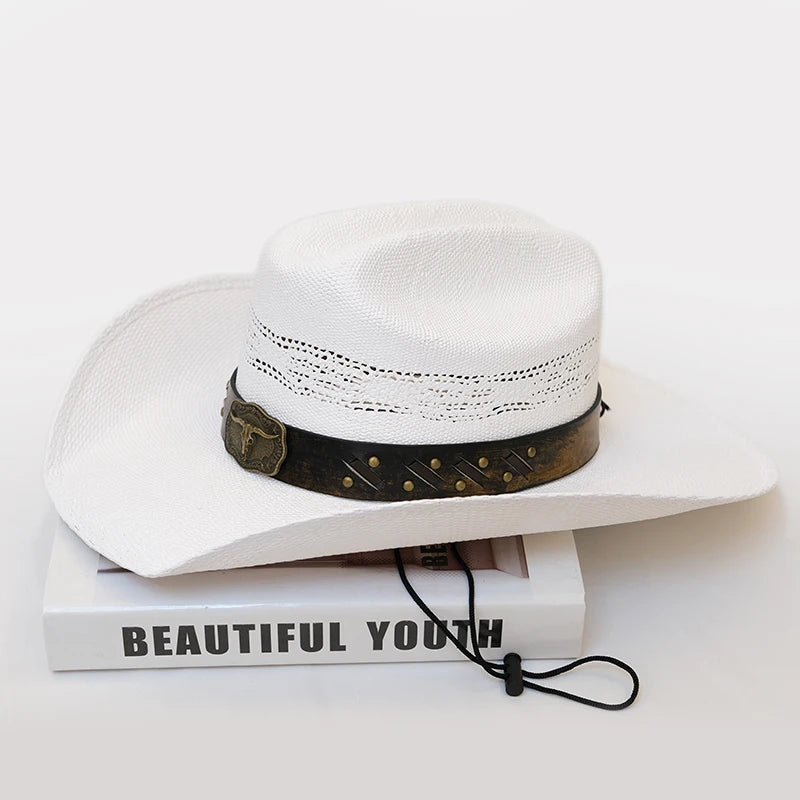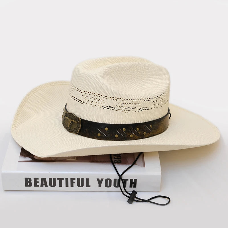 Retro Cow Head Leather Belt Hollow-out Hard Straw Wide Brim 55-61cm Cowboy Cowgirl Sun Hat