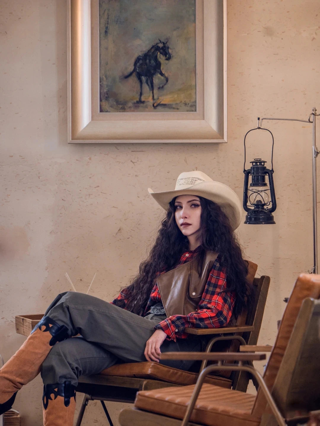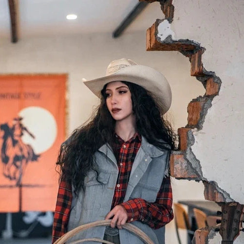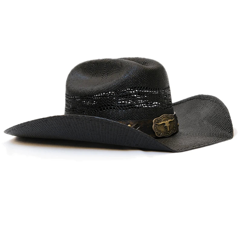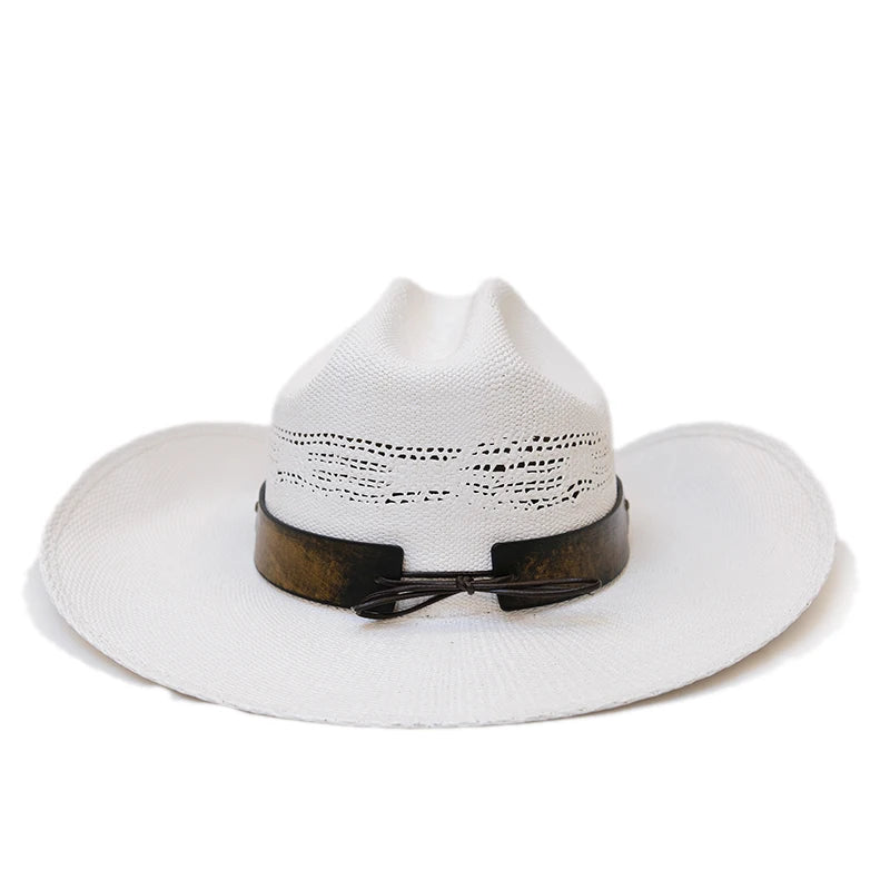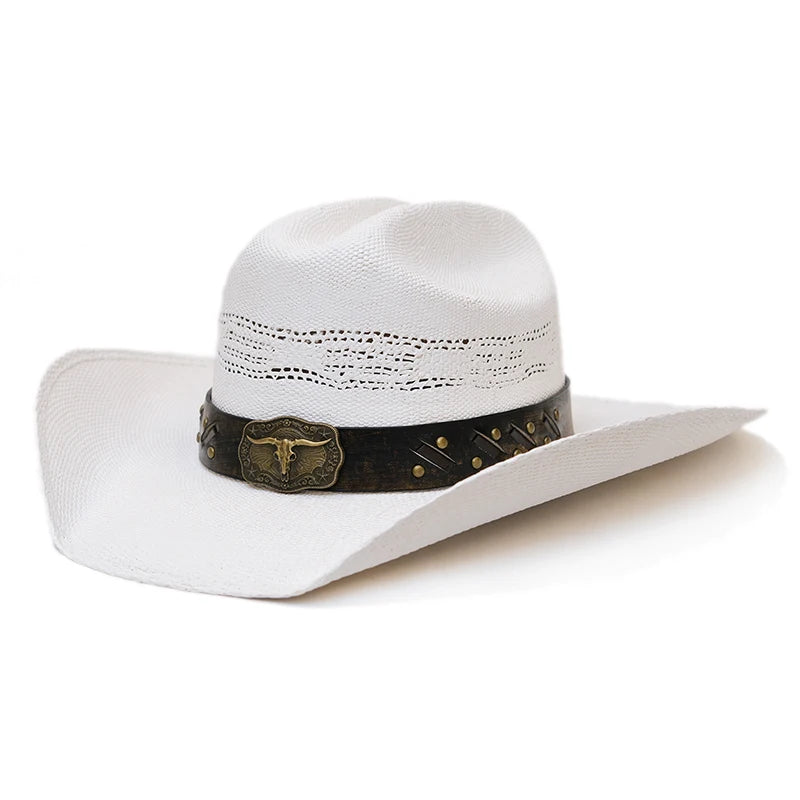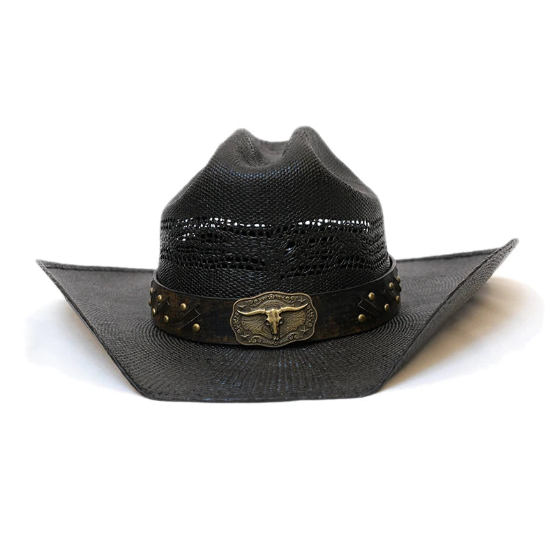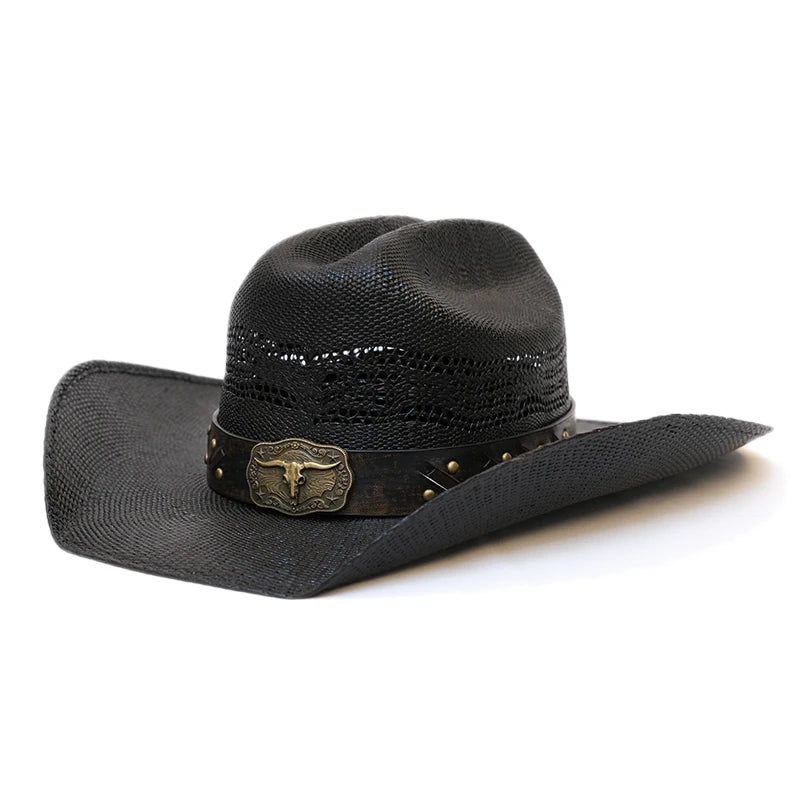 Retro Cow Head Leather Belt Hollow-out Hard Straw Wide Brim 55-61cm Cowboy Cowgirl Sun Hat