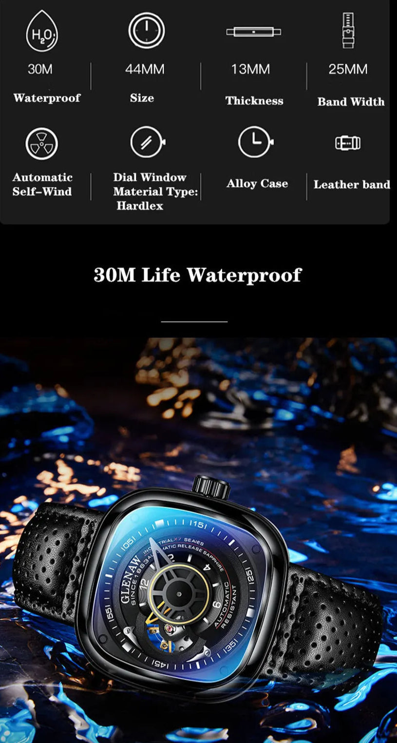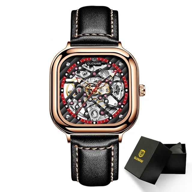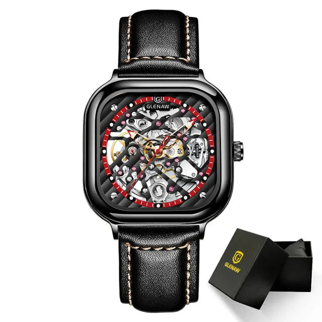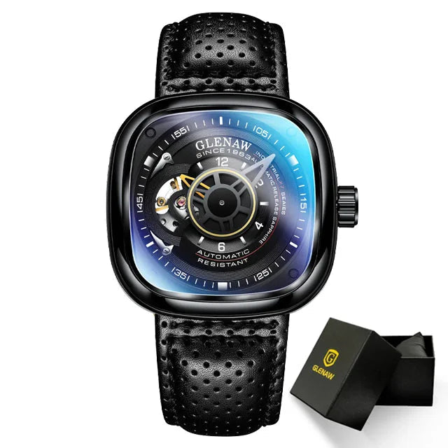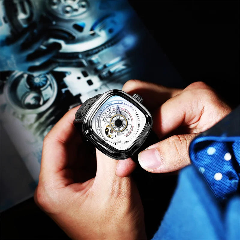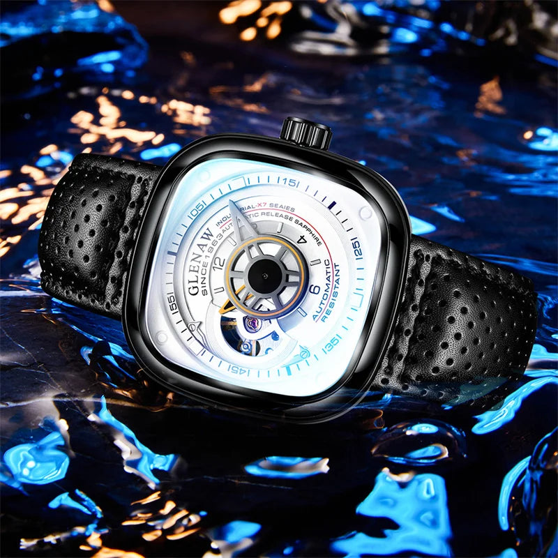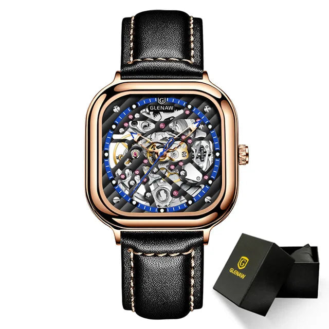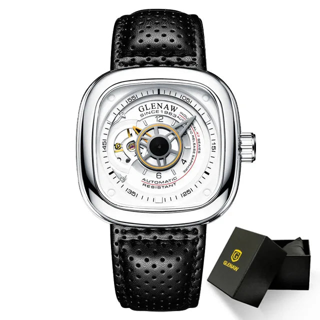 Perfect for business casual wear, this men's automatic watch has a square dial. The leather strap and stainless steel casing are durable and add a modern touch to the accessory. An elegant and stylish watch with shock-resistant and water-resistant construction. Buy now!