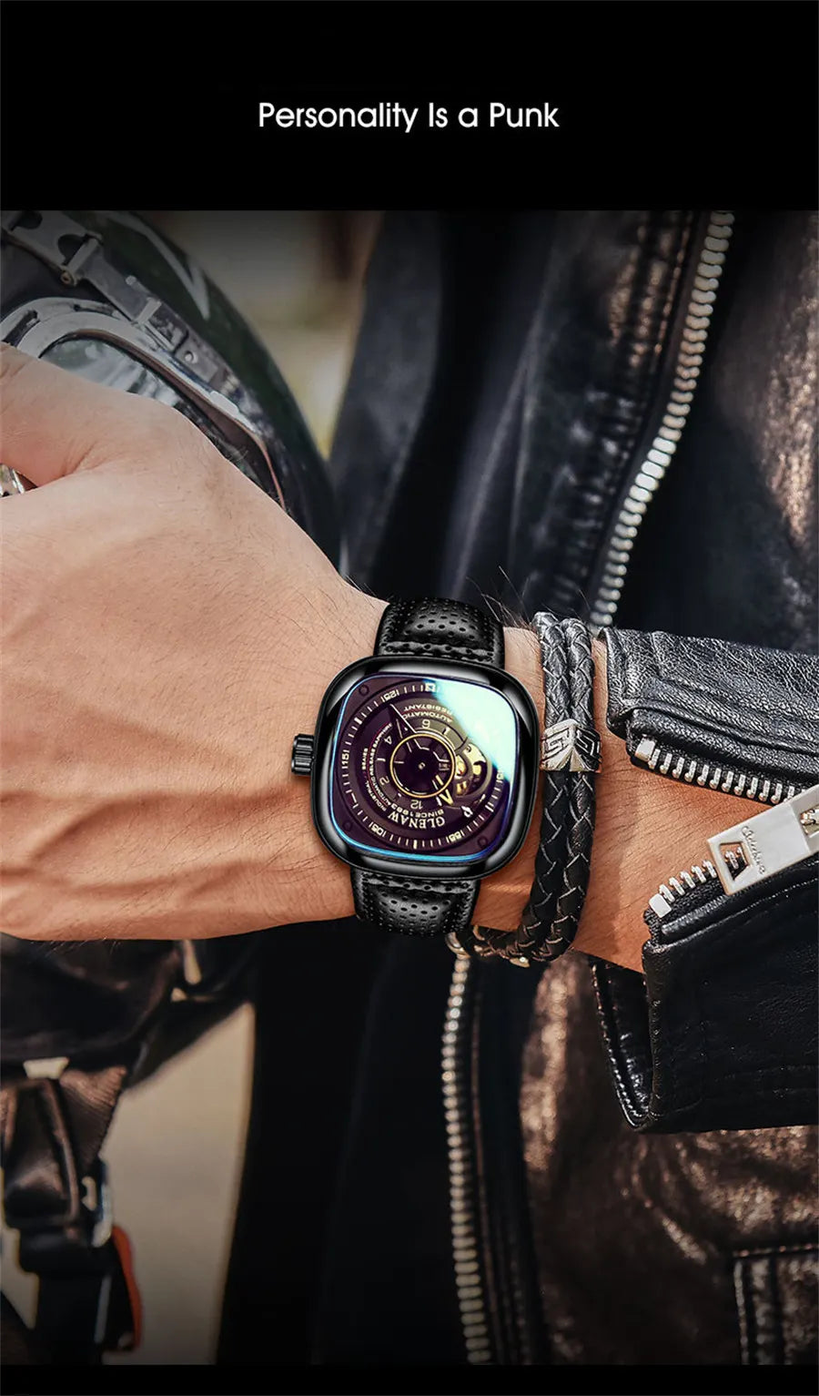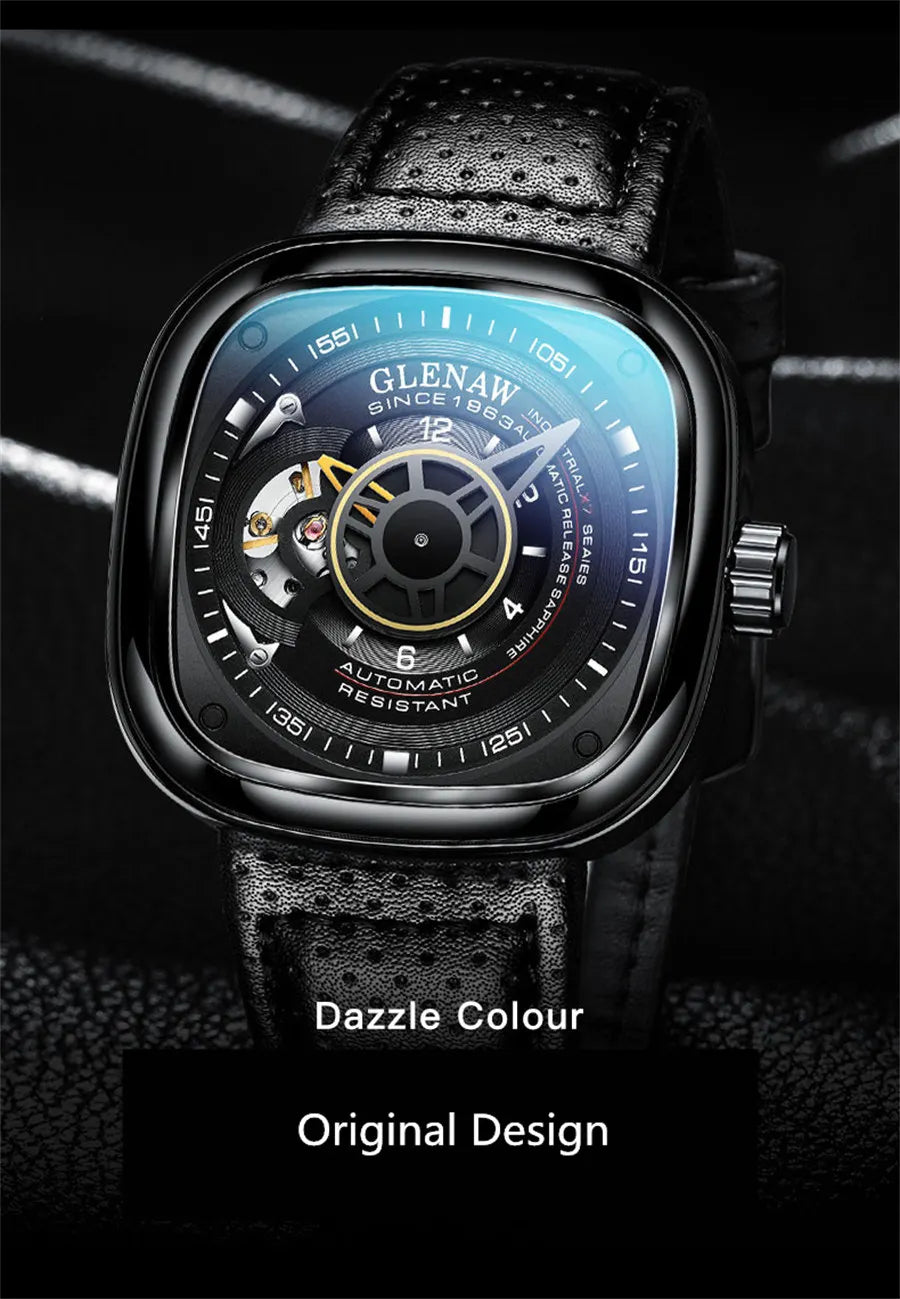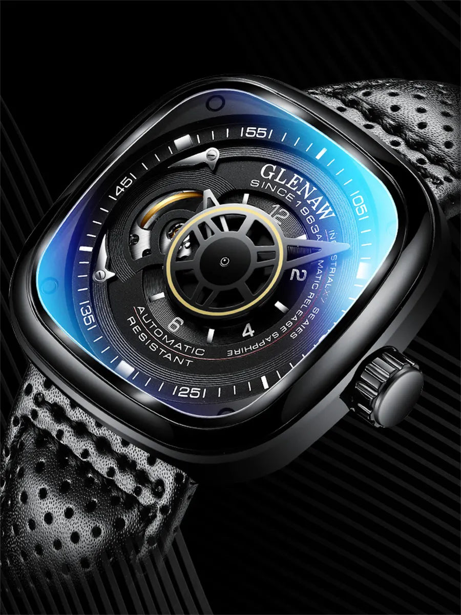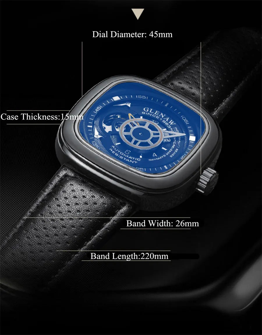 Perfect for business casual wear, this men's automatic watch has a square dial. The leather strap and stainless steel casing are durable and add a modern touch to the accessory. An elegant and stylish watch with shock-resistant and water-resistant construction. Buy now!