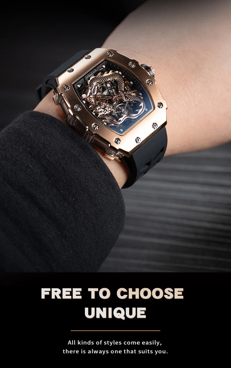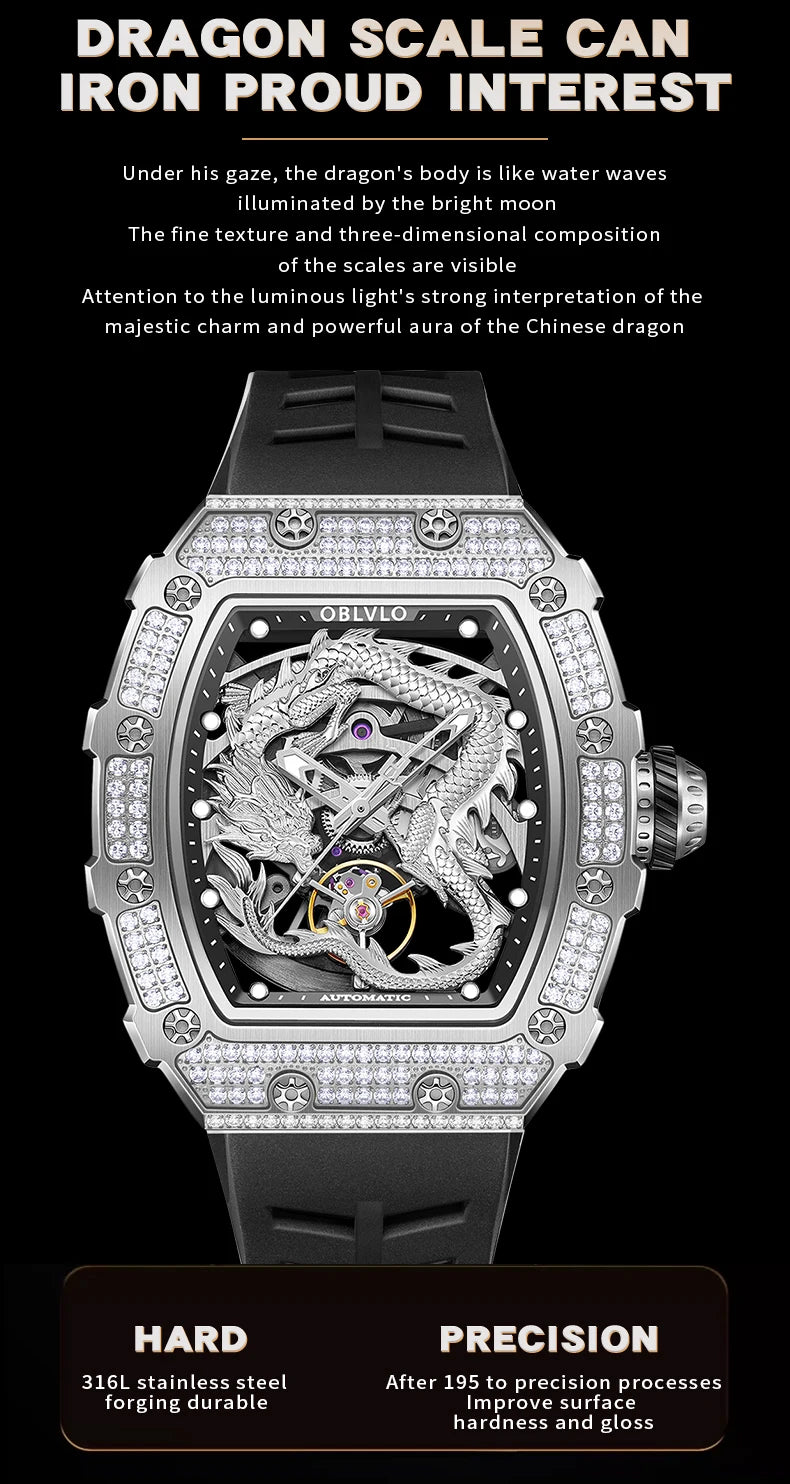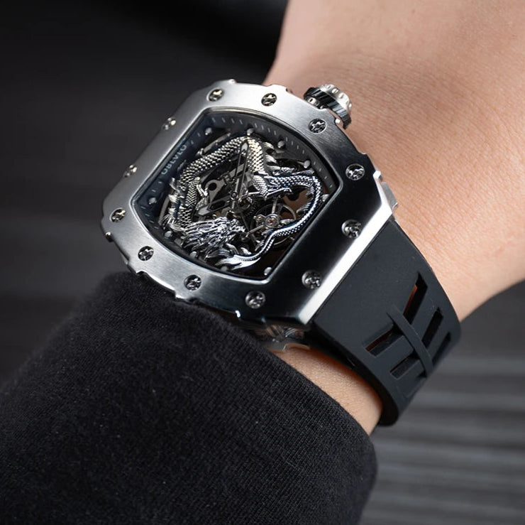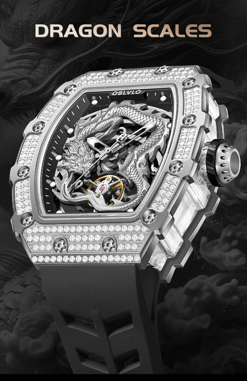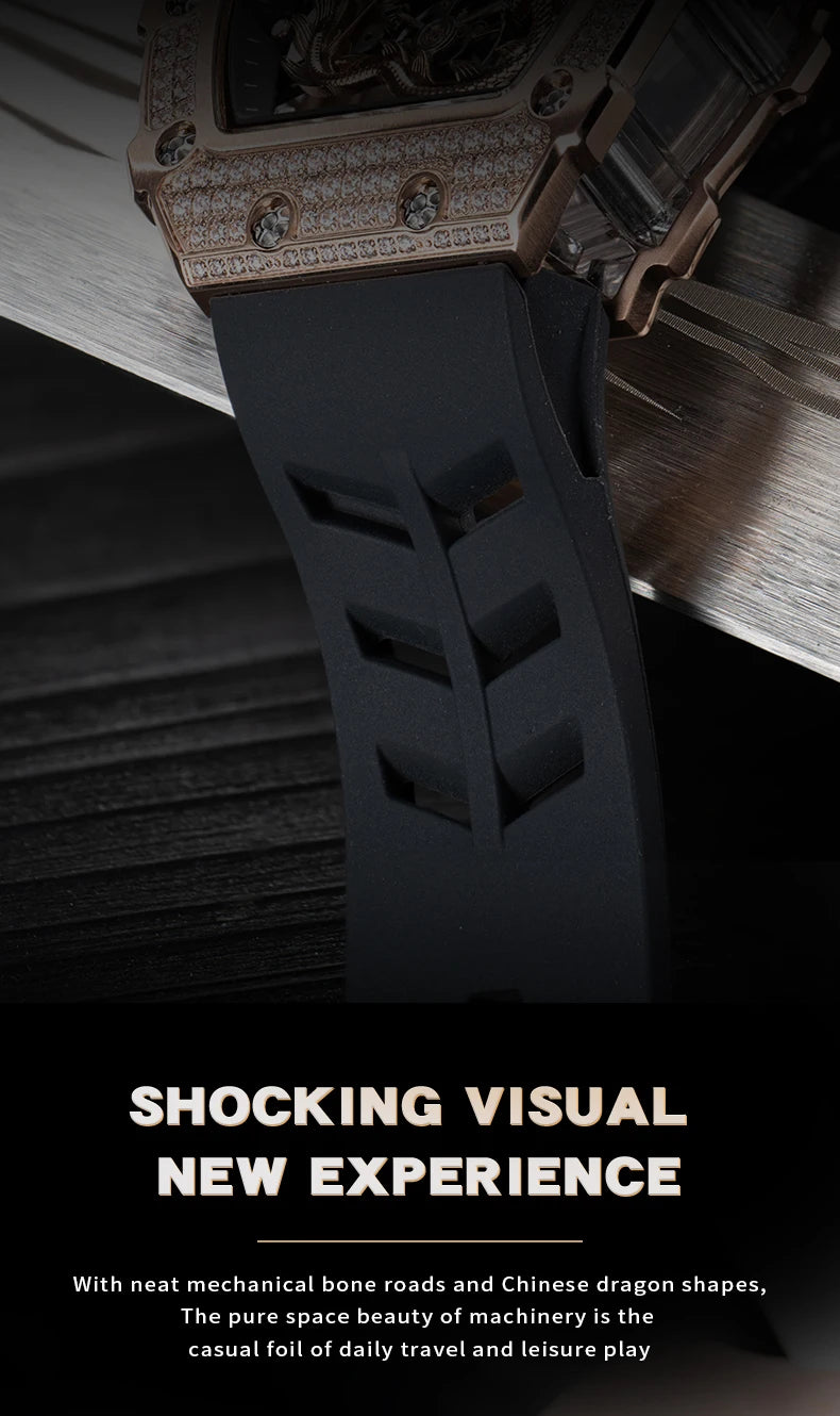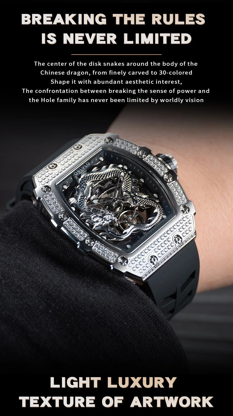 Men's Luxury Dragon Diamonds Tonneau Waterproof Automatic Mechanical Sports Watch