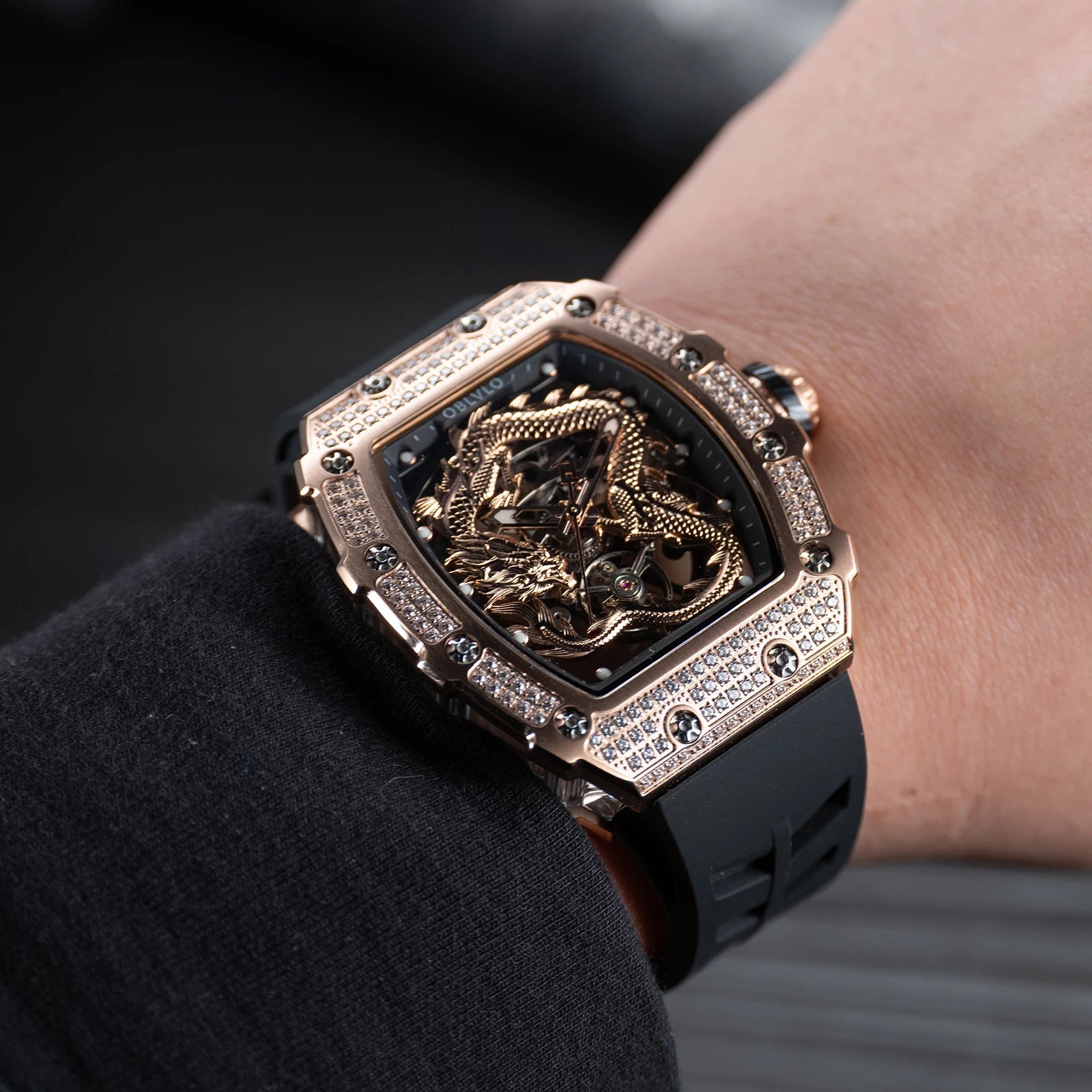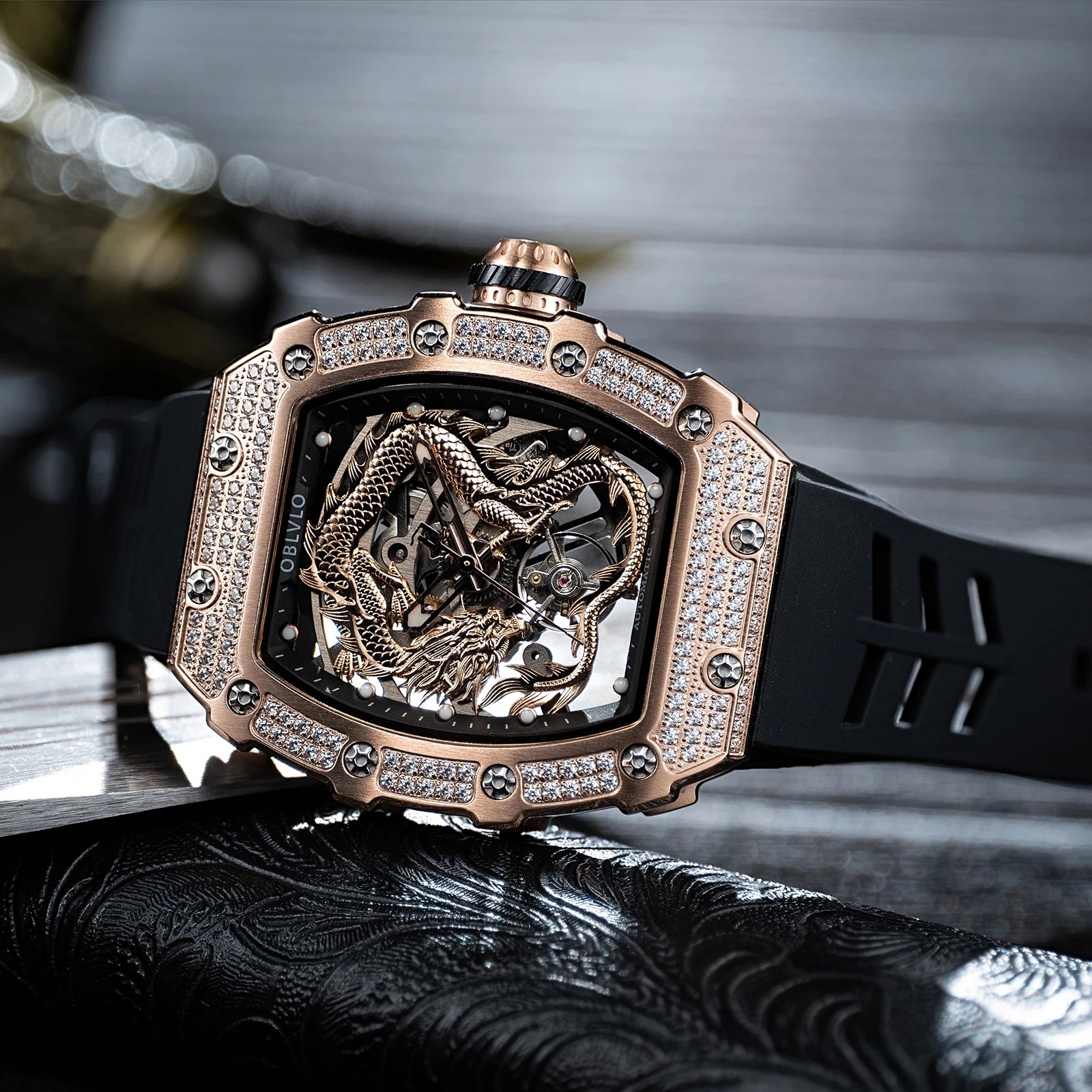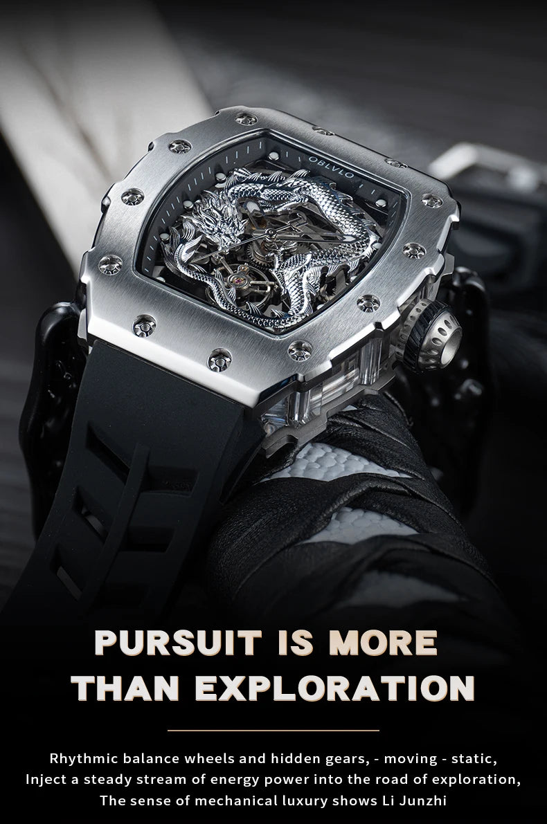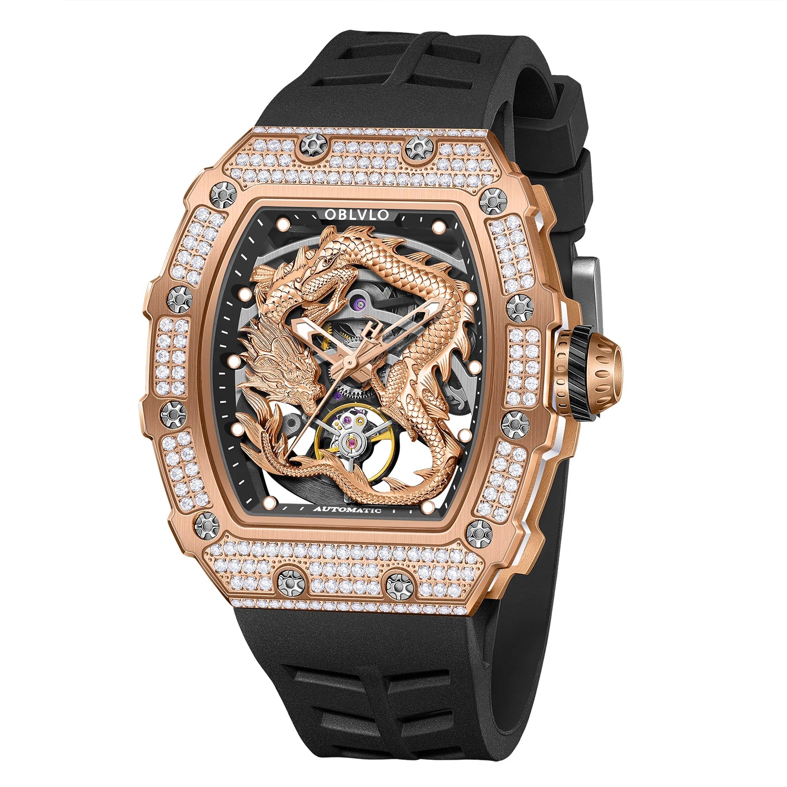 Men's Luxury Dragon Diamonds Tonneau Waterproof Automatic Mechanical Sports Watch