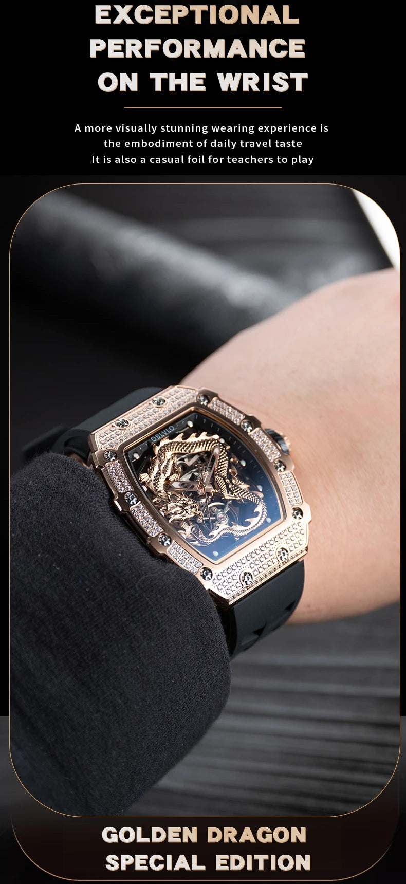 With a lovely dragon design, diamond decor and Tonneau dial, this striking men's watch has the power to notch up your look. The rubber strap and stainless steel casing are durable and add a modern touch. Being water resistant, it is more functional. Quality, perfect craftsmanship and the unique look make this watch a great accessory!