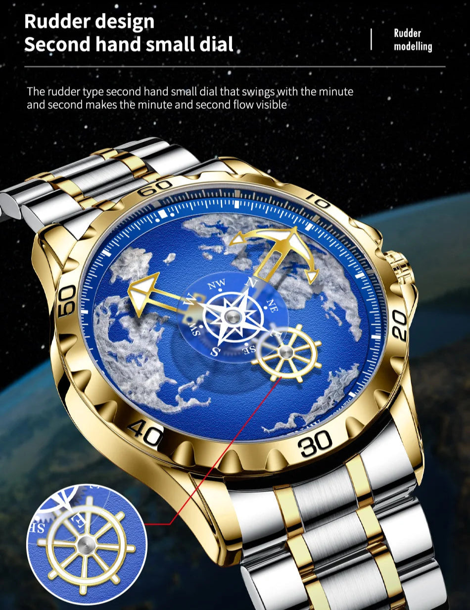 Complementing any outfit effortlessly, this fantastic men's watch will elevate your style. With a stainless steel strap and casing, it is durable and looks appealing. The dial is designed with the Earth pattern and the watch needle is designed in a nautical theme. Designed with waterproof and shock resistant construction, complete calendar and week display, this watch is more than just a fashion accessory. Order now!