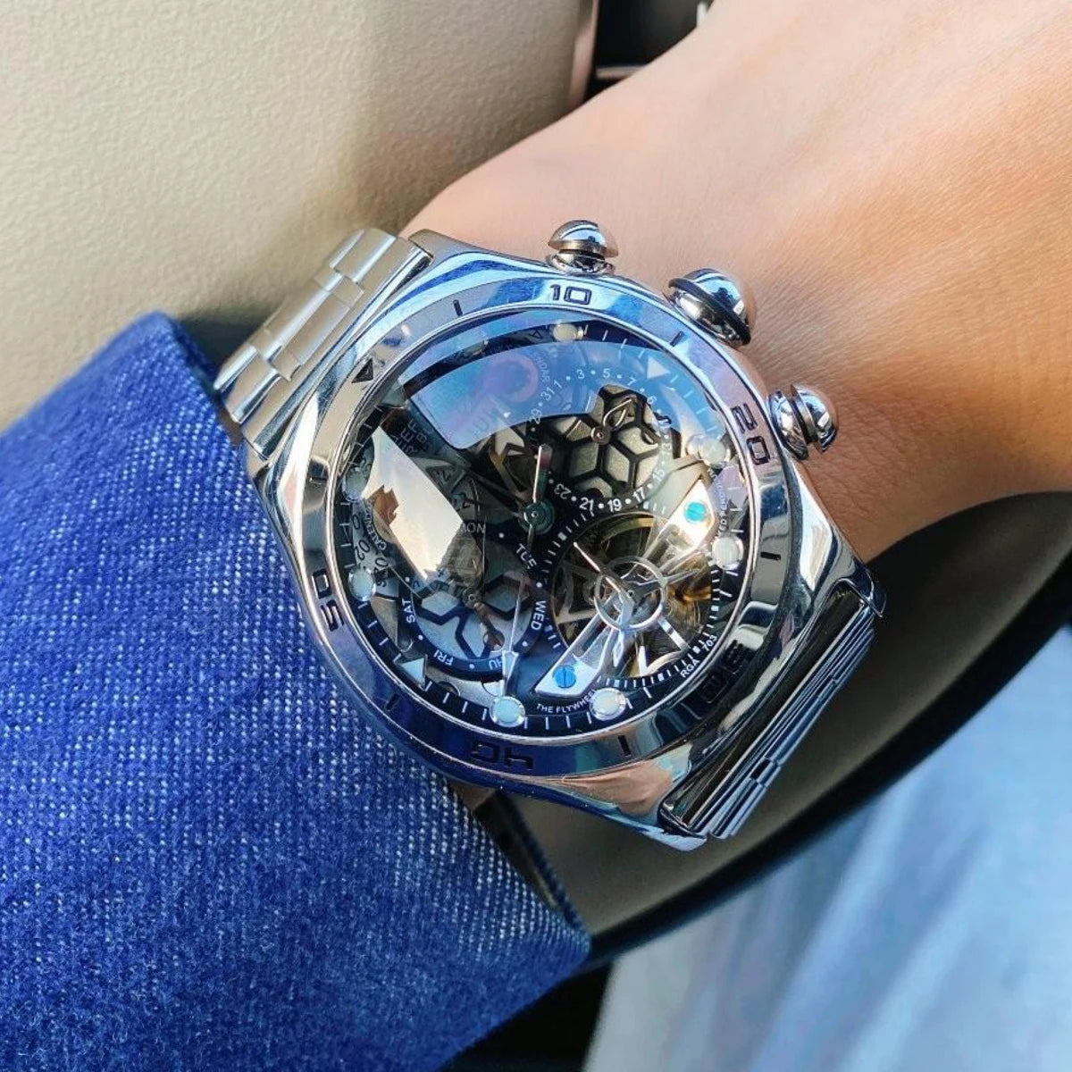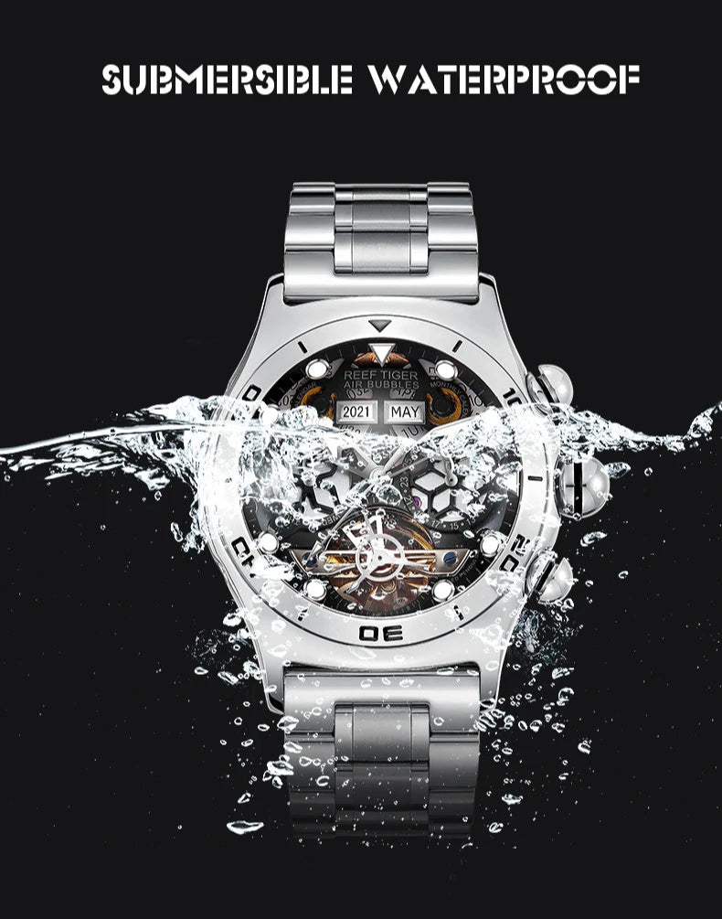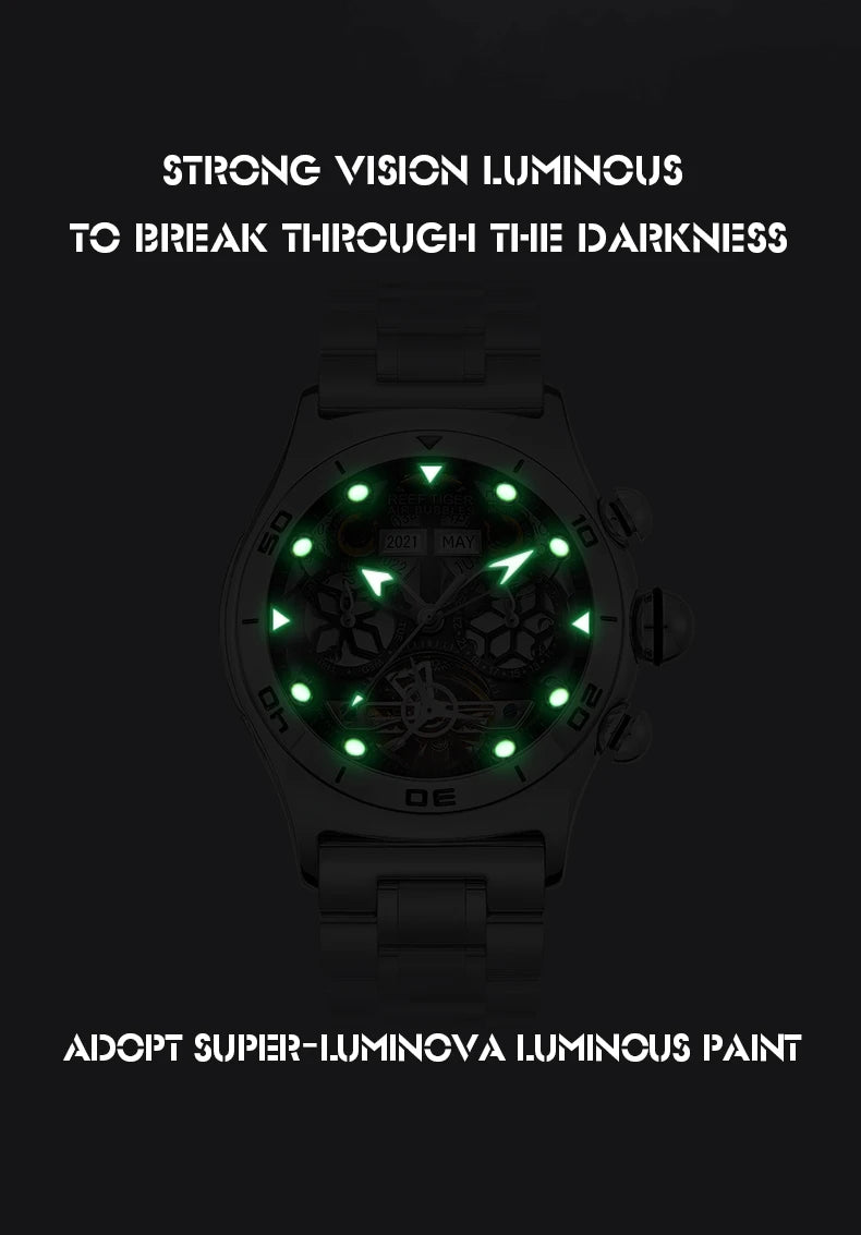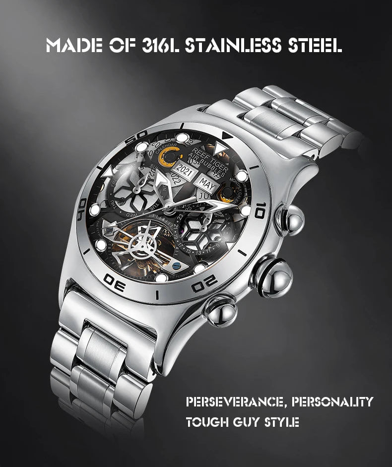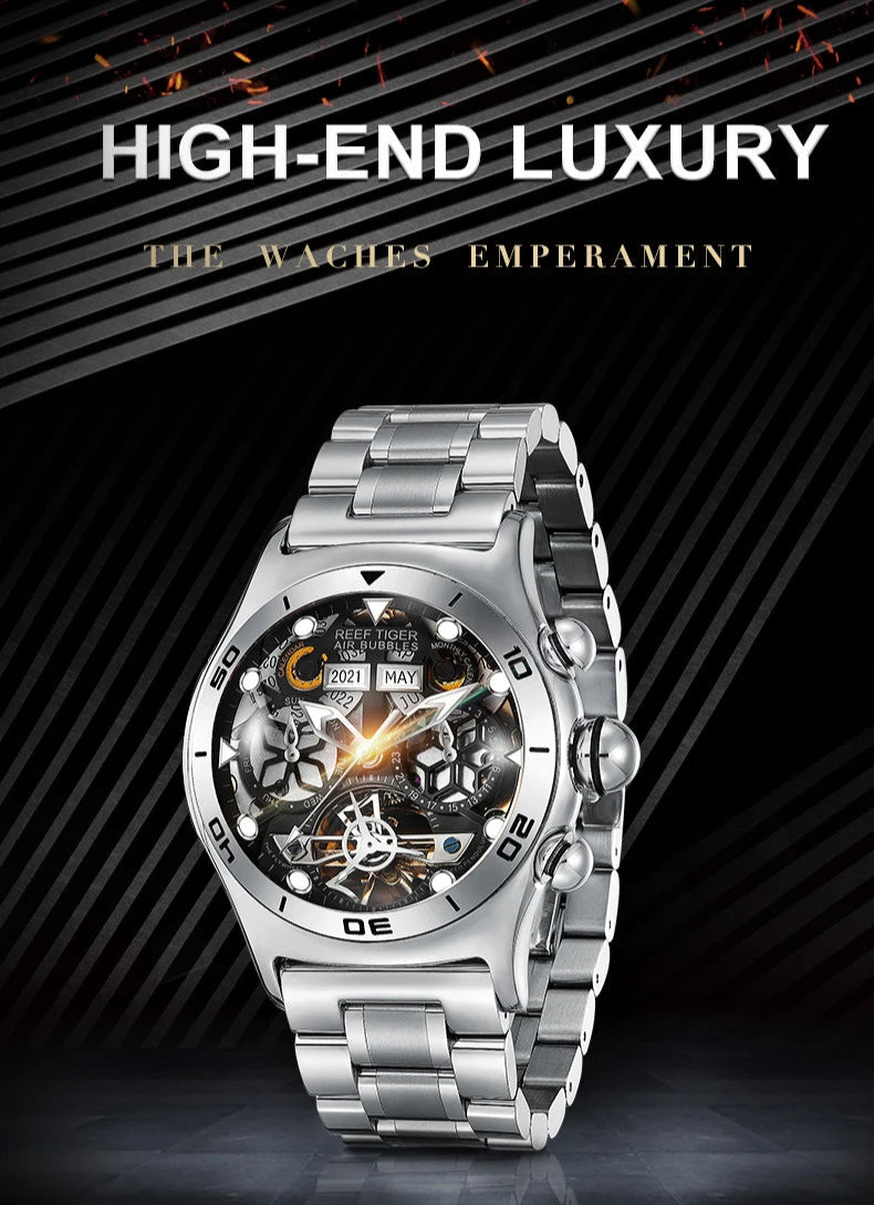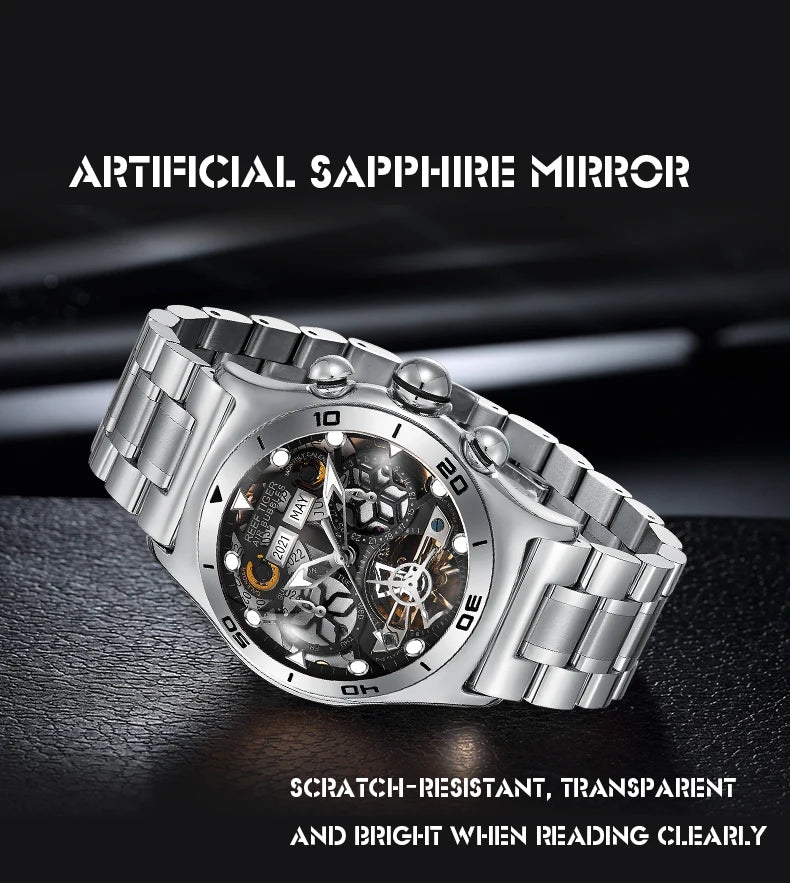 Men's Skeleton Automatic Luminous Display Completed Calendar Stainless Steel Bracelet Sports Watch