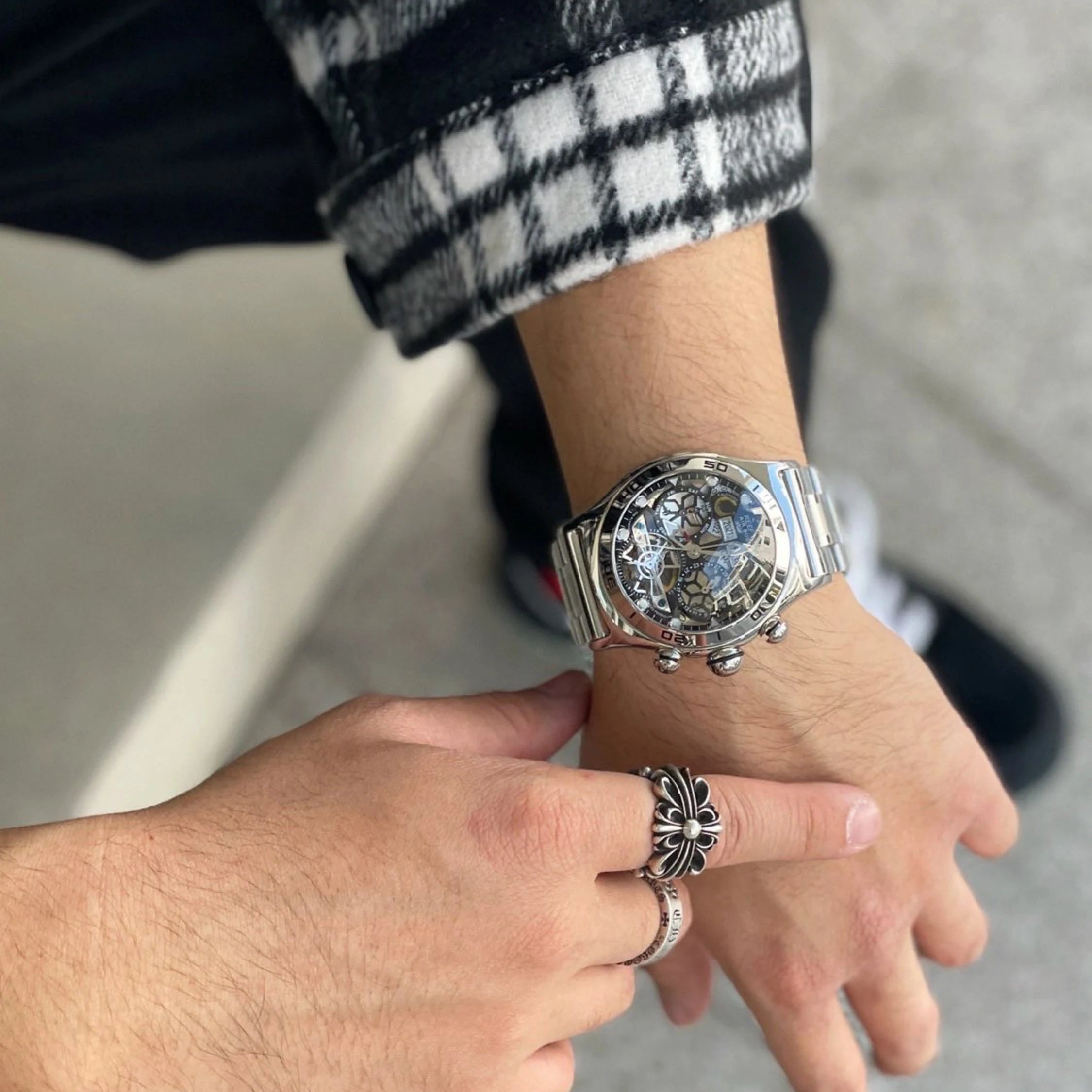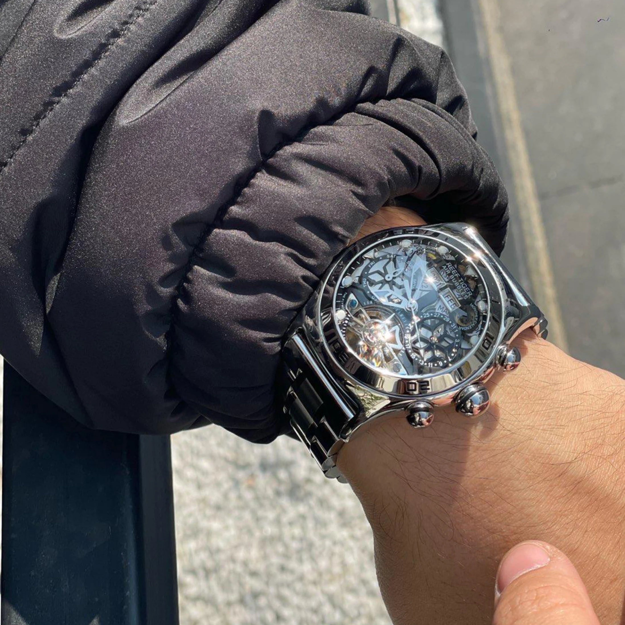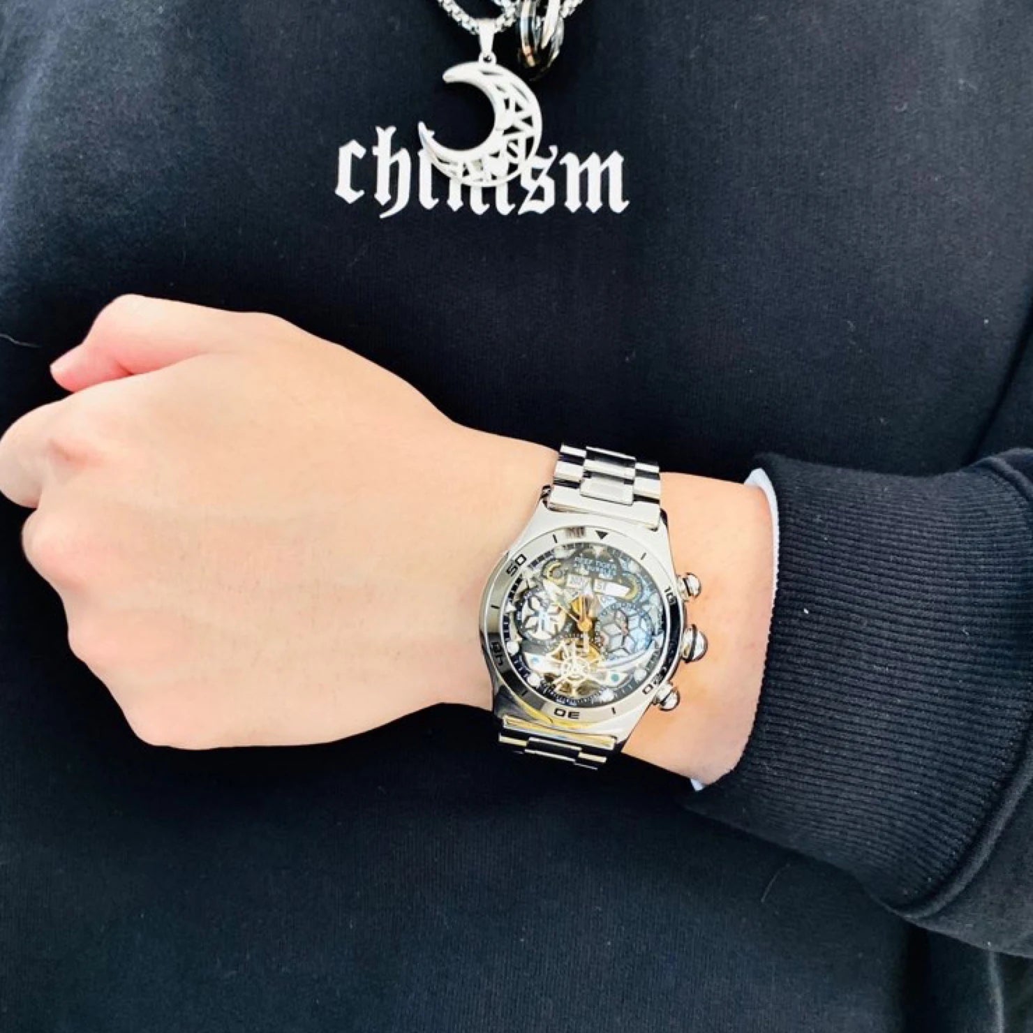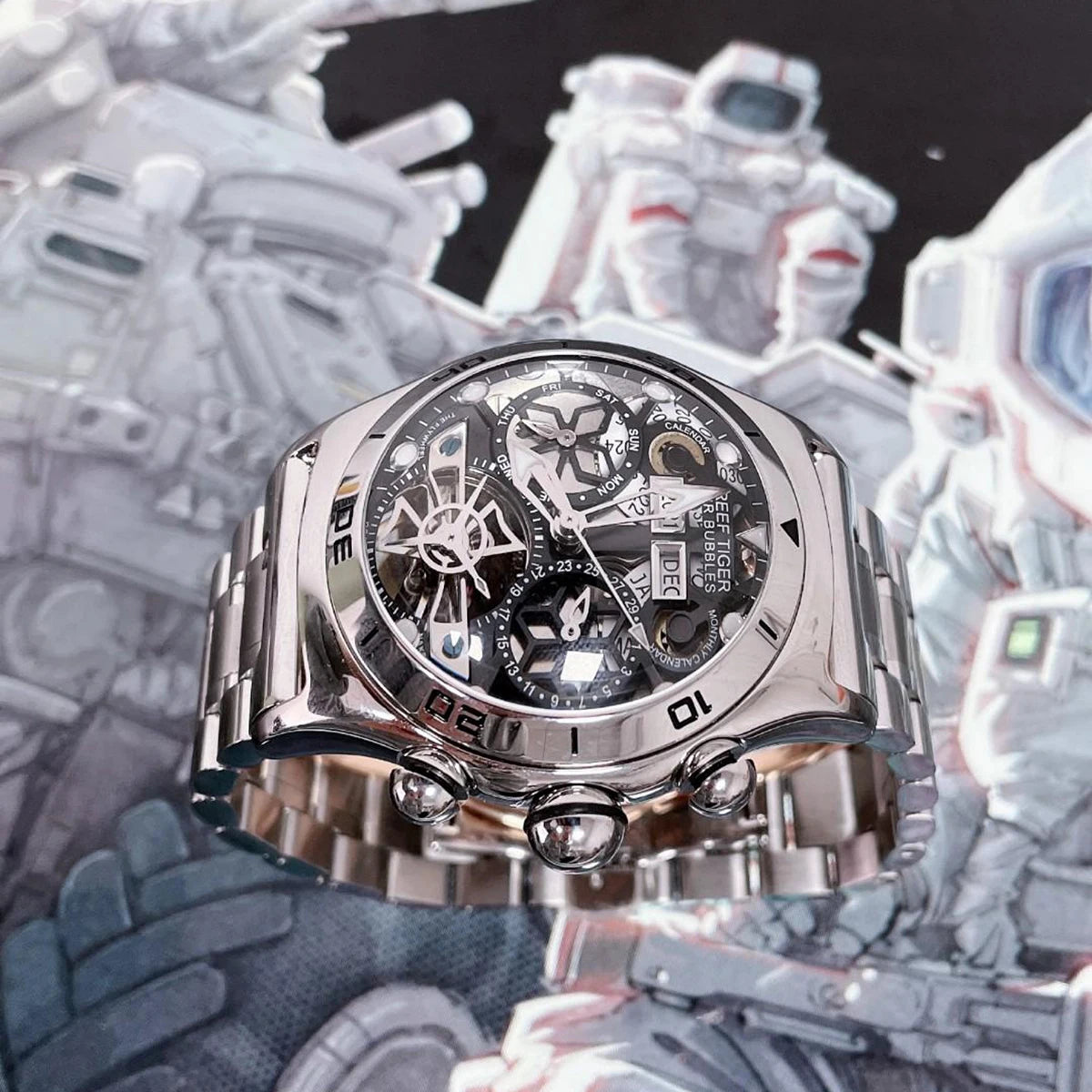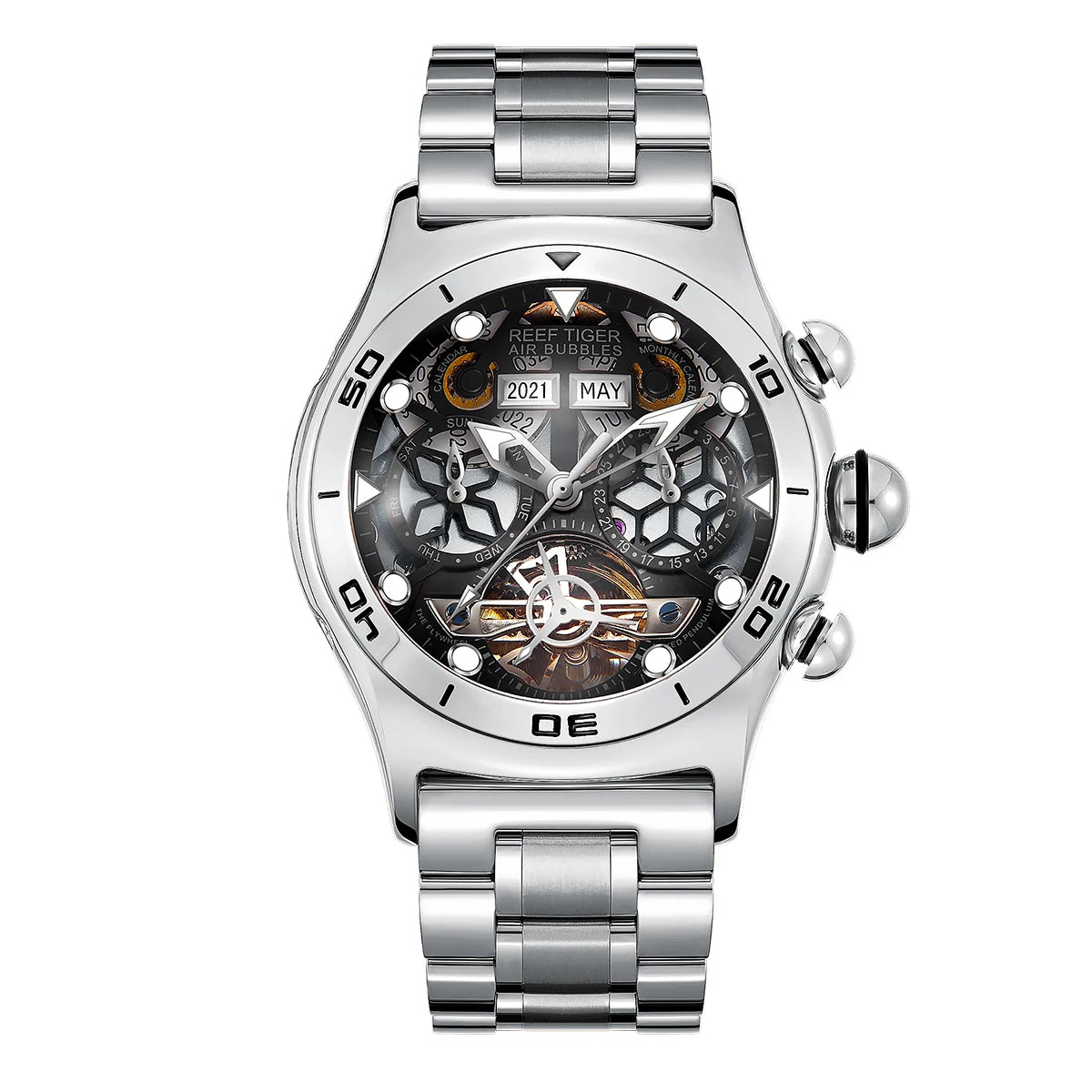 Men's Skeleton Automatic Luminous Display Completed Calendar Stainless Steel Bracelet Sports Watch