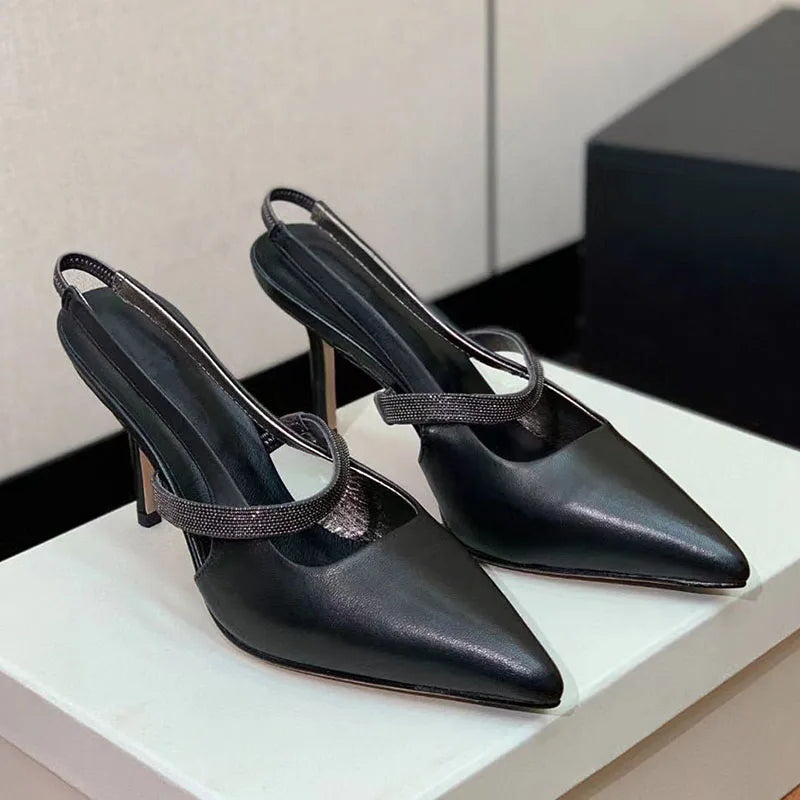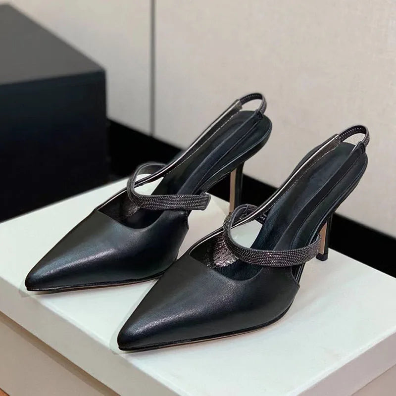 Women's 9cm High Heels Pointed Toe Slingback Black Leather Runway Pumps