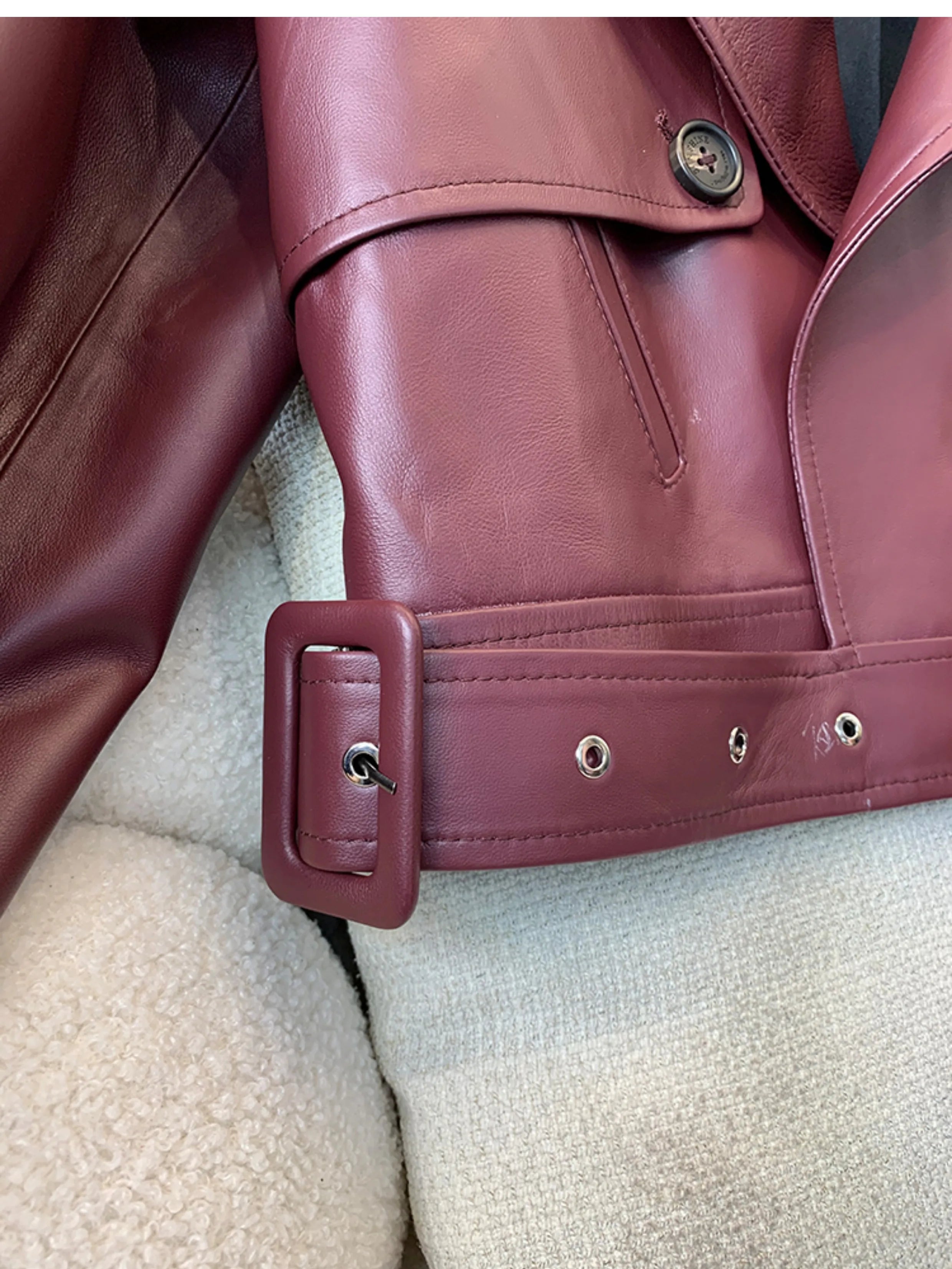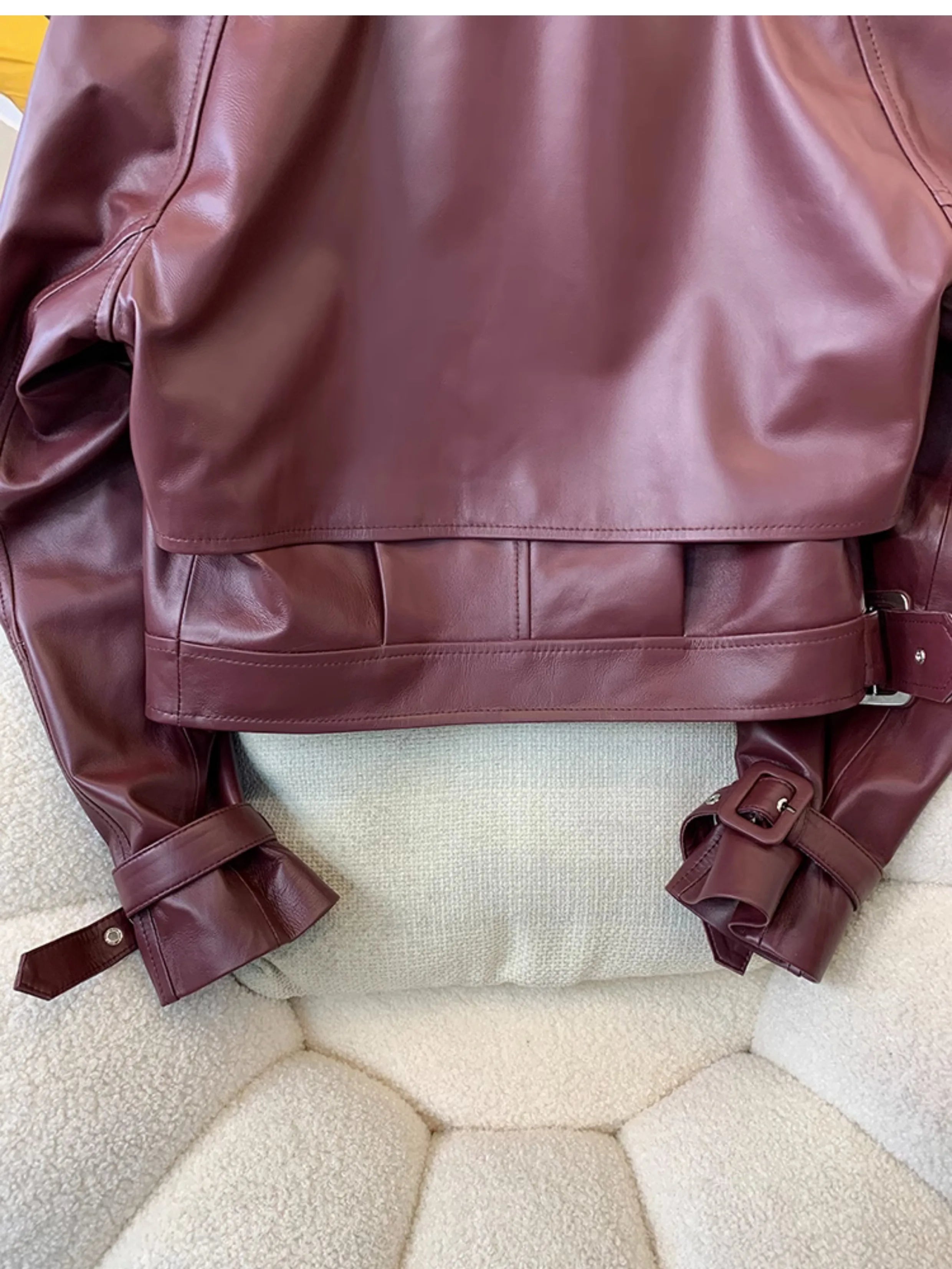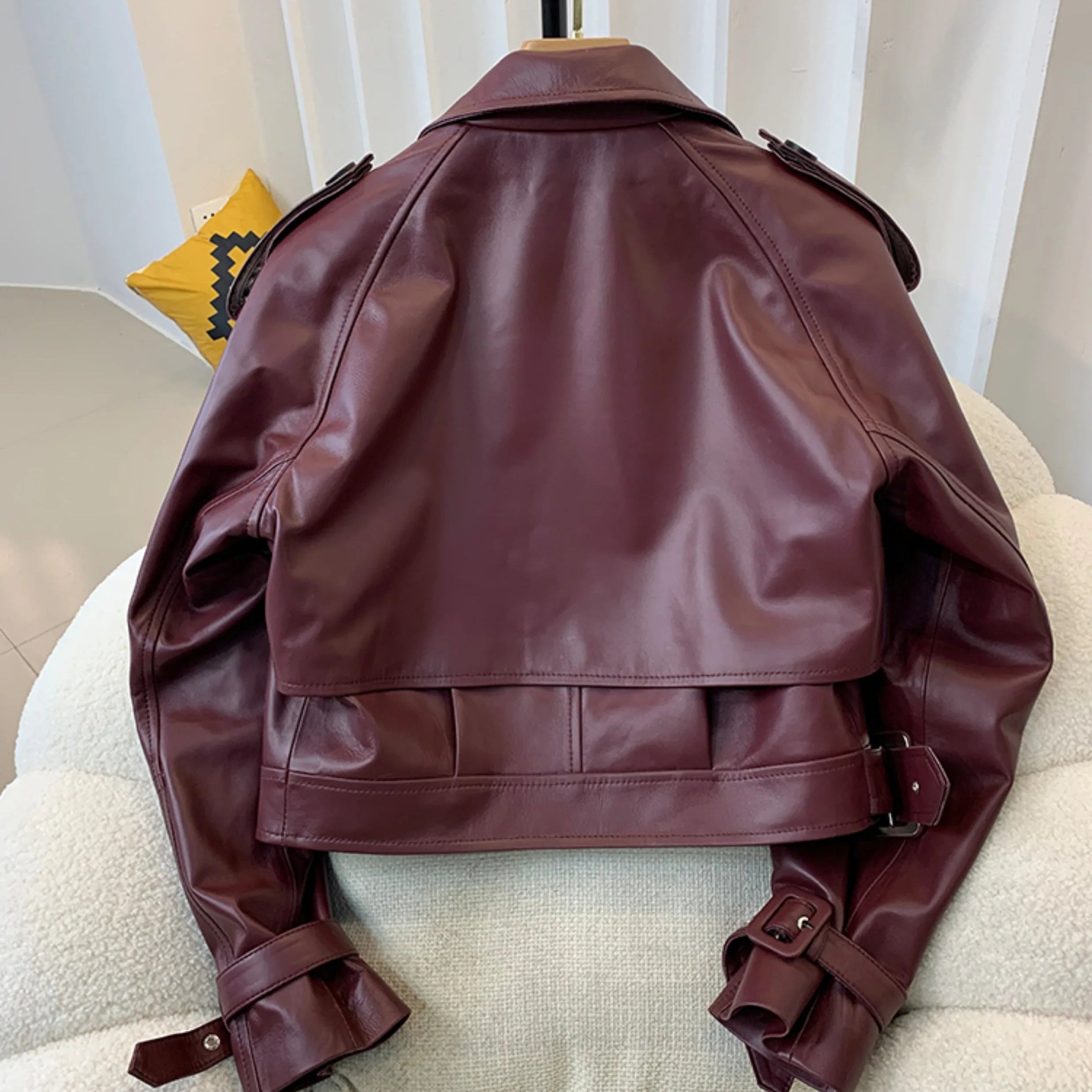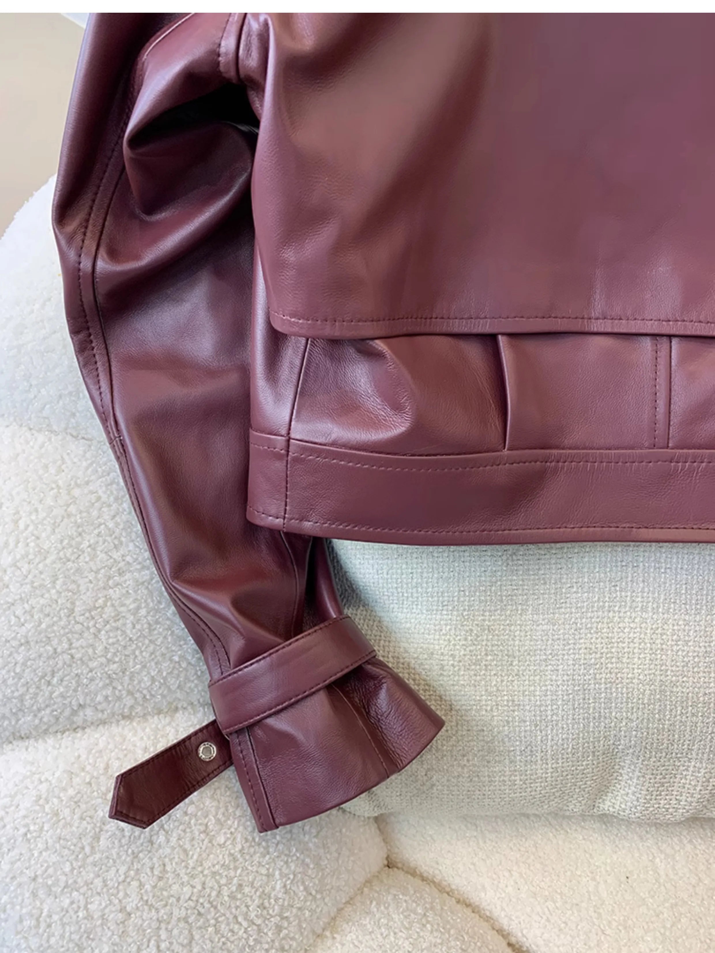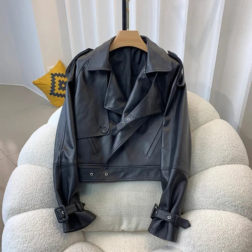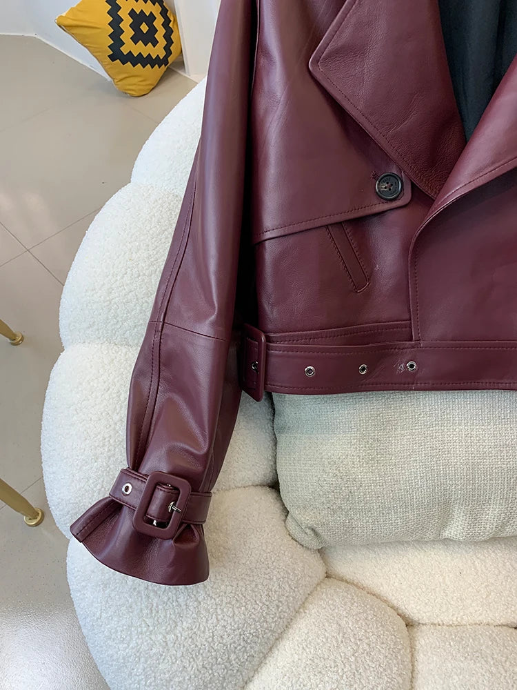 If you are looking for a spectacular women's jacket, then this is for you. Designed with genuine leather, offering both durability and style, this short jacket has a irregular placket pattern and belted sleeves that make it unique. Comfortable and stylish, grab yours to enhance your wardrobe!
