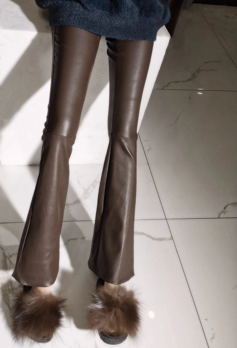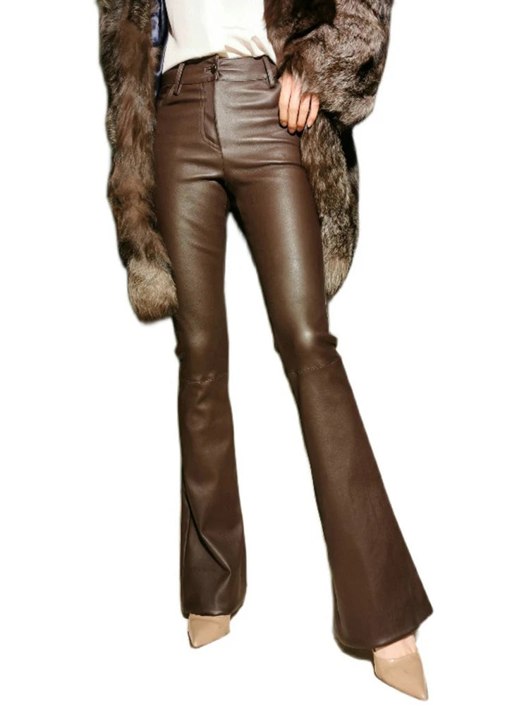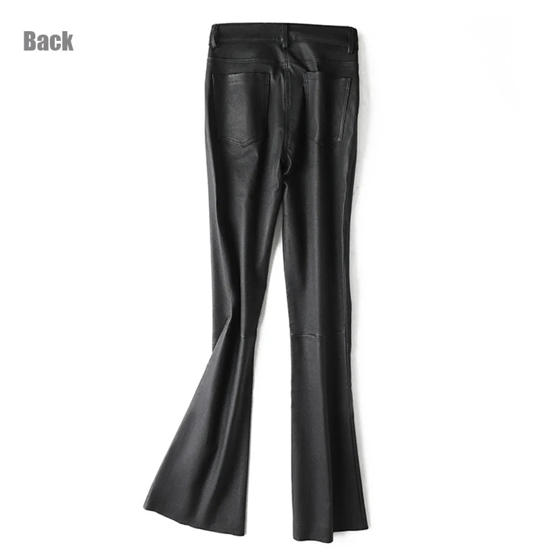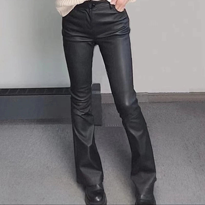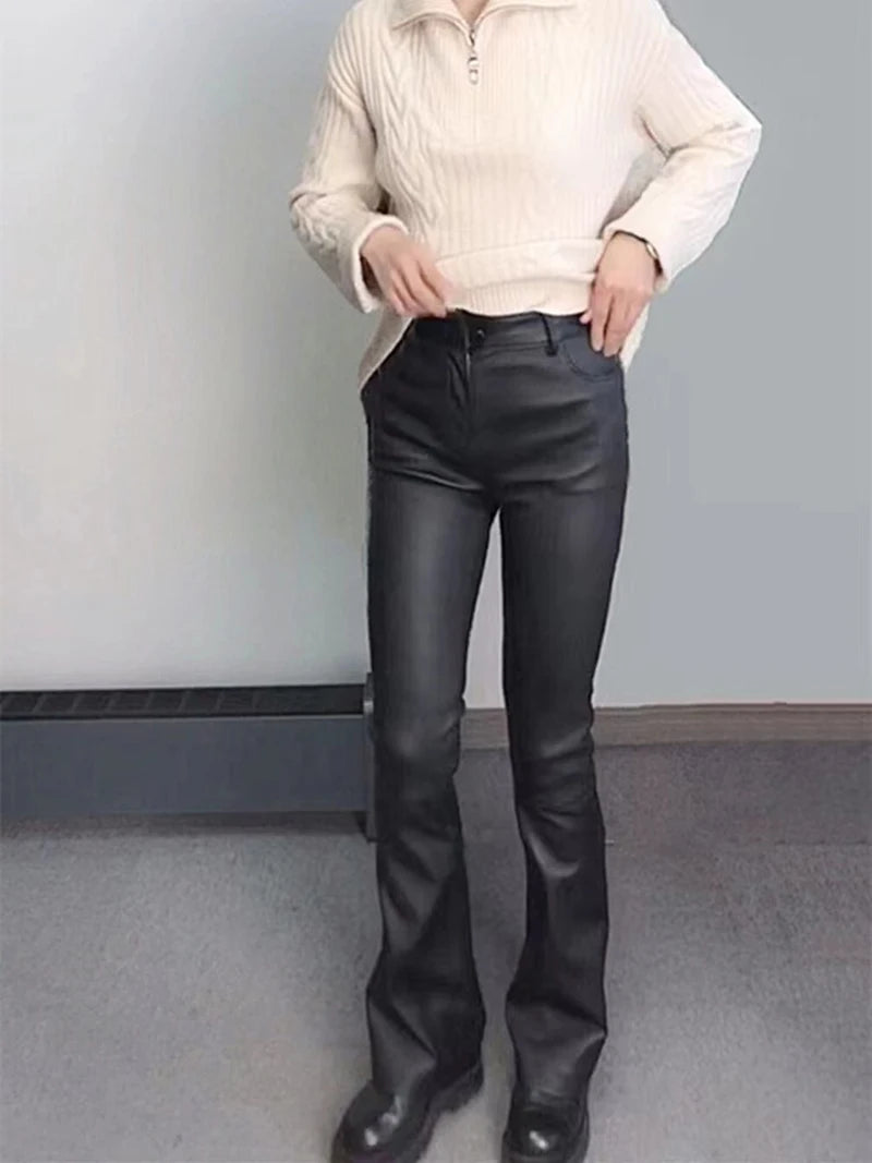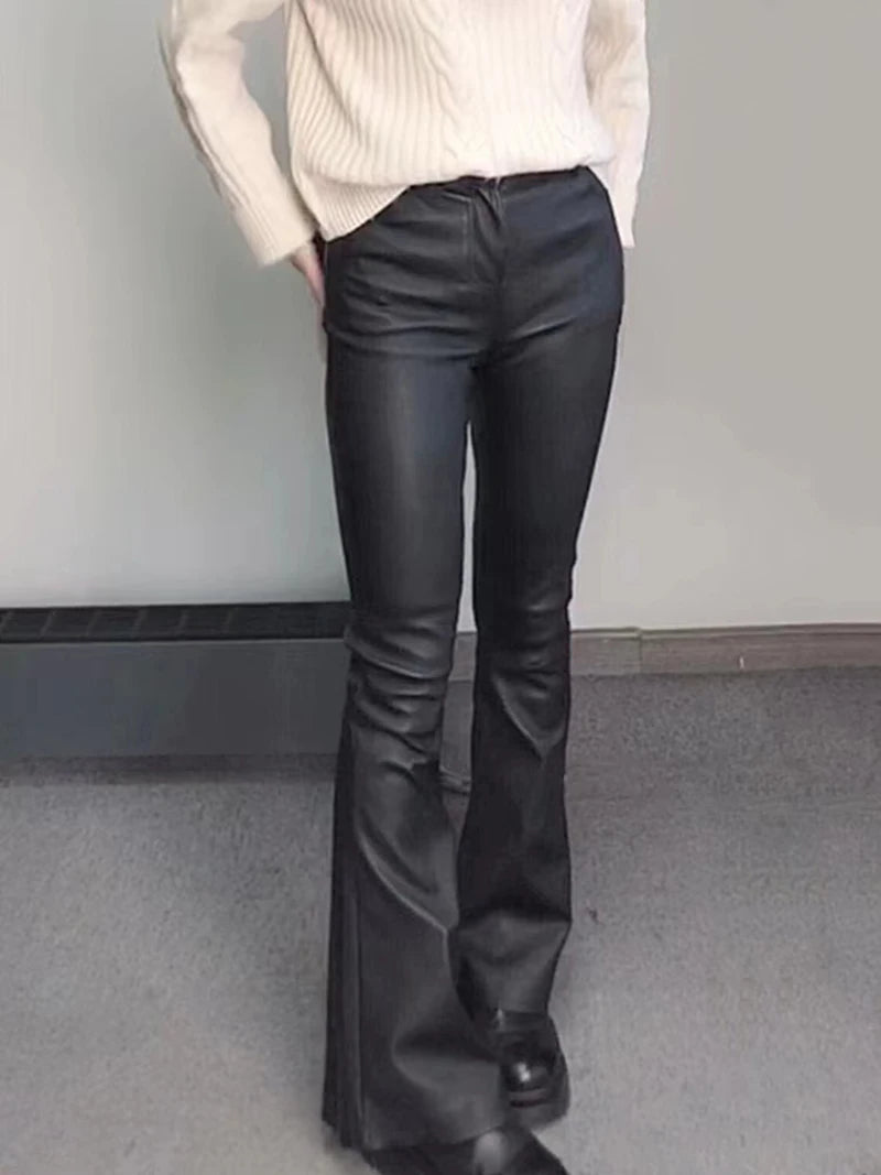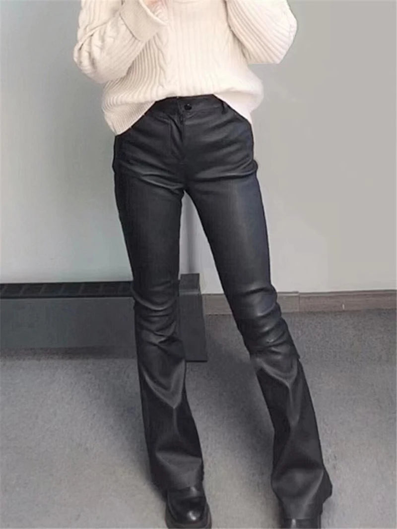 Women's Autumn Winter Mid Waist Skinny Flared Stretch Leather Pants